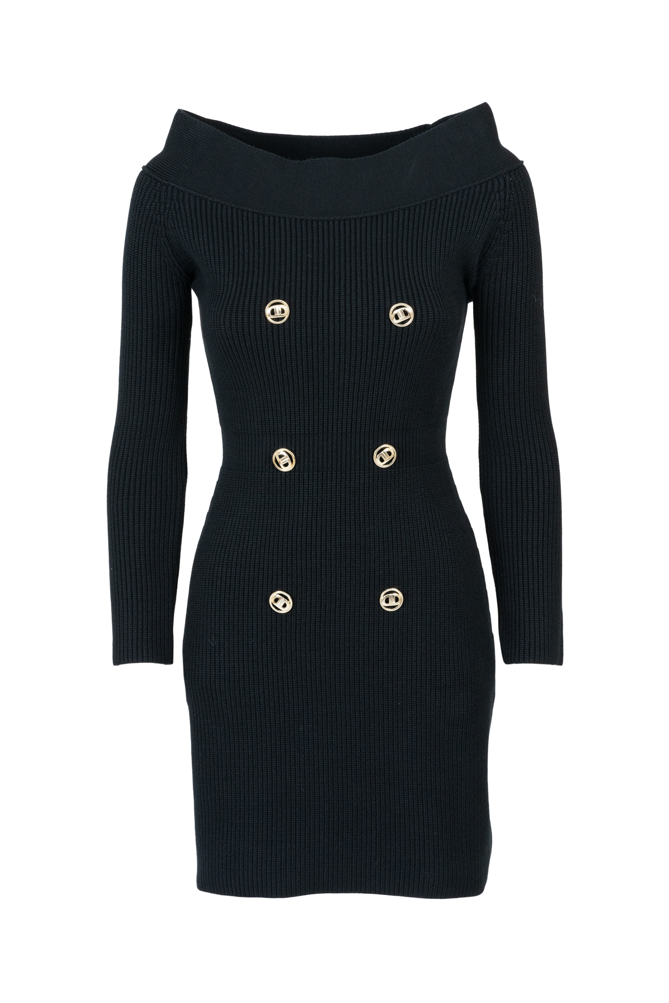 abito in maglia stretch, costine, con scollo a barca, e bottoni