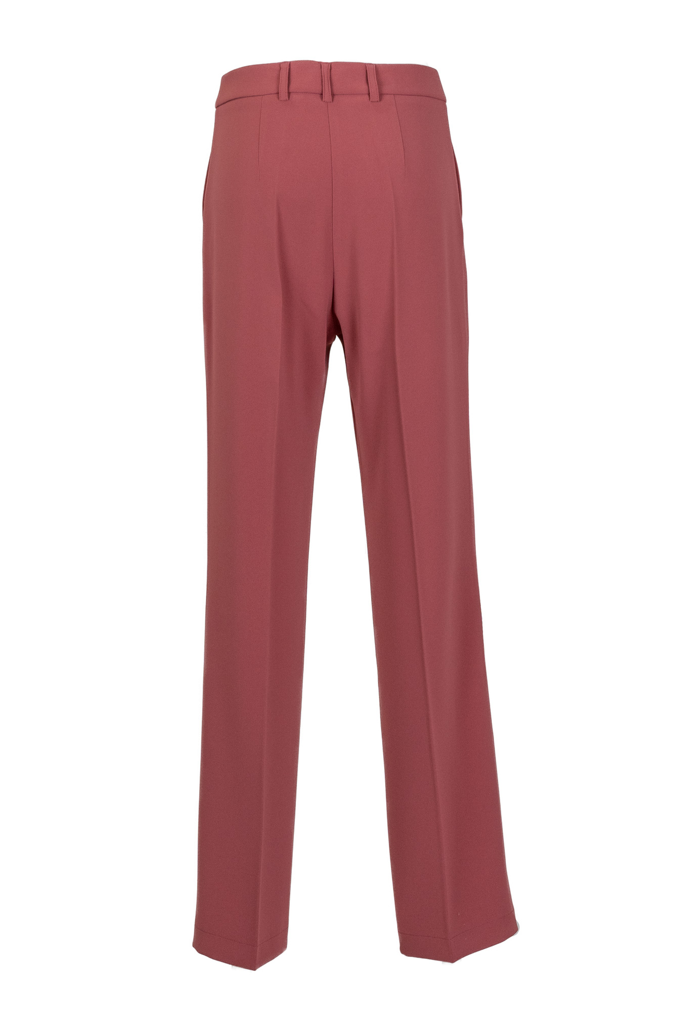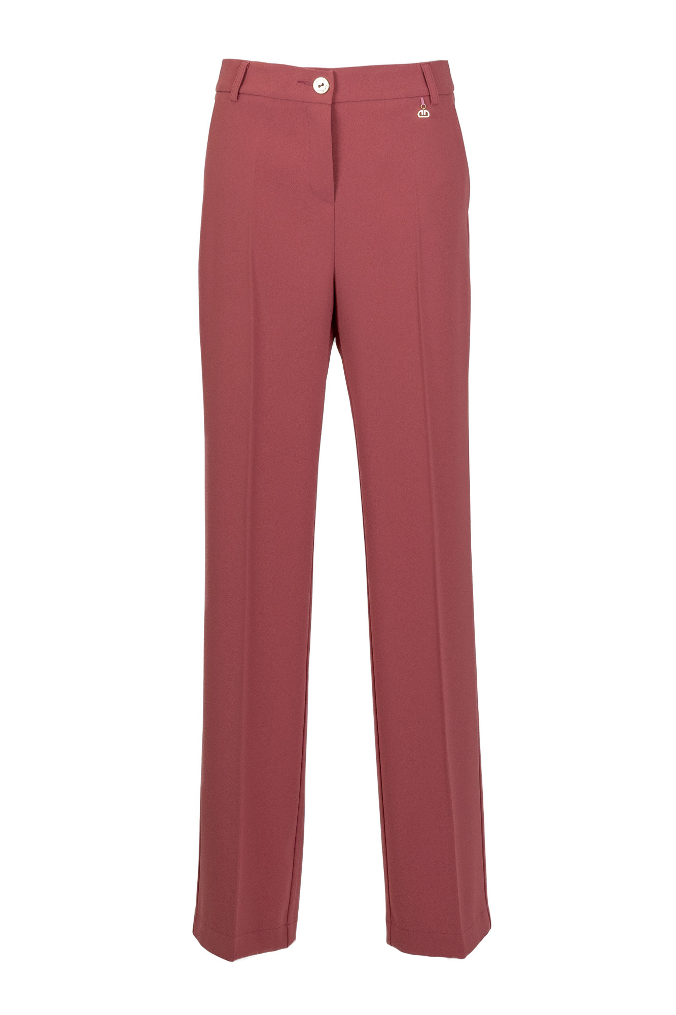 Pantalone a vita alta, passanti in vita, chiusura con bottone dorato metallico e zip, gamba dritta con stiratura centrale.