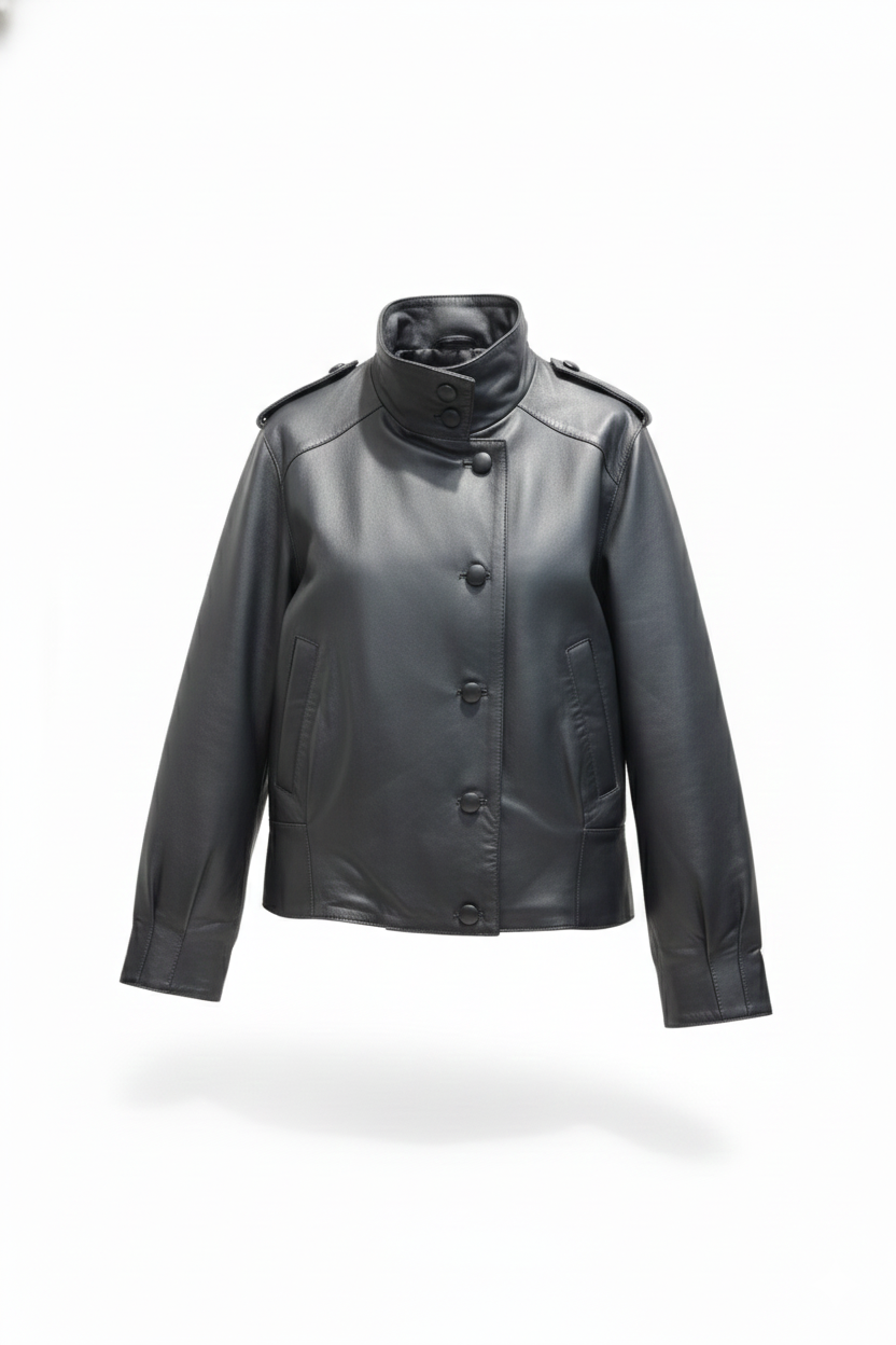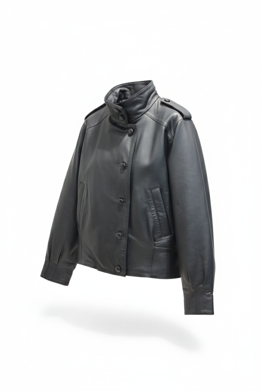 Blouson in nappa, trapunta imbottita all'interno, chiusura con bottoni rivestiti, tasche laterali.