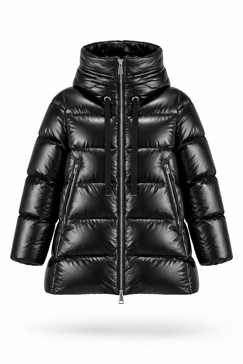 Piumino svasato imbottito in piuma d'oca, colore nero, tasche laterali con zip, zip in metallo a contrasto, cappuccio.