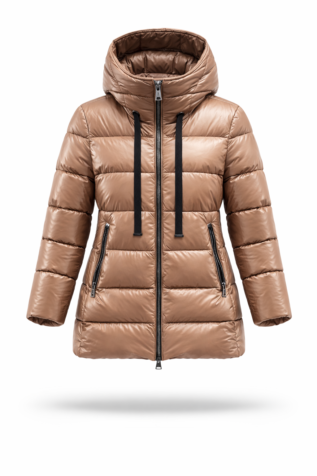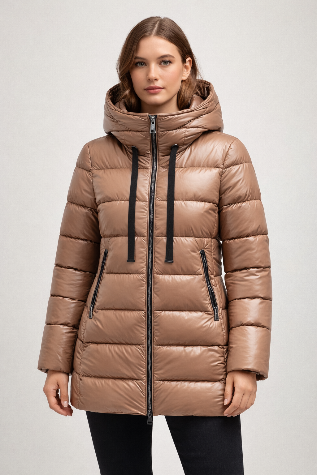 Piumino svasato imbottito in piuma d'oca, colore gianduia, tasche laterali con zip, zip in metallo a contrasto, cappuccio.