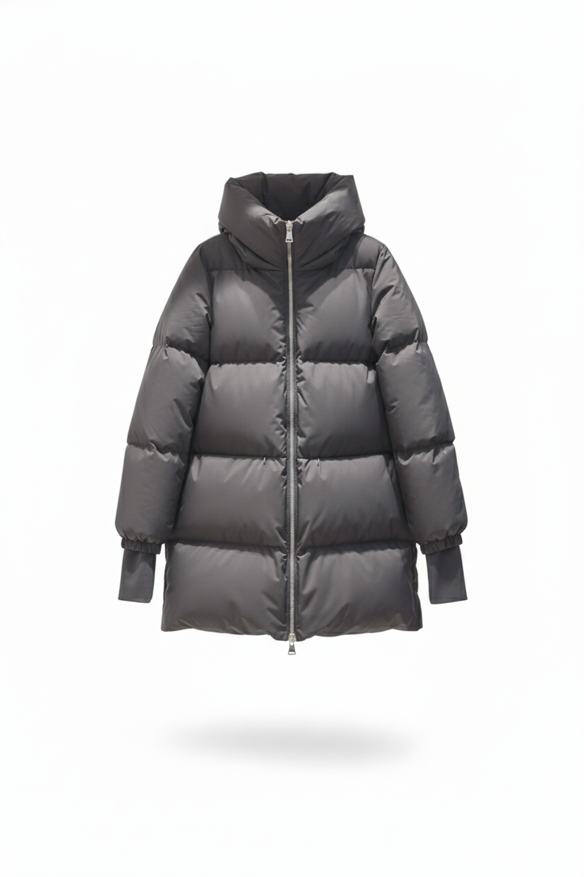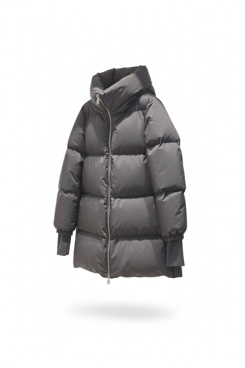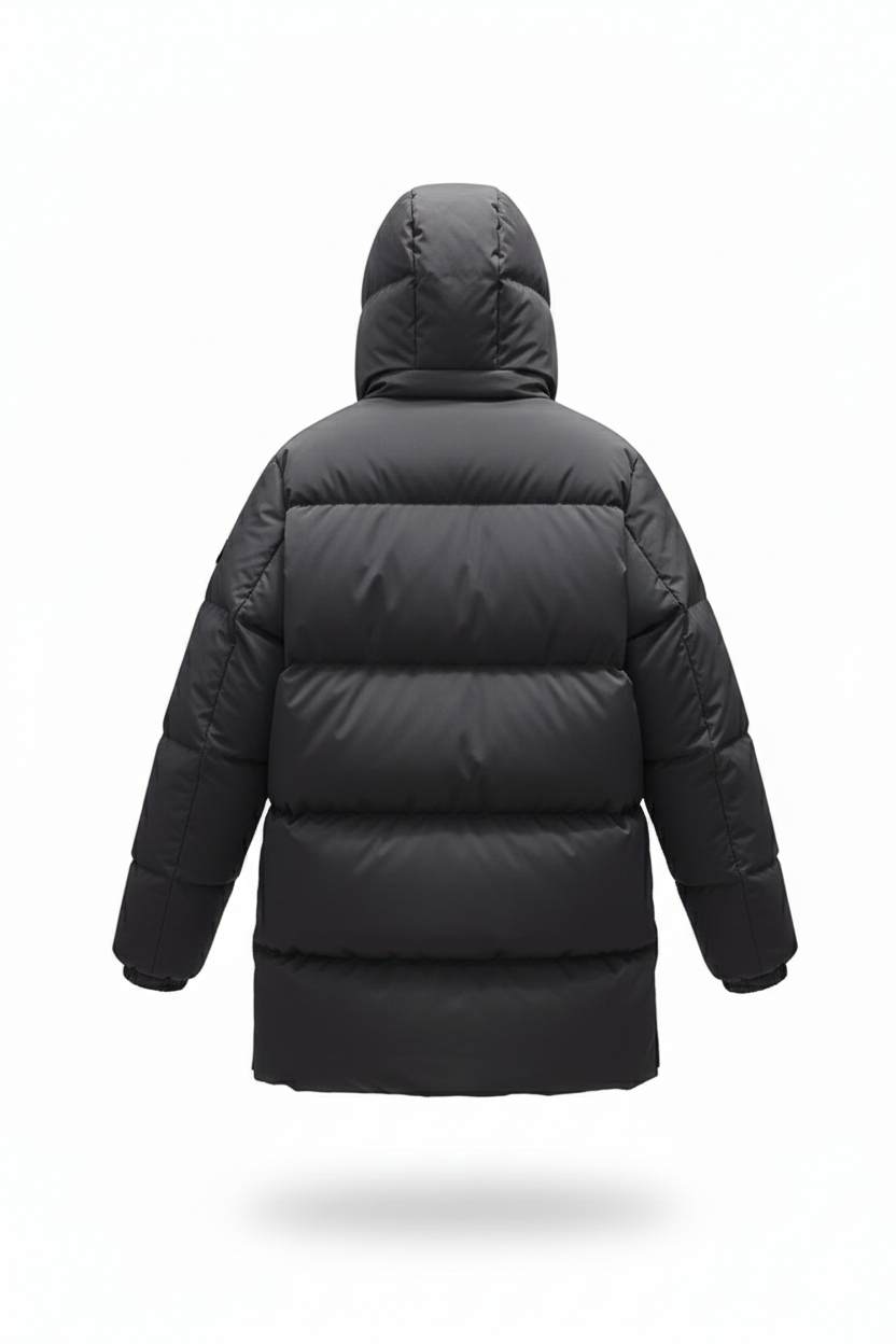 Piumino nero opaco imbottito in piuma d'oca, manicotti integrati, spacchi laterali con bottoni a pressione, tasche laterali.