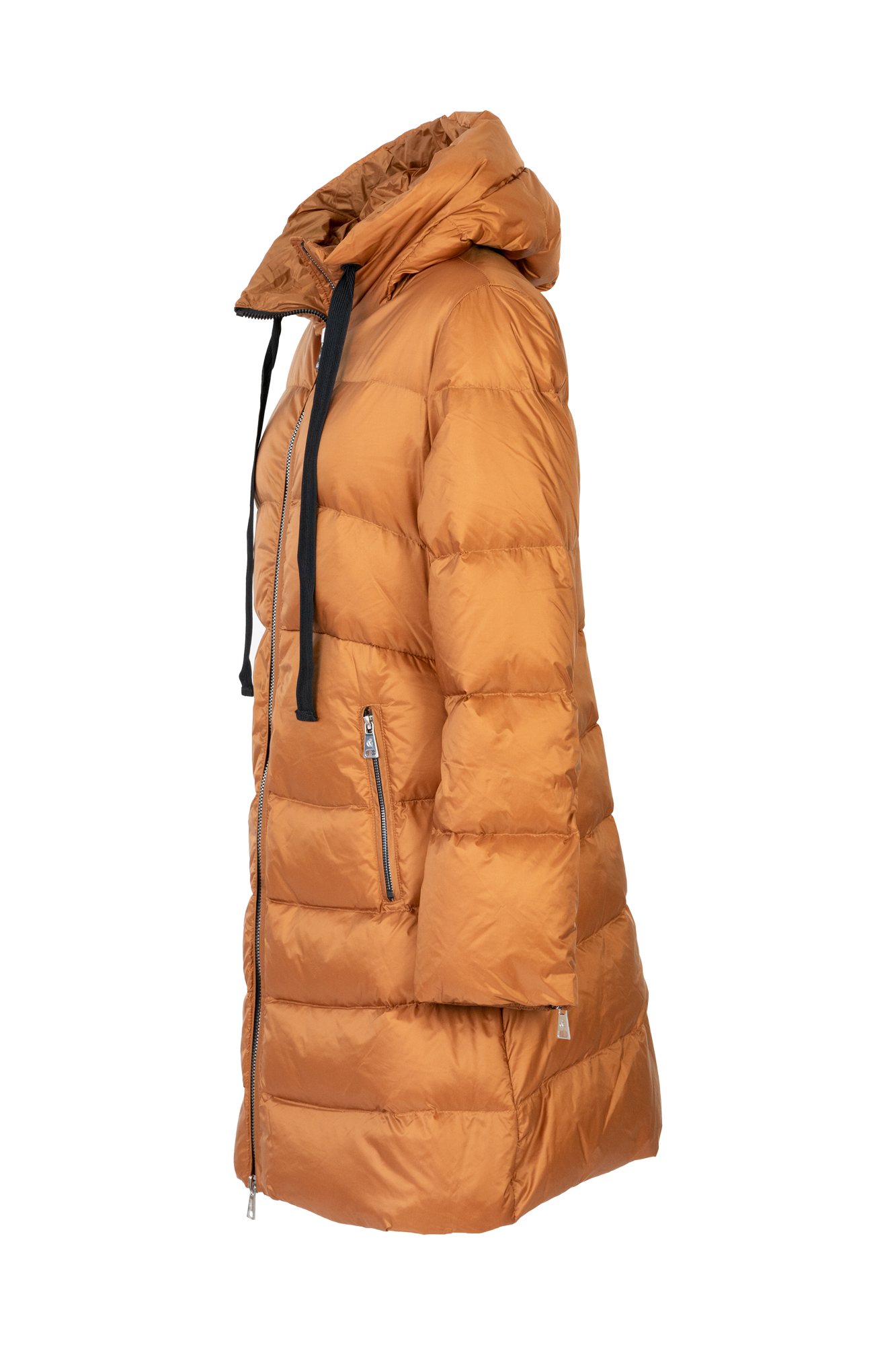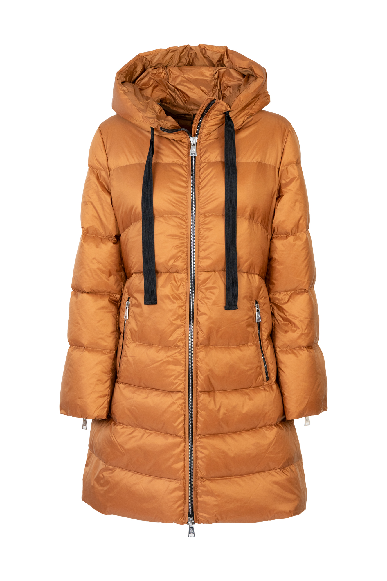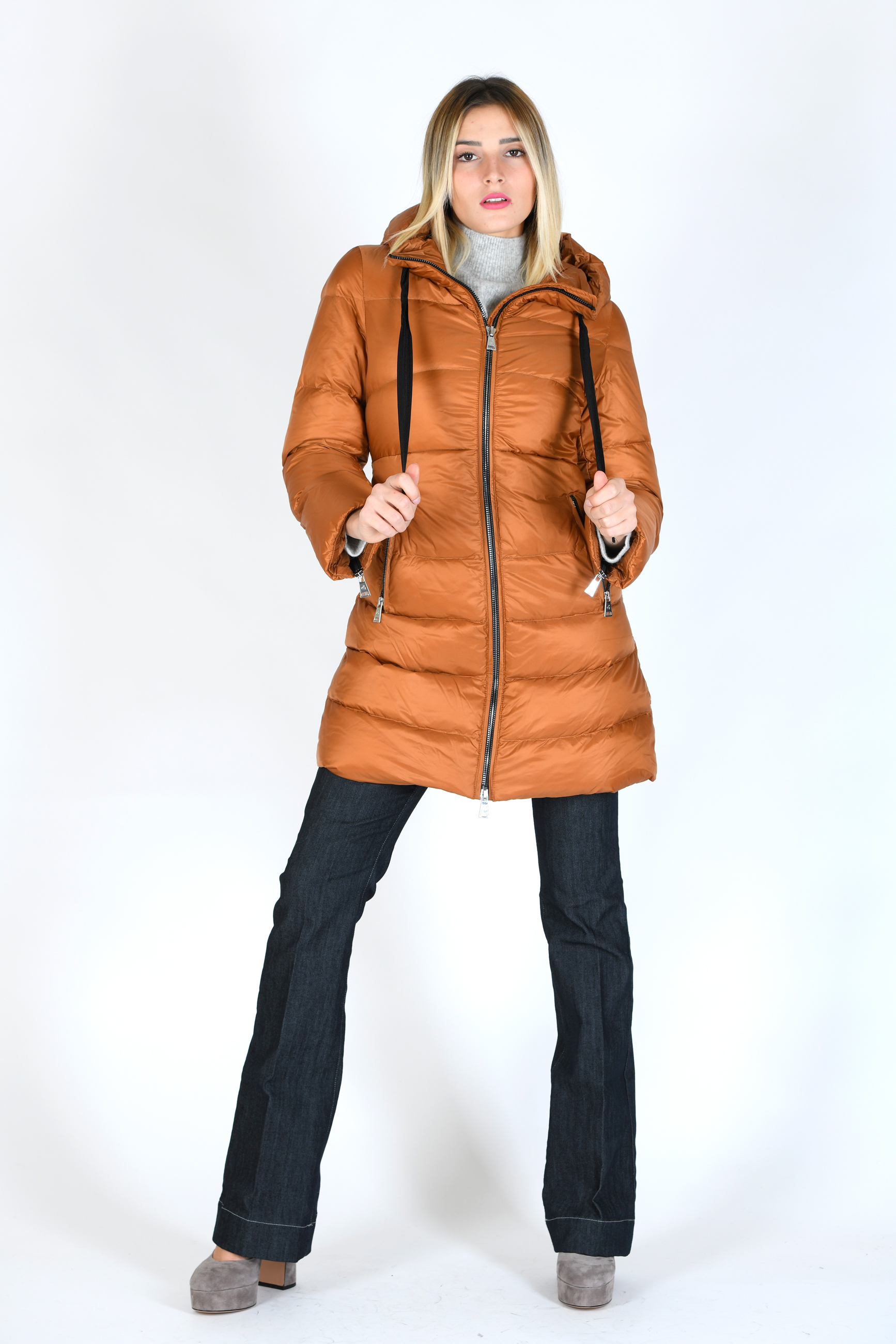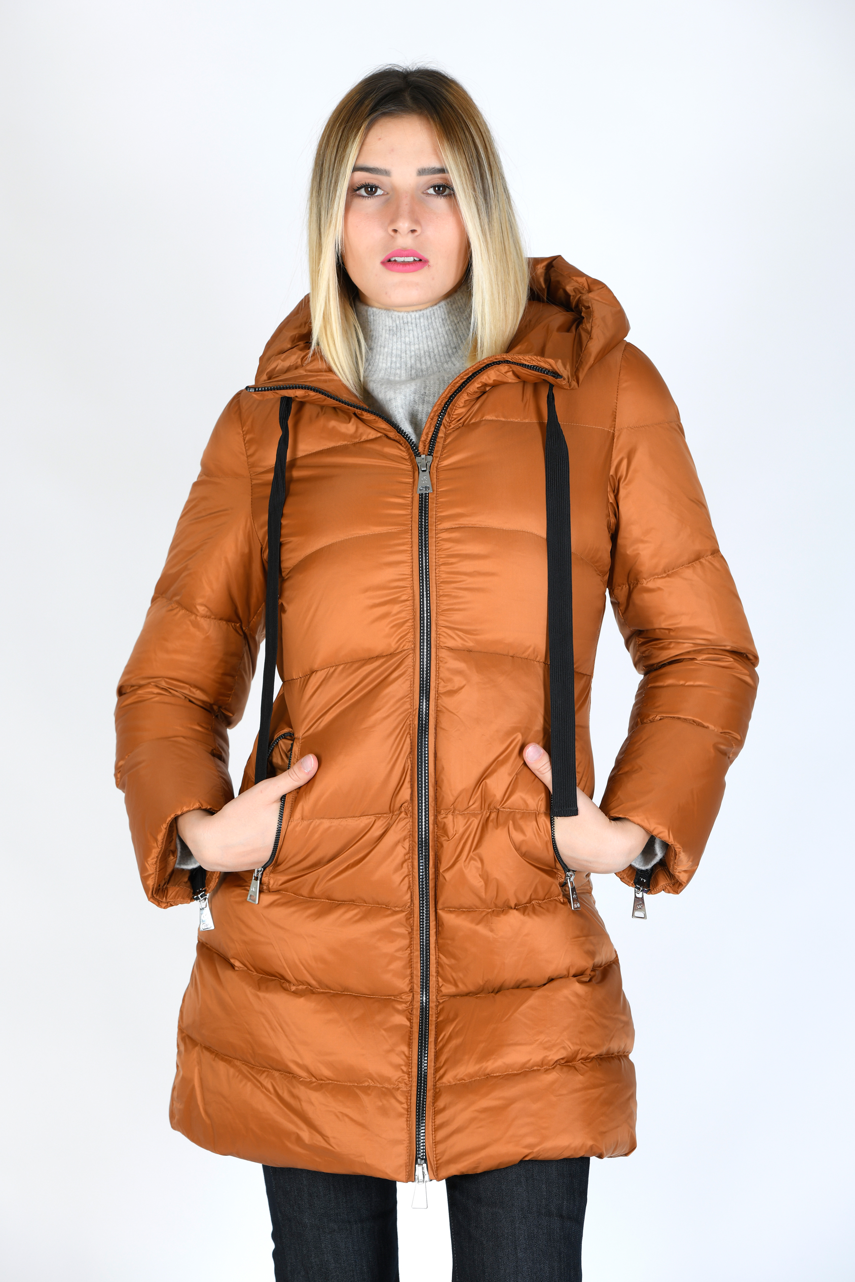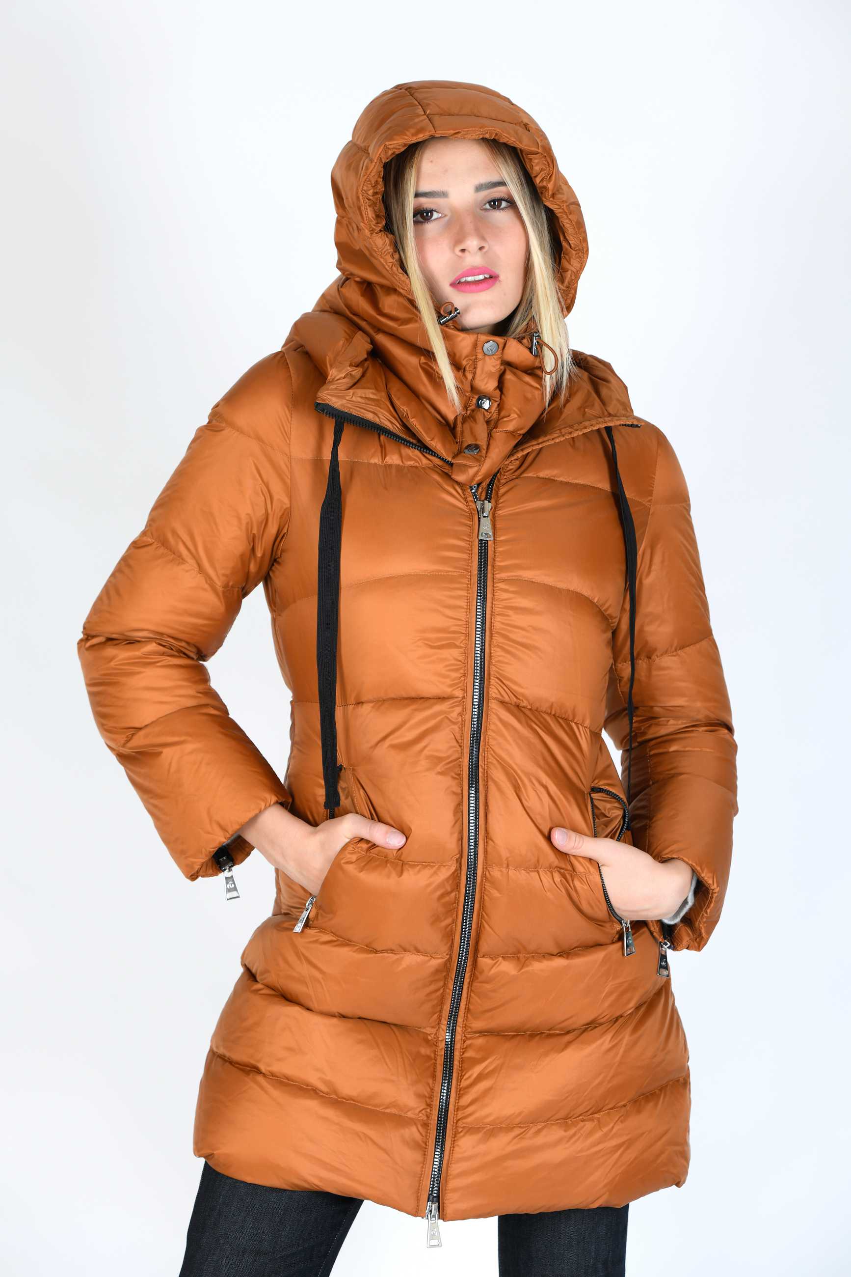 Giubbino di media lunghezza in vera piuma d'oca , linea sfiancata con cappuccio, chiusura con zip e tasche laterali a vista. Dettaglio cerniere su maniche.