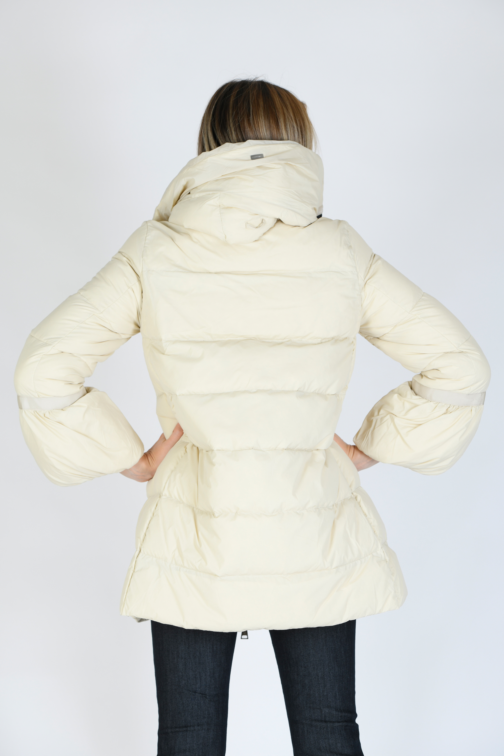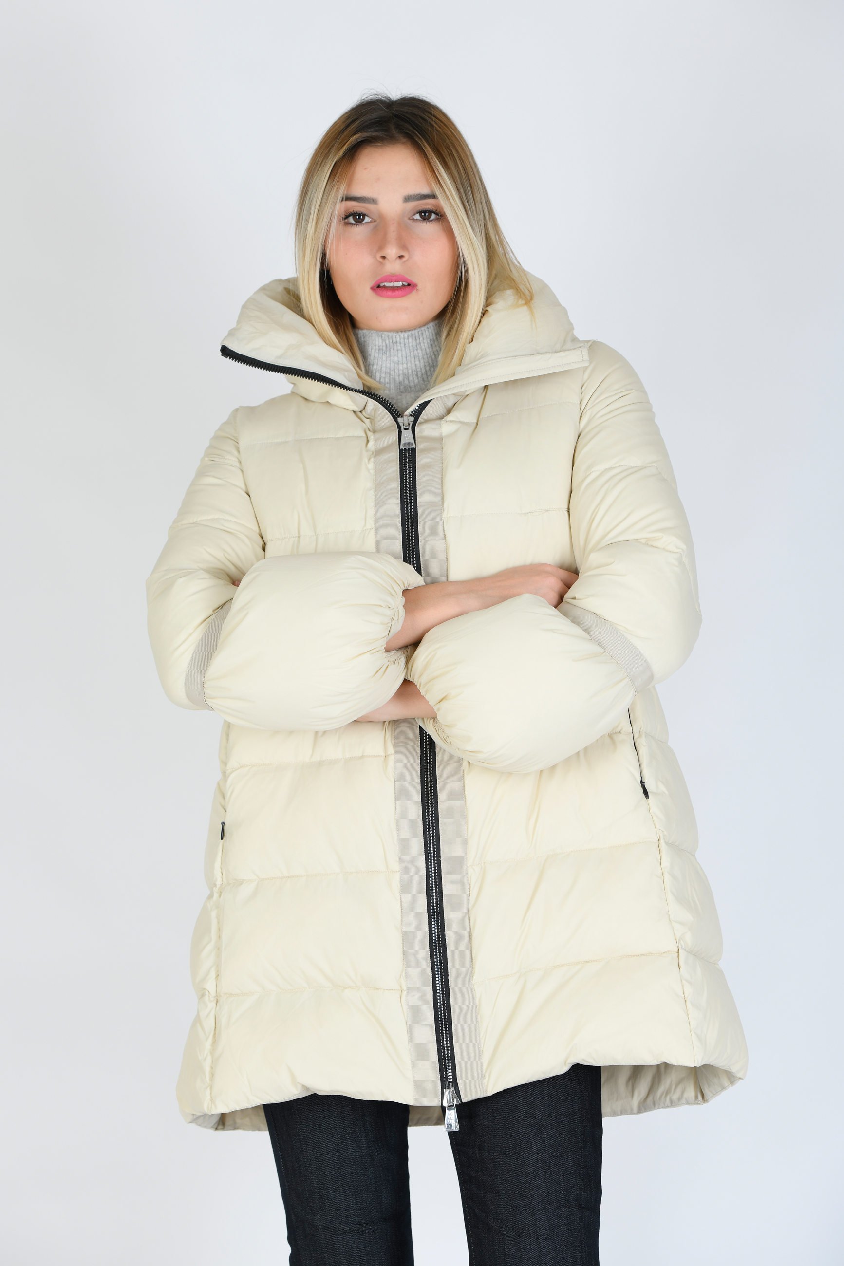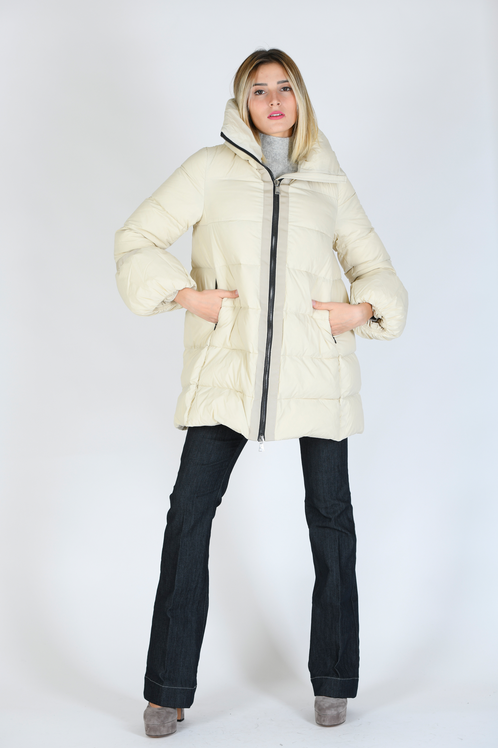 Giubbino in vera piuma d'oca , media lunghezza , linea svasata con collo e cappuccio , chiusura con zip e tasche laterali con zip a scomparsa , polso con sbuffo.