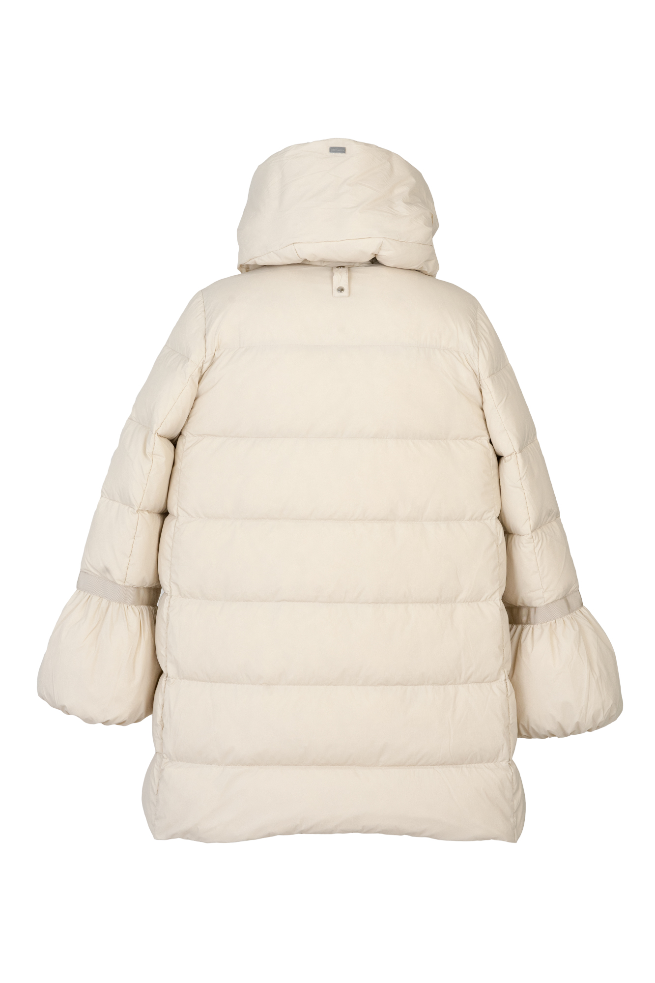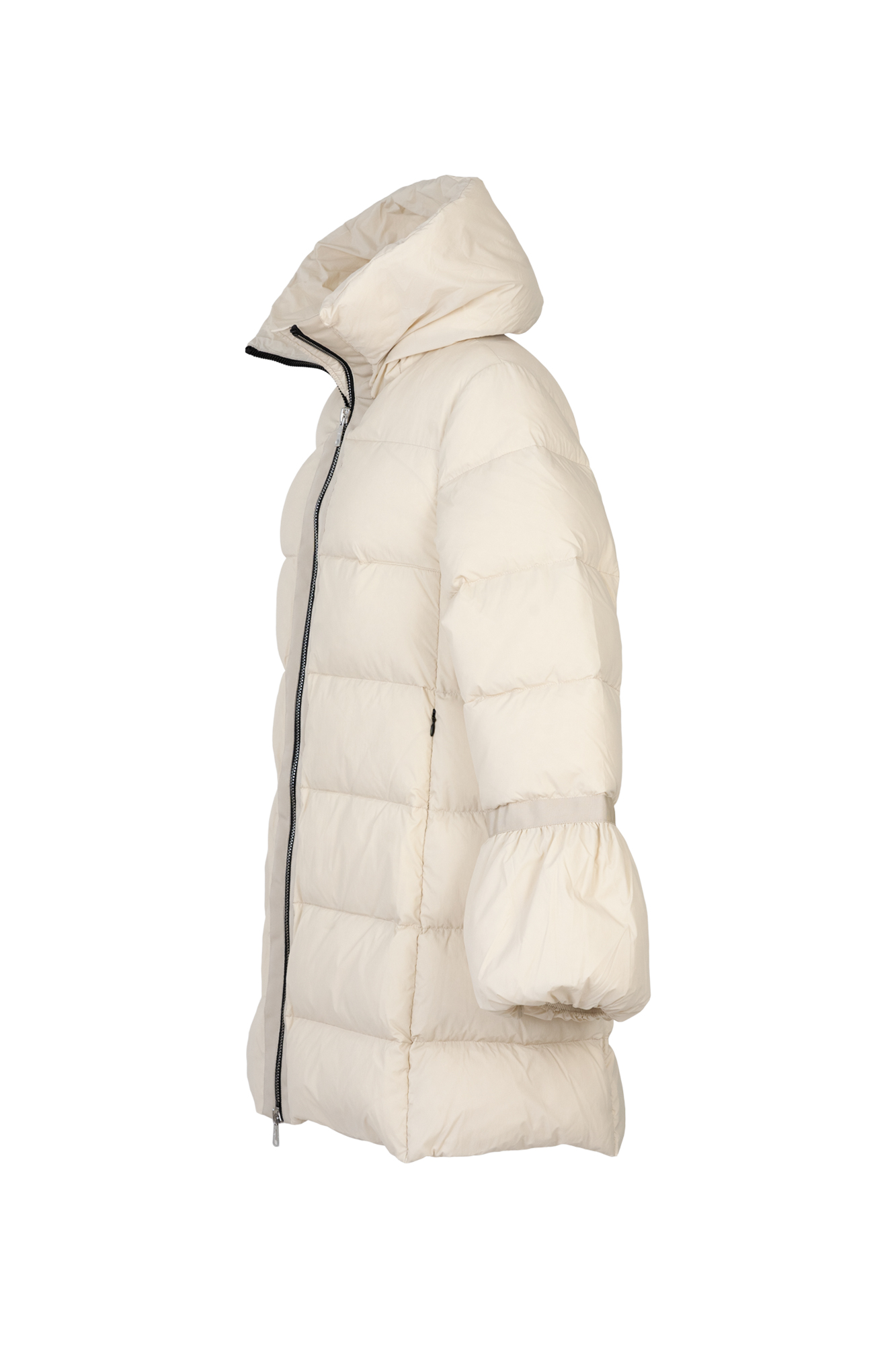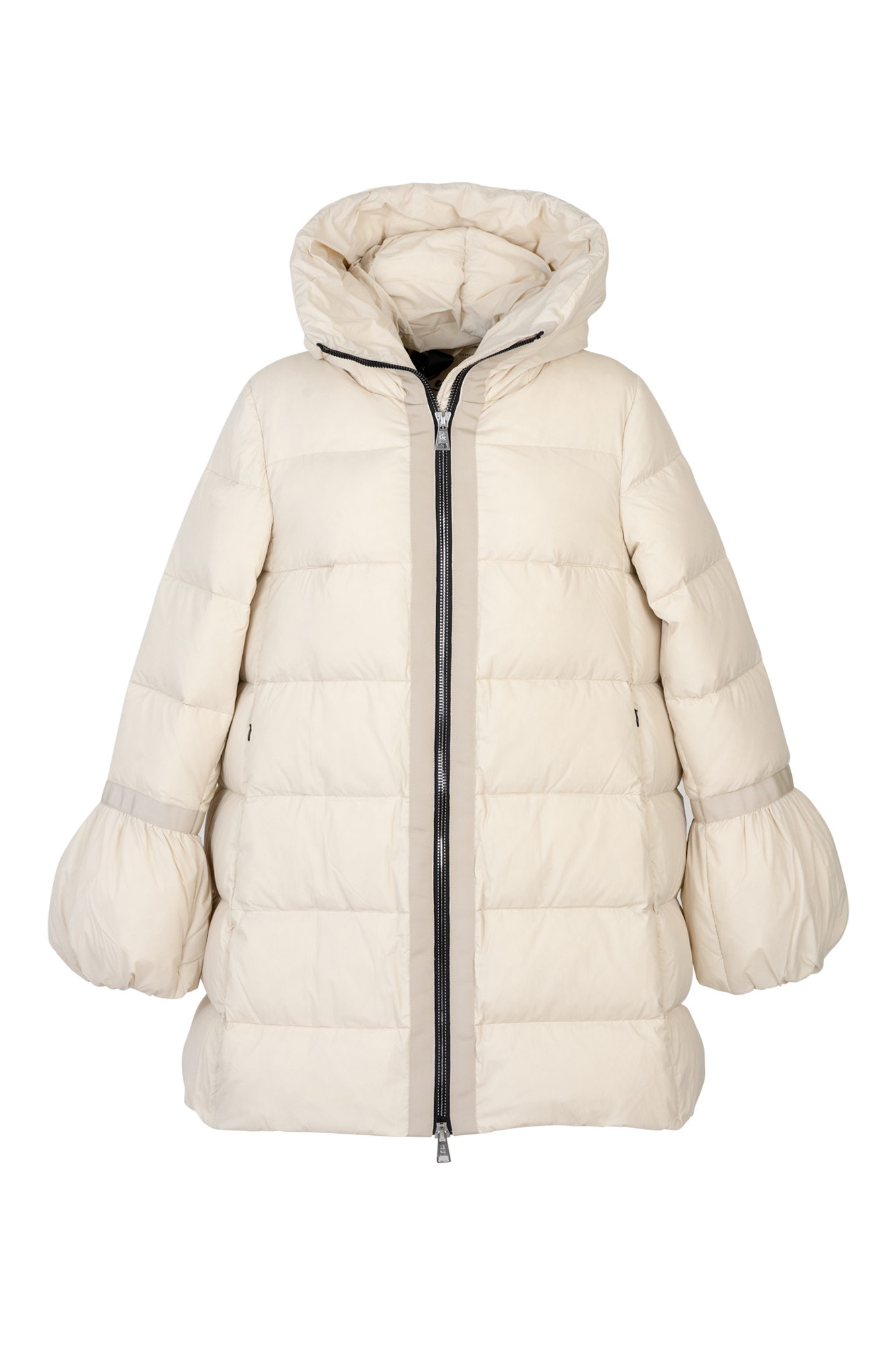 Giubbino in vera piuma d'oca , media lunghezza , linea svasata con collo e cappuccio , chiusura con zip e tasche laterali con zip a scomparsa , polso con sbuffo.