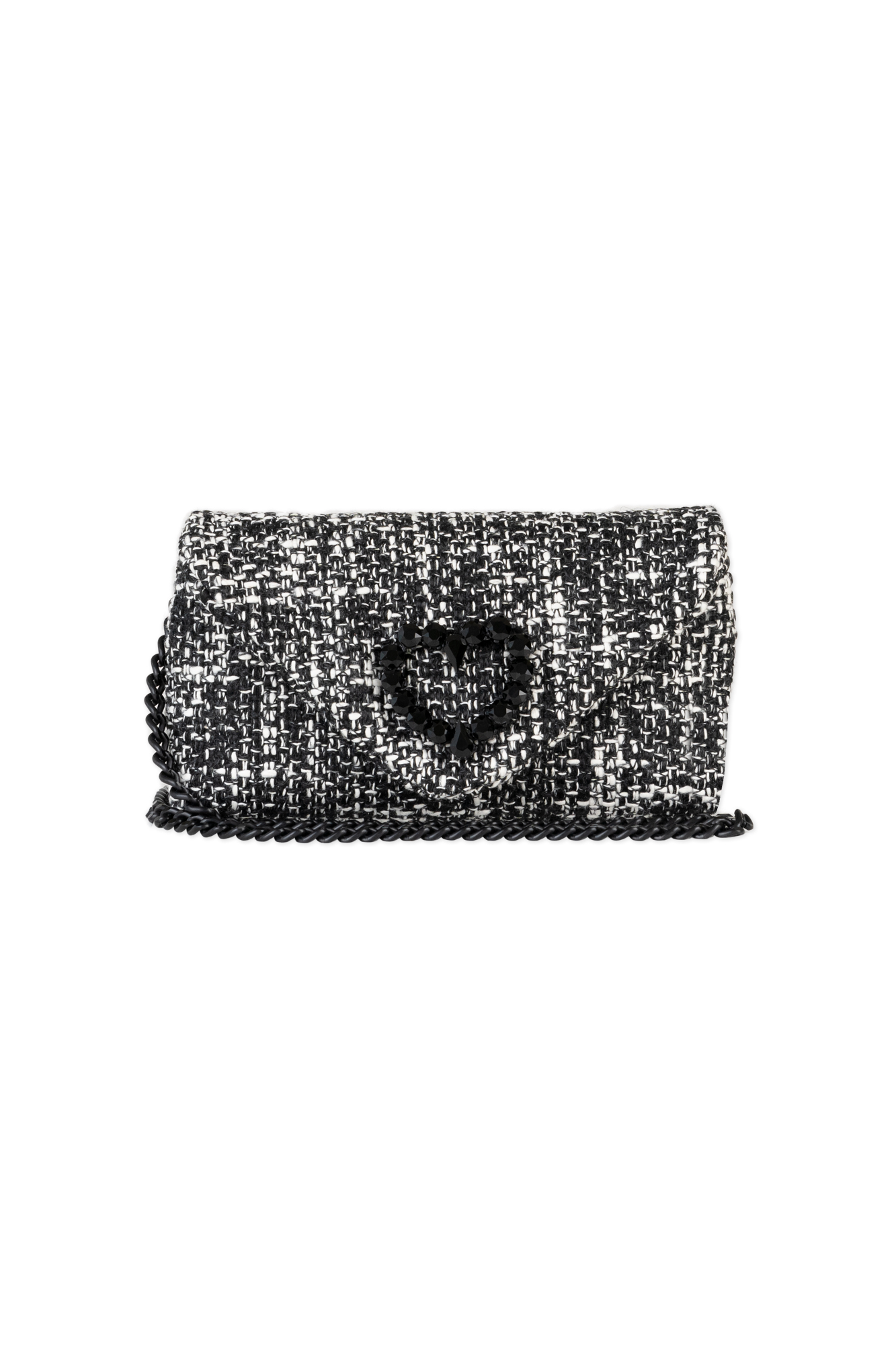 Borsetta in tweed con applicazione gioiello a cuore, tracolla catena.