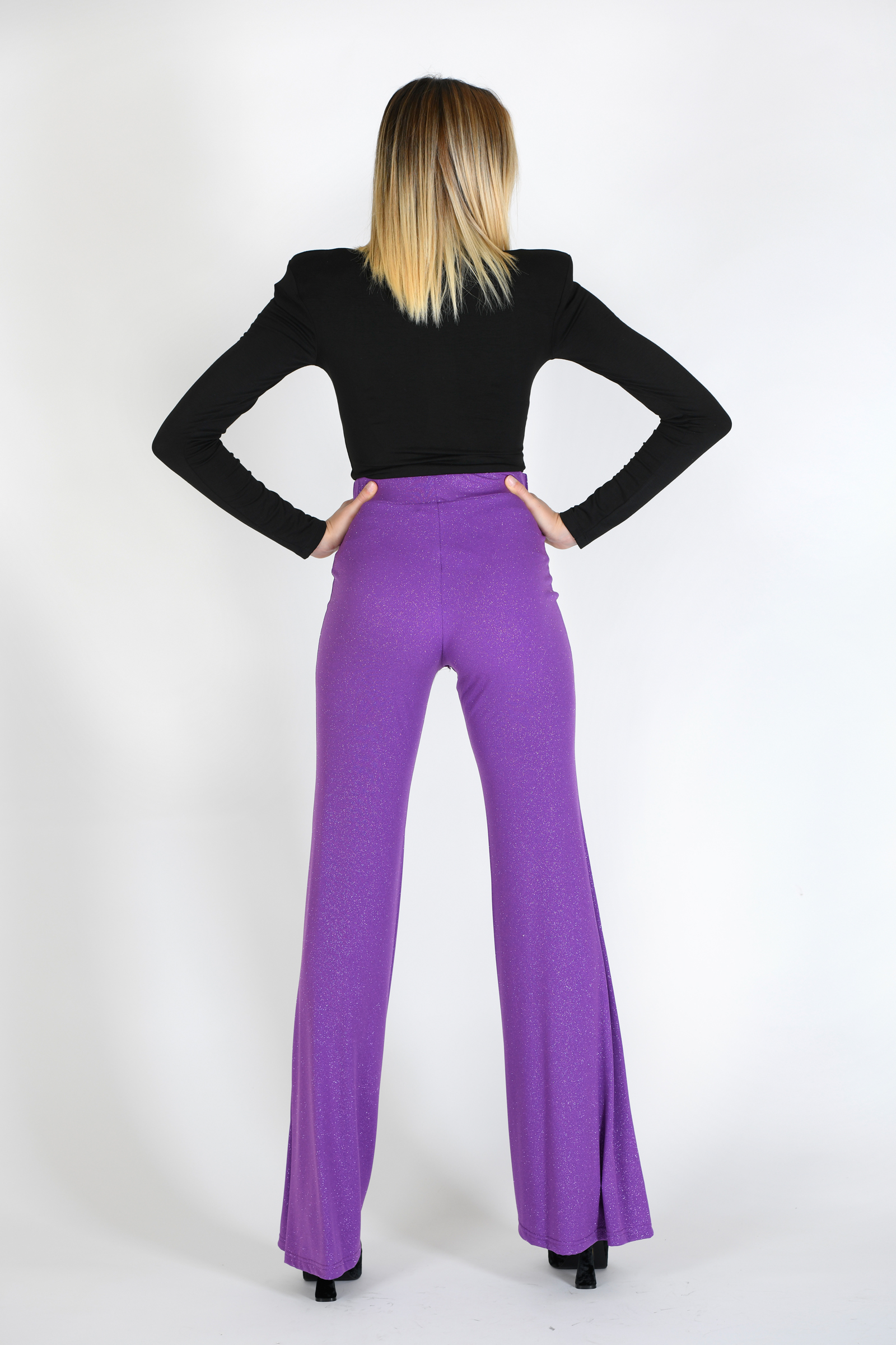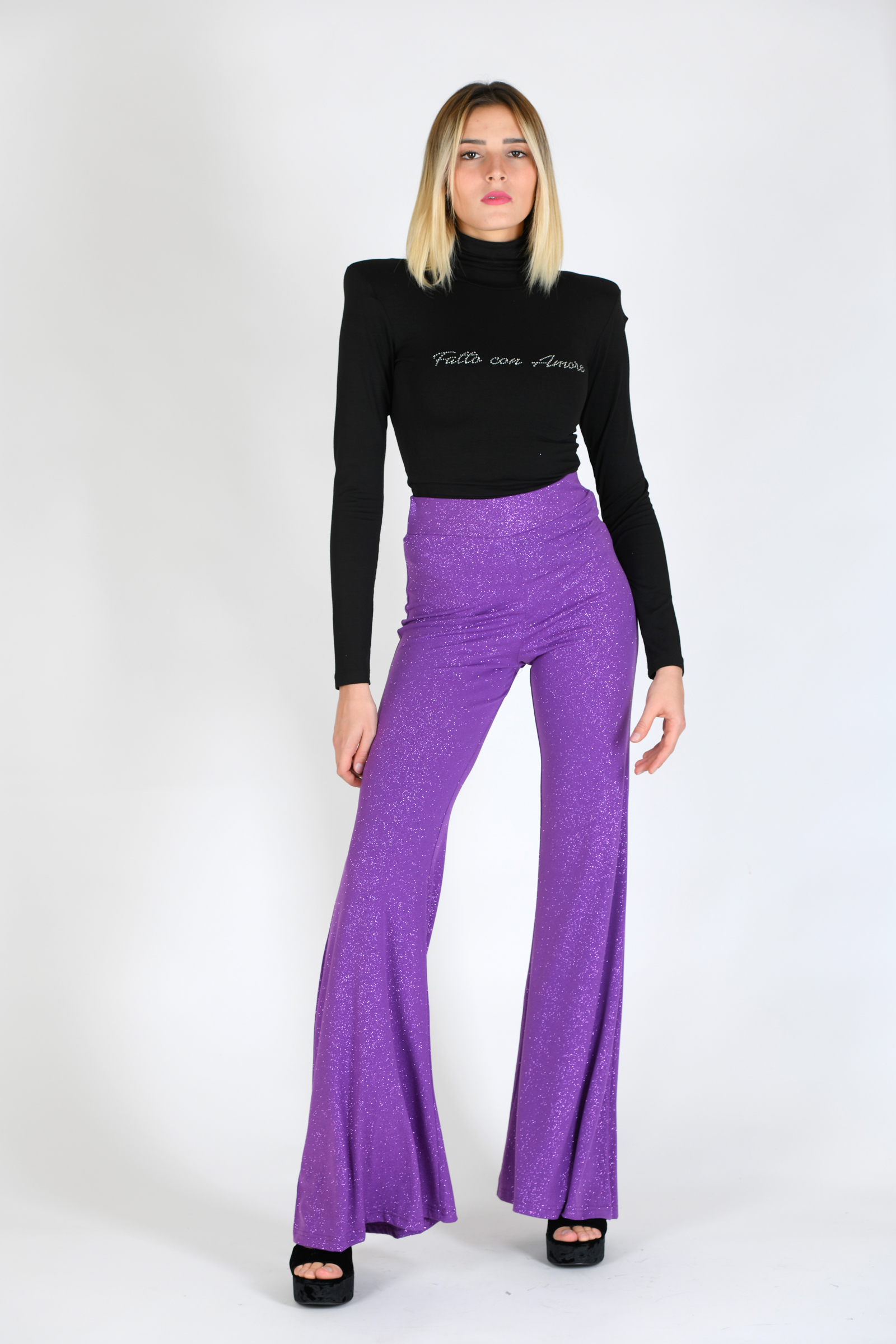 Pantalone in lurex, fondo a zampa, vita alta