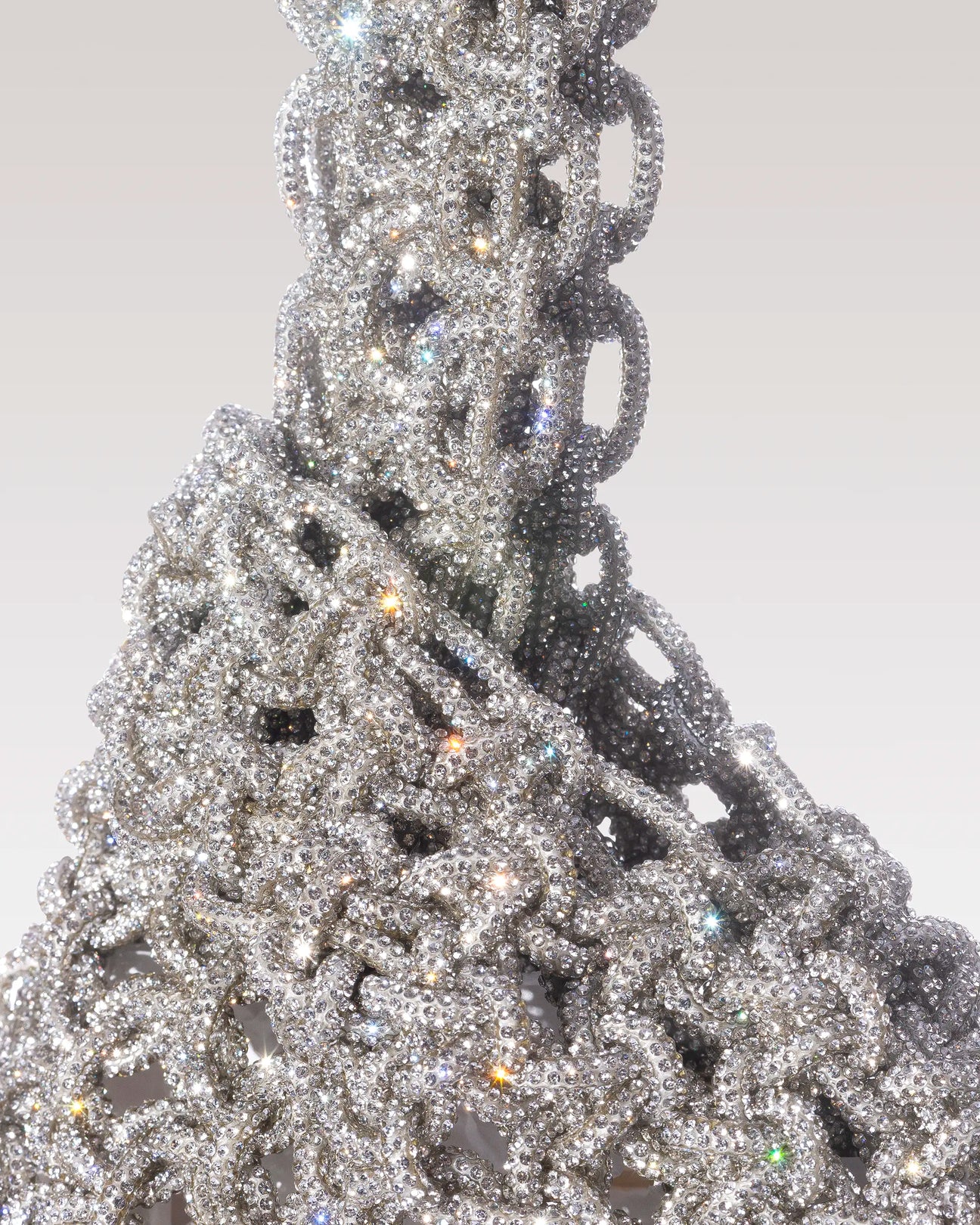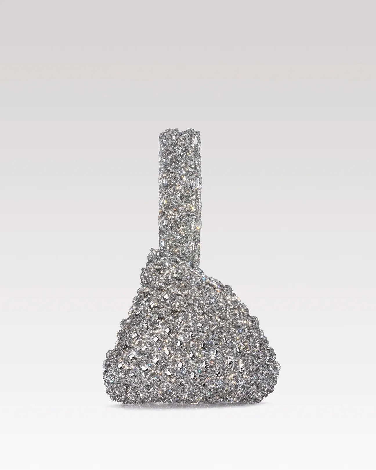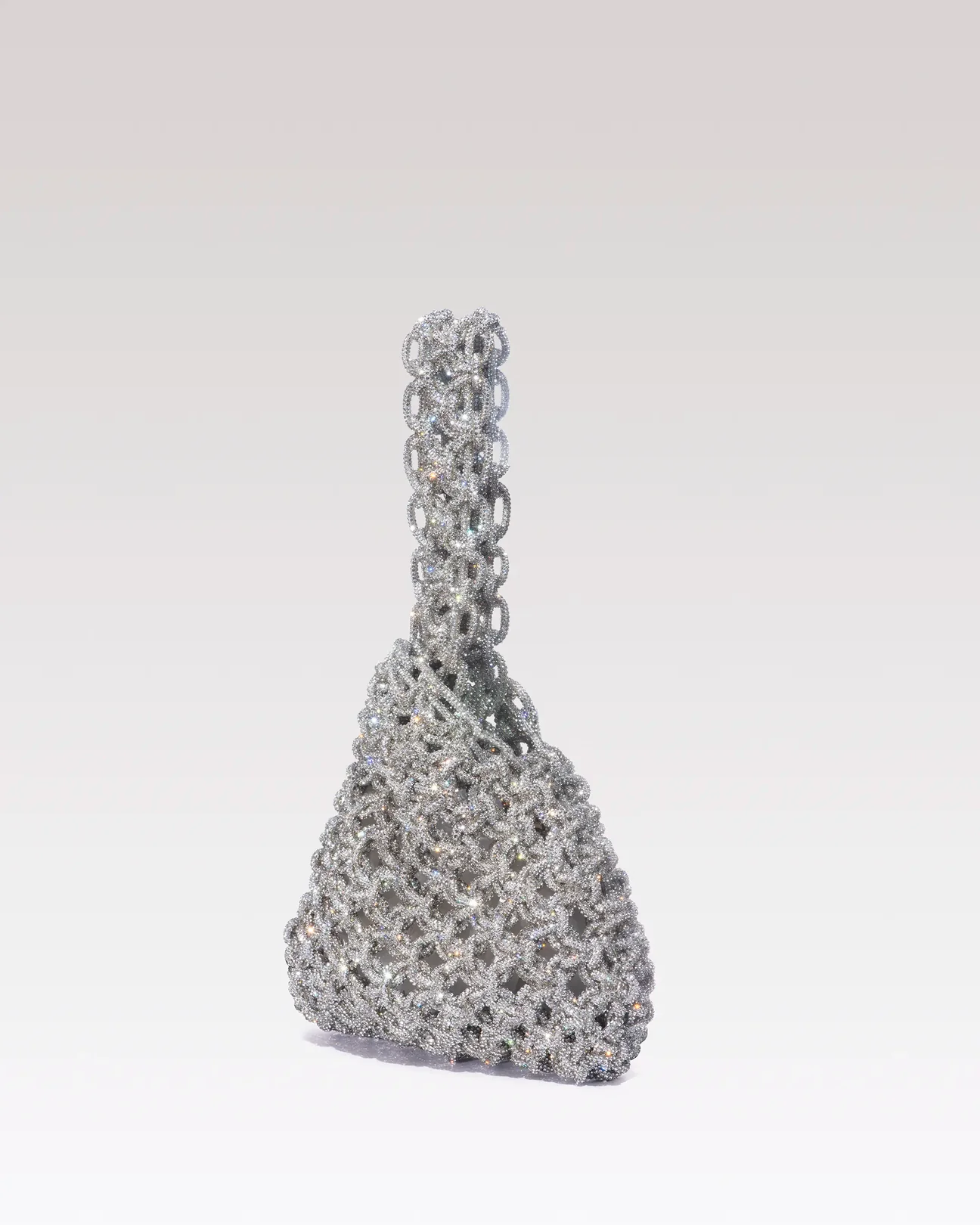 Caratterizzata da una chiusura a nodo ispirata allestetica giapponese, la borsa Niky è realizzata interamente a mano secondo una raffinata tecnica di intreccio. Il filato ricoperto di cristalli ne esalta la brillantezza, mentre il design compatto e raffinato la rende perfetta da portare al polso, aggiungendo un tocco di eleganza luminosa a ogni look.