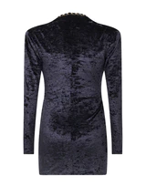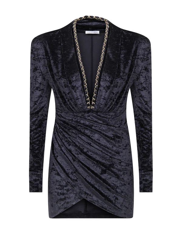 Abito corto in velluto, drappeggio sul fianco, maniche lunghe, scollo profondo a V con catena. Spalline strutturate a farfalla.
