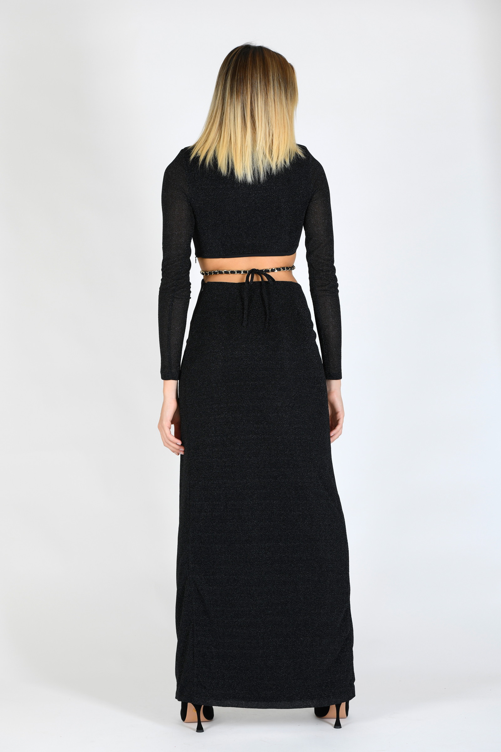 Abito in lurex con ampio spacco sul fronte, maniche lunghe, dettagli cut out e catena sui fianchi.
