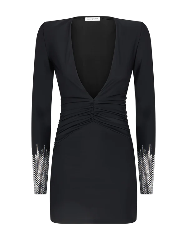 Abito corto in lycra, maniche lunghe, scollo profondo a V con drappeggio frontale, spalline strutturate a farfalla. Dettaglio cristalli su polsini con zip