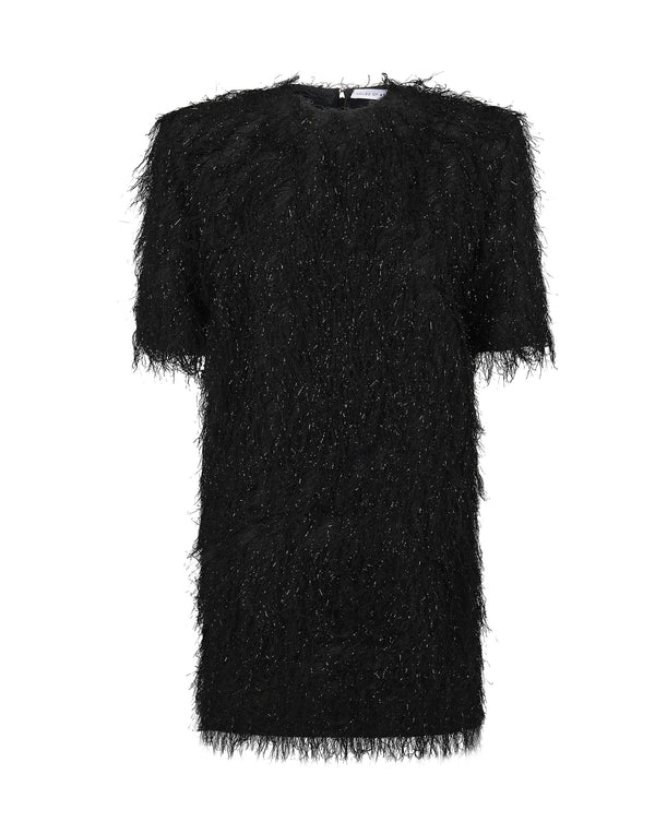 Abito a tunica corto, maniche corte, girocollo, dettaglio frange.