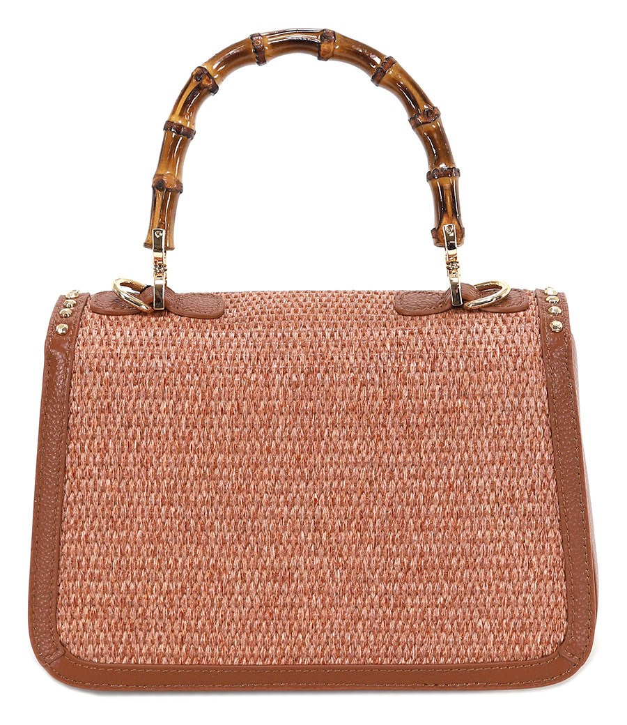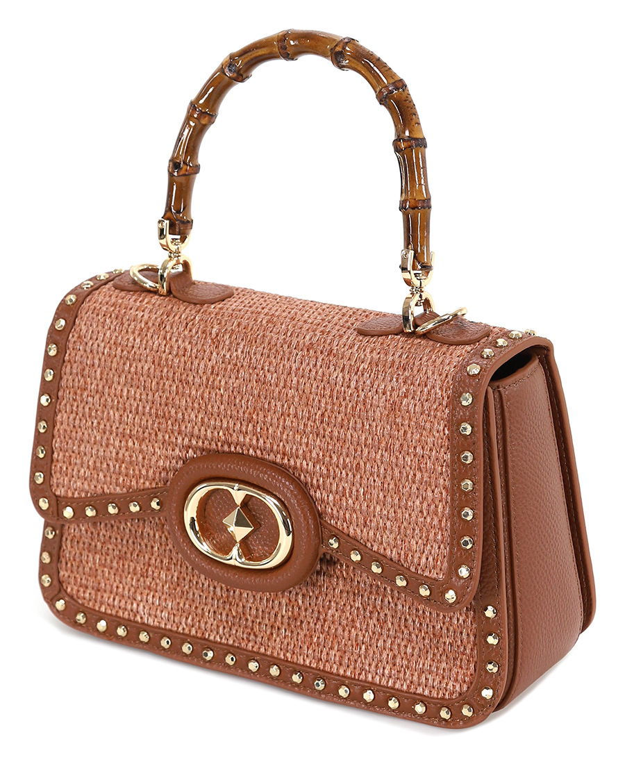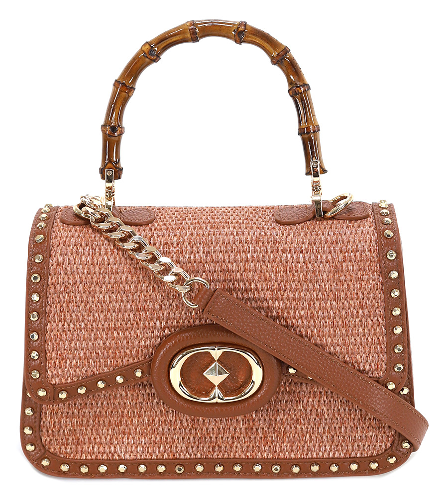 borsa a mano in pelle e raphia, manico in bambù, tracolla con catena removibile, dettaglio borchie