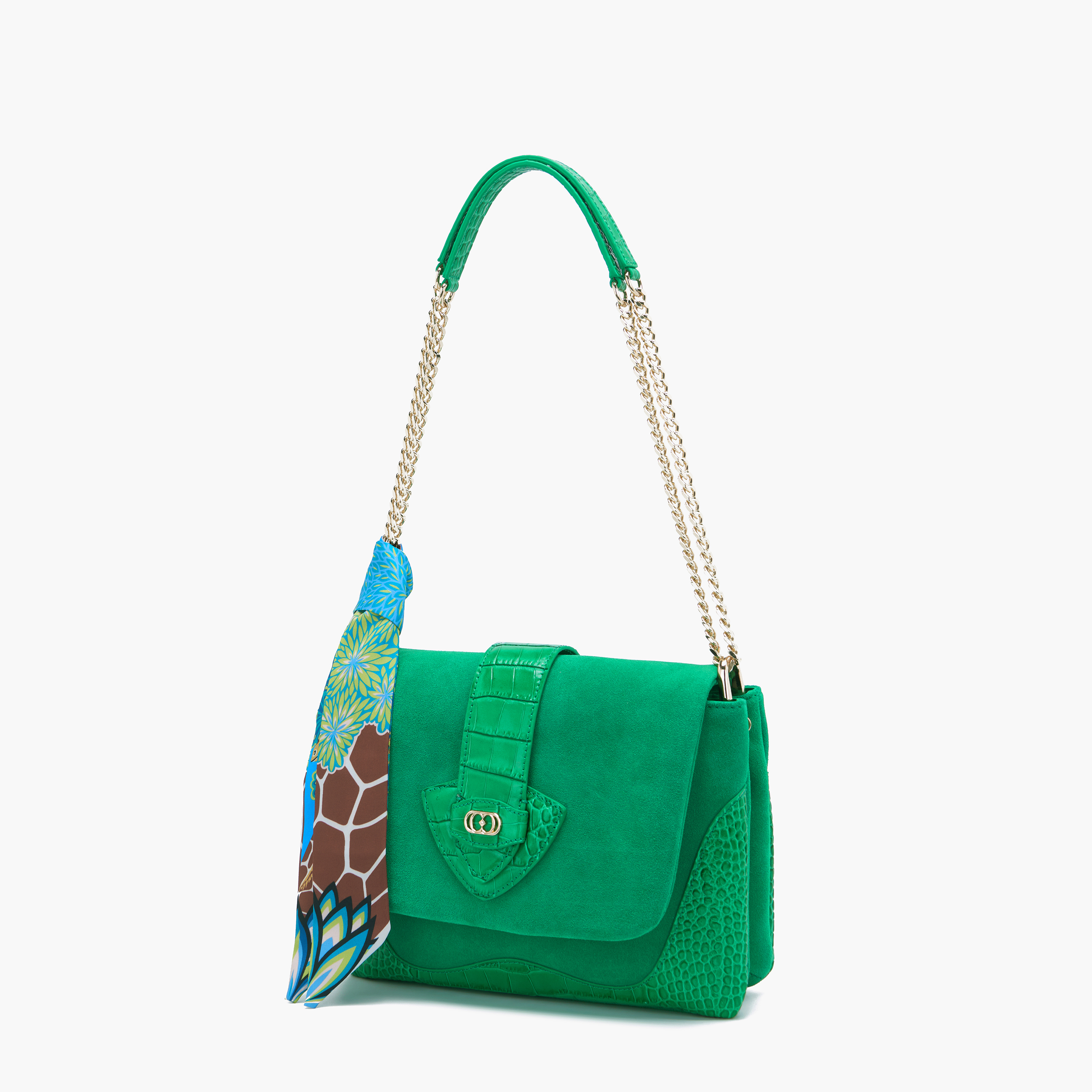 borsa a tracolla in pelle, camoscio e cocco, tracolla removibile, dettaglio foulard