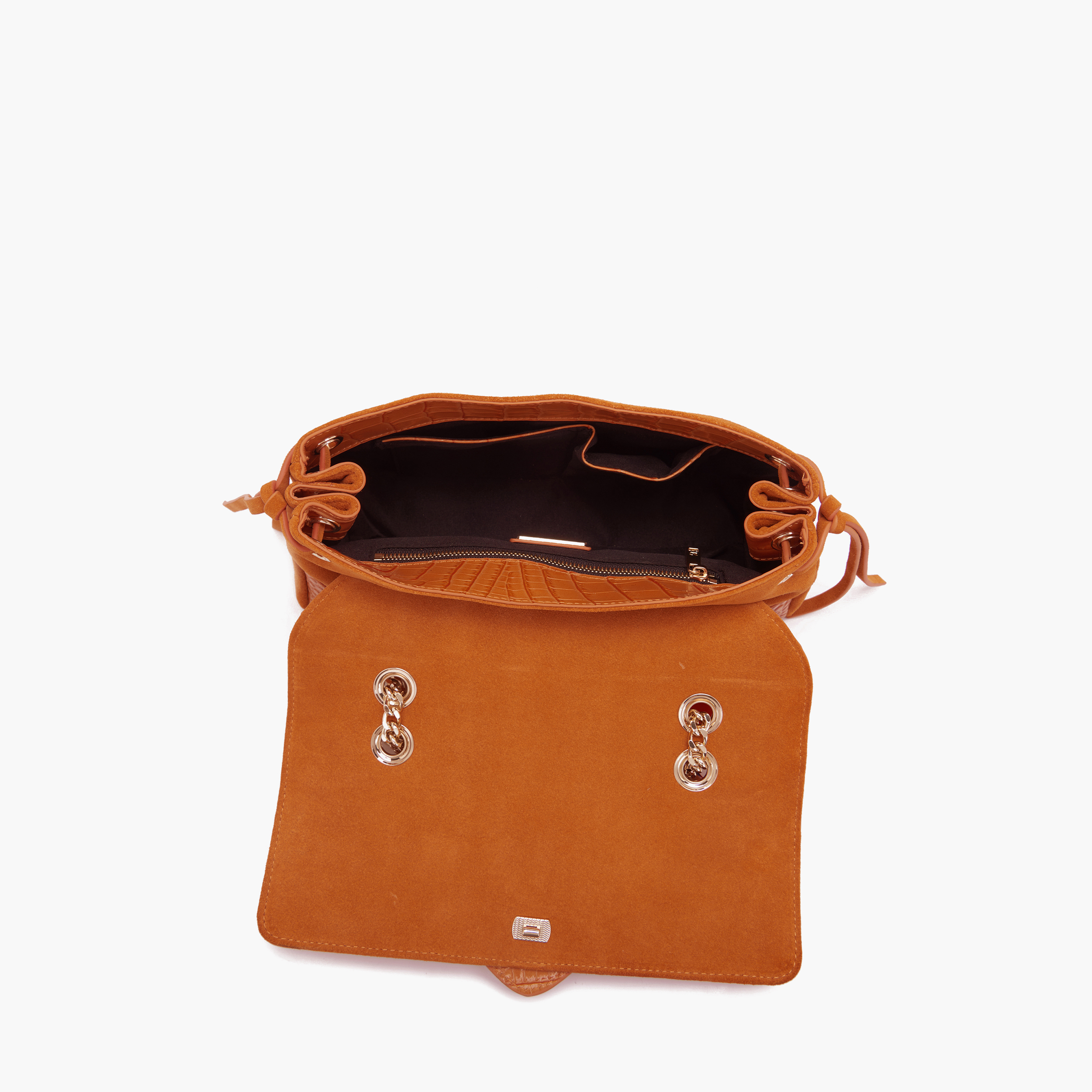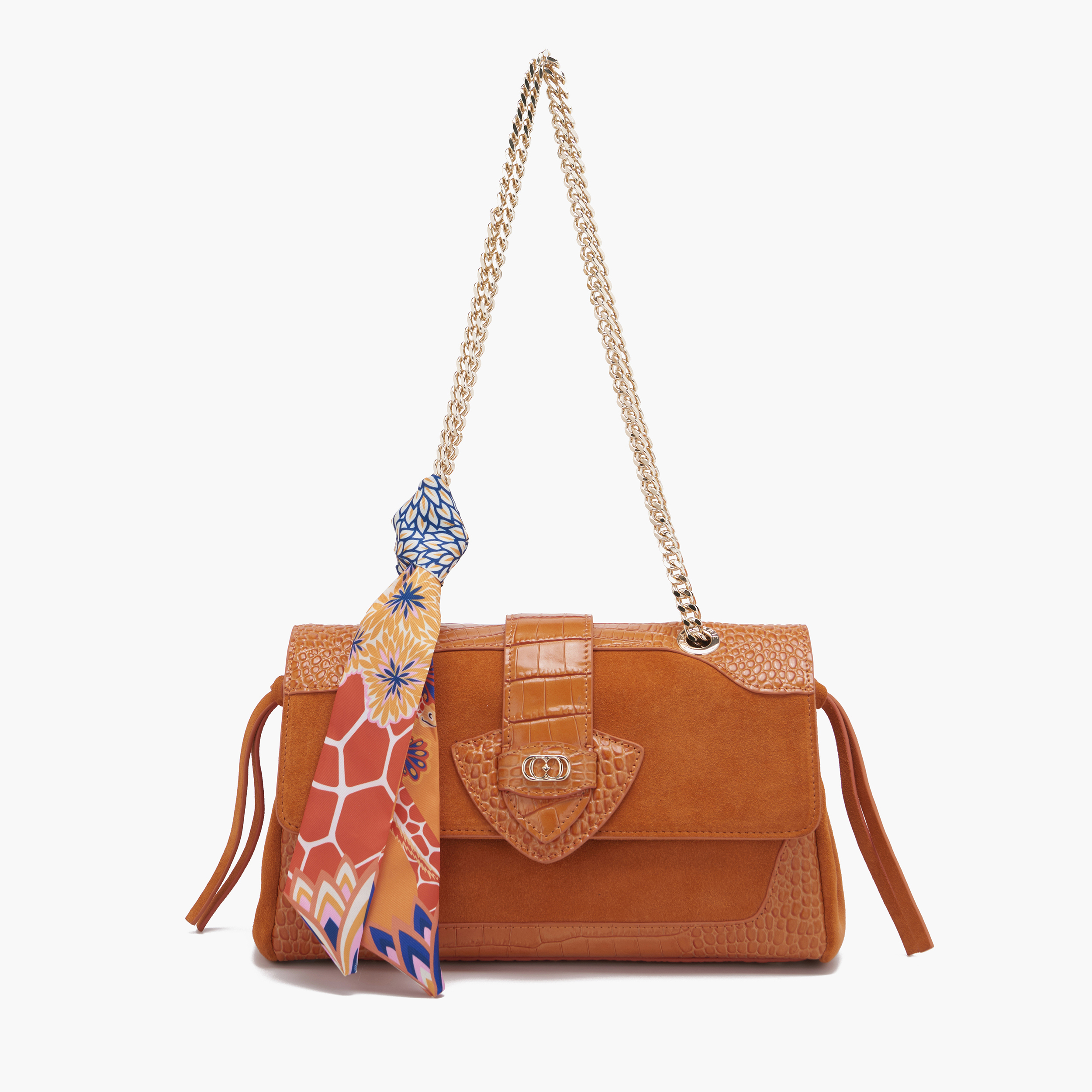 borsa baguette di media grandezza in pelle scamosciata e cocco con tracolla a catena da indossare anche a spalla con dettaglio foulard