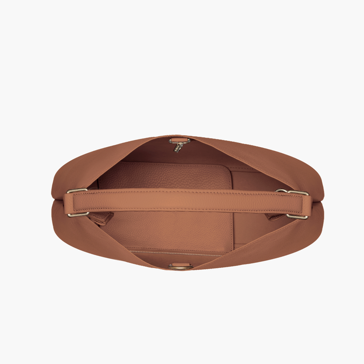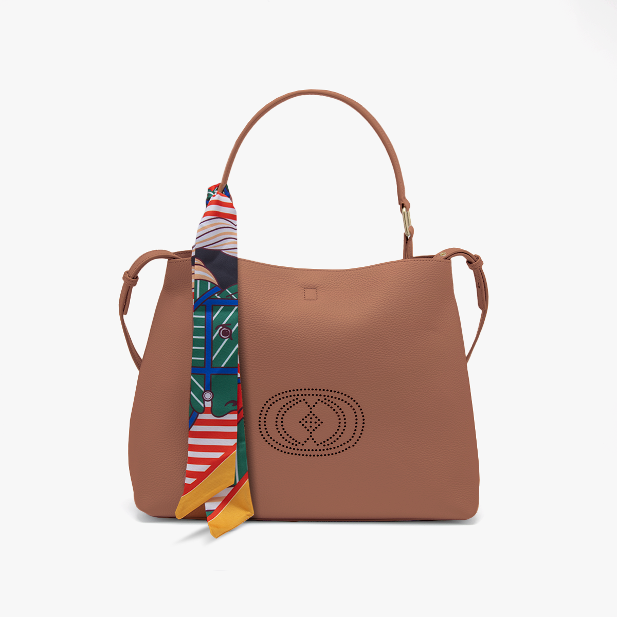 borsa a spalla in pelle bottalata, con gancio logato, tracolla lunga removibile, logo centrale traforato, dettaglio foulard