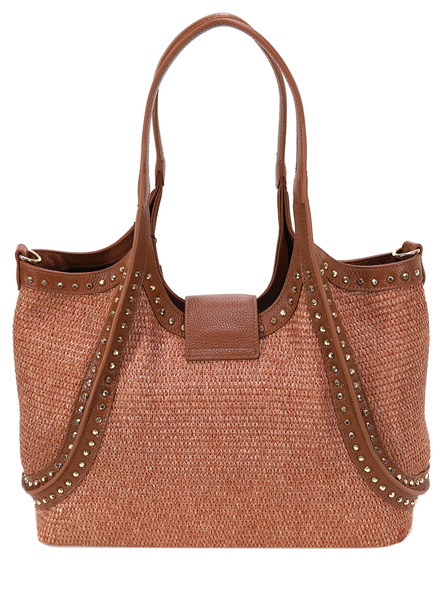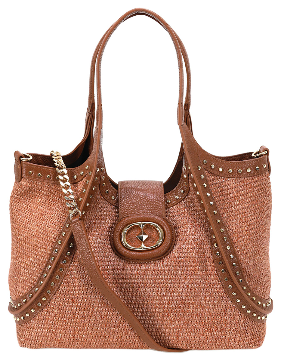 borsa grande in pelle e raphia, dettaglio con borchie, manico rigido e tracolla a catena