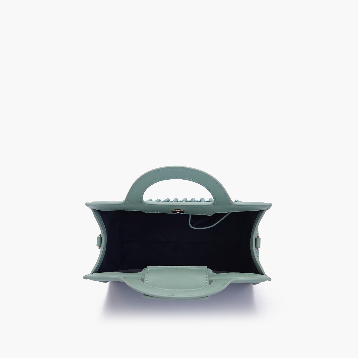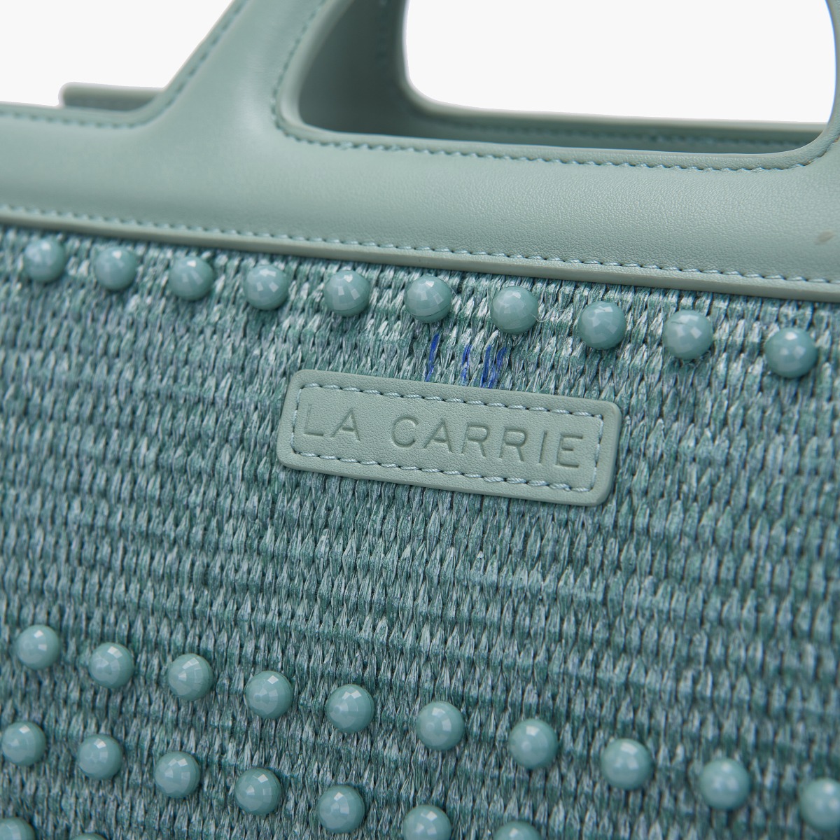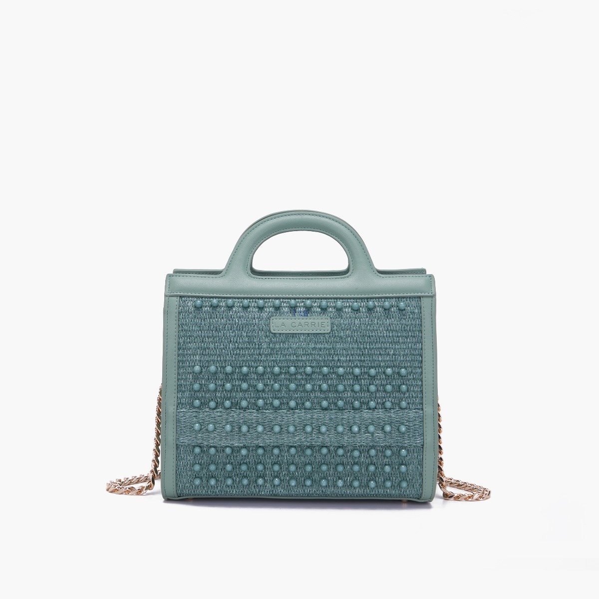 borsa shopping piccola in rafia con perle metalliche in tinta alla borsa e bordi in ecopelle.