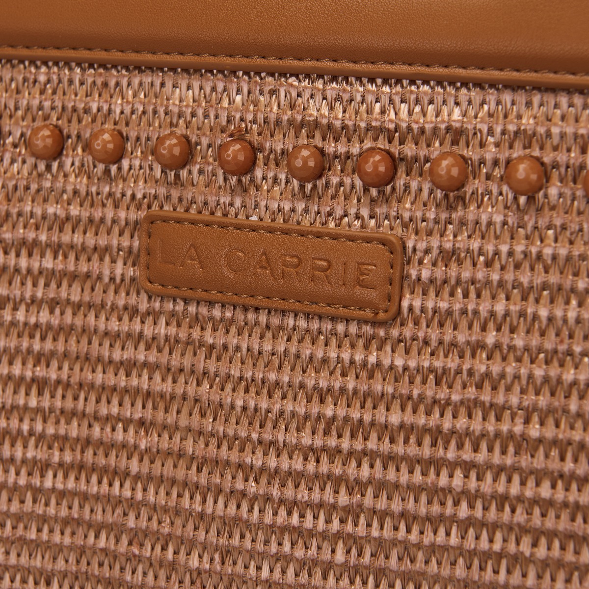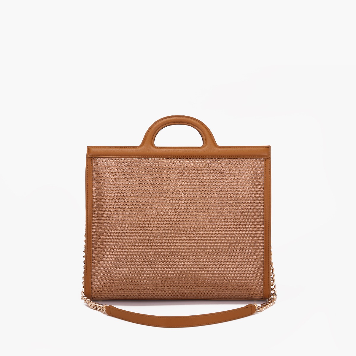 borsa shopping in rafia con perle metalliche in tinta alla borsa e bordi in ecopelle.
