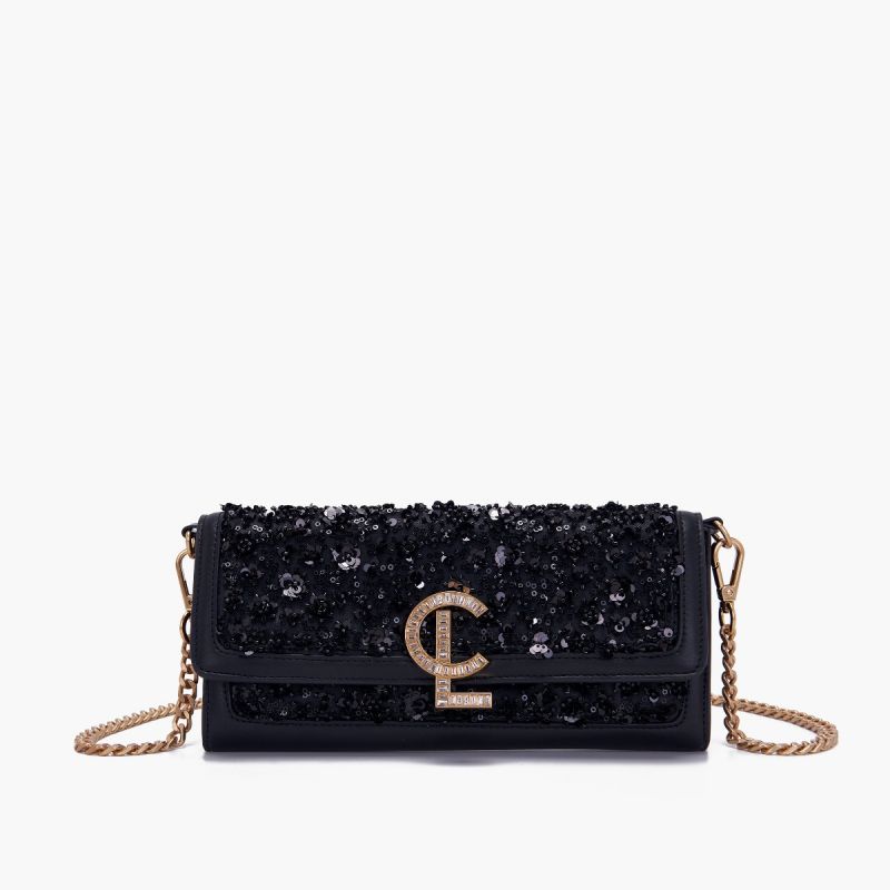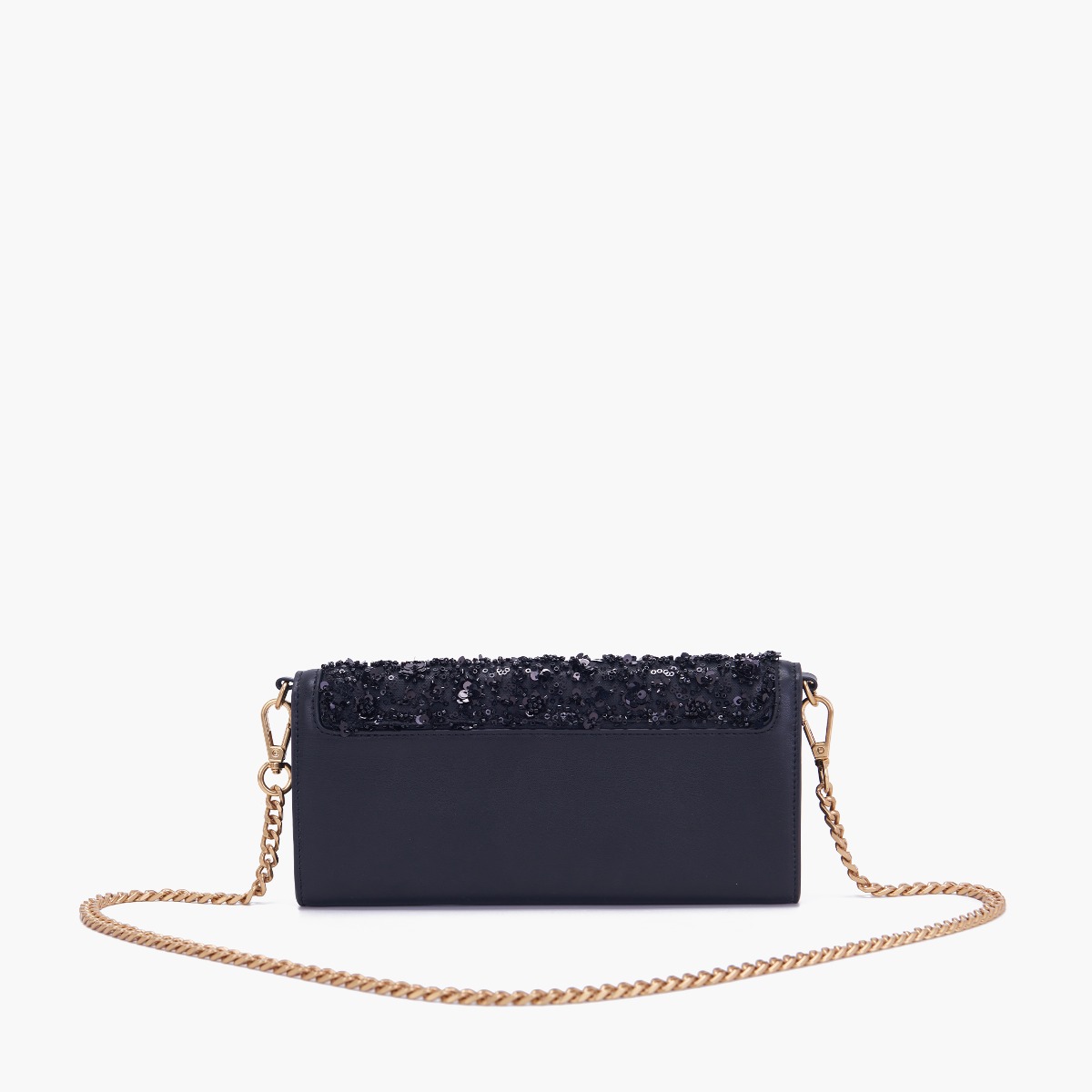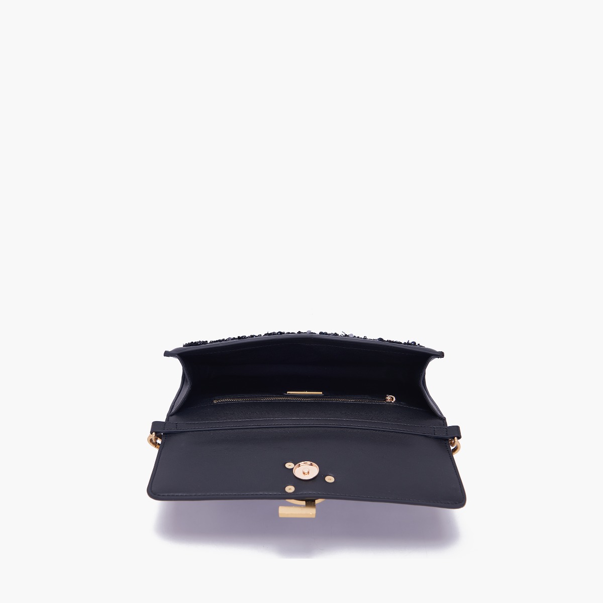 pochette in seta con paillettes sulla patta e tracolla rimovibile.