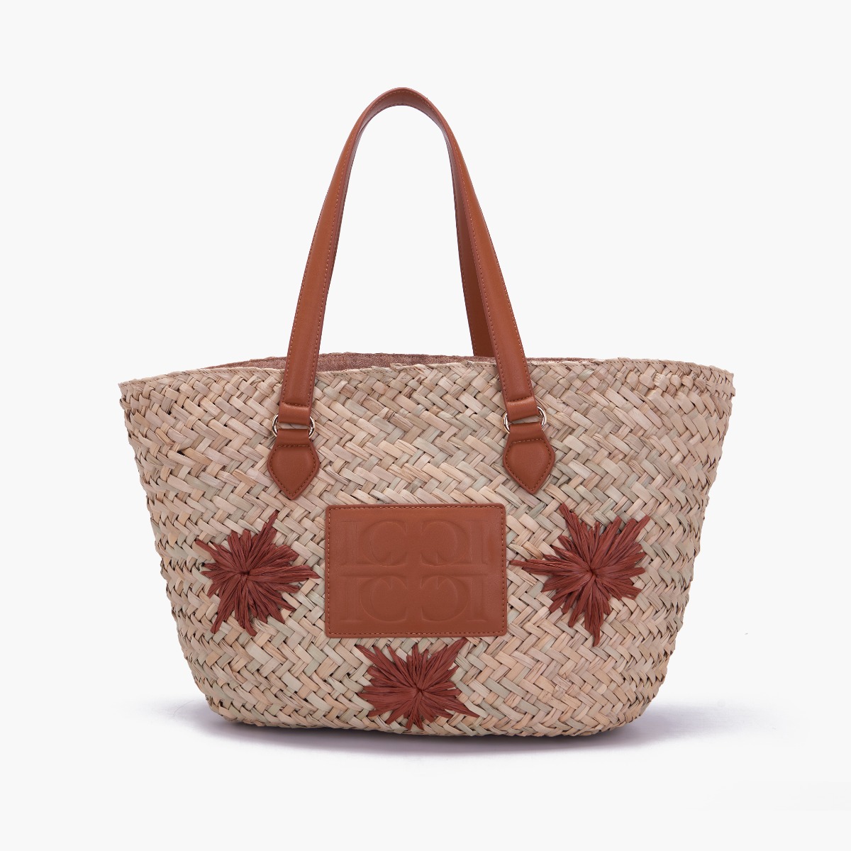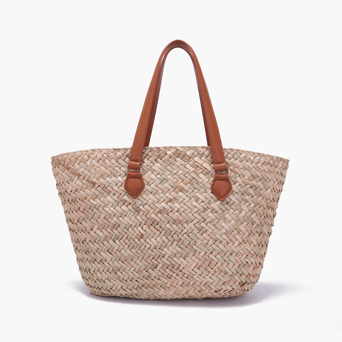 borsa shopping in rafia con decorazioni in raffia colorate e doppi manici.