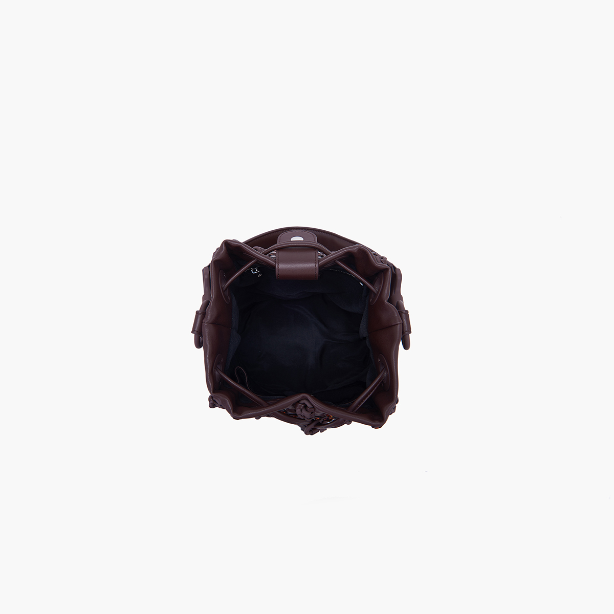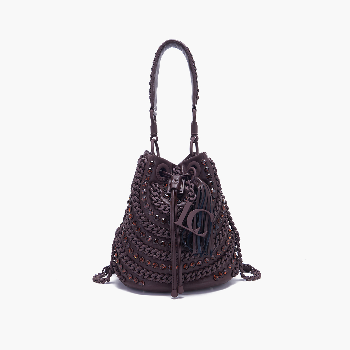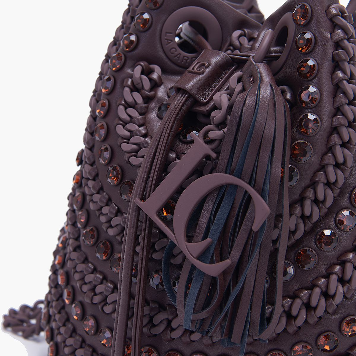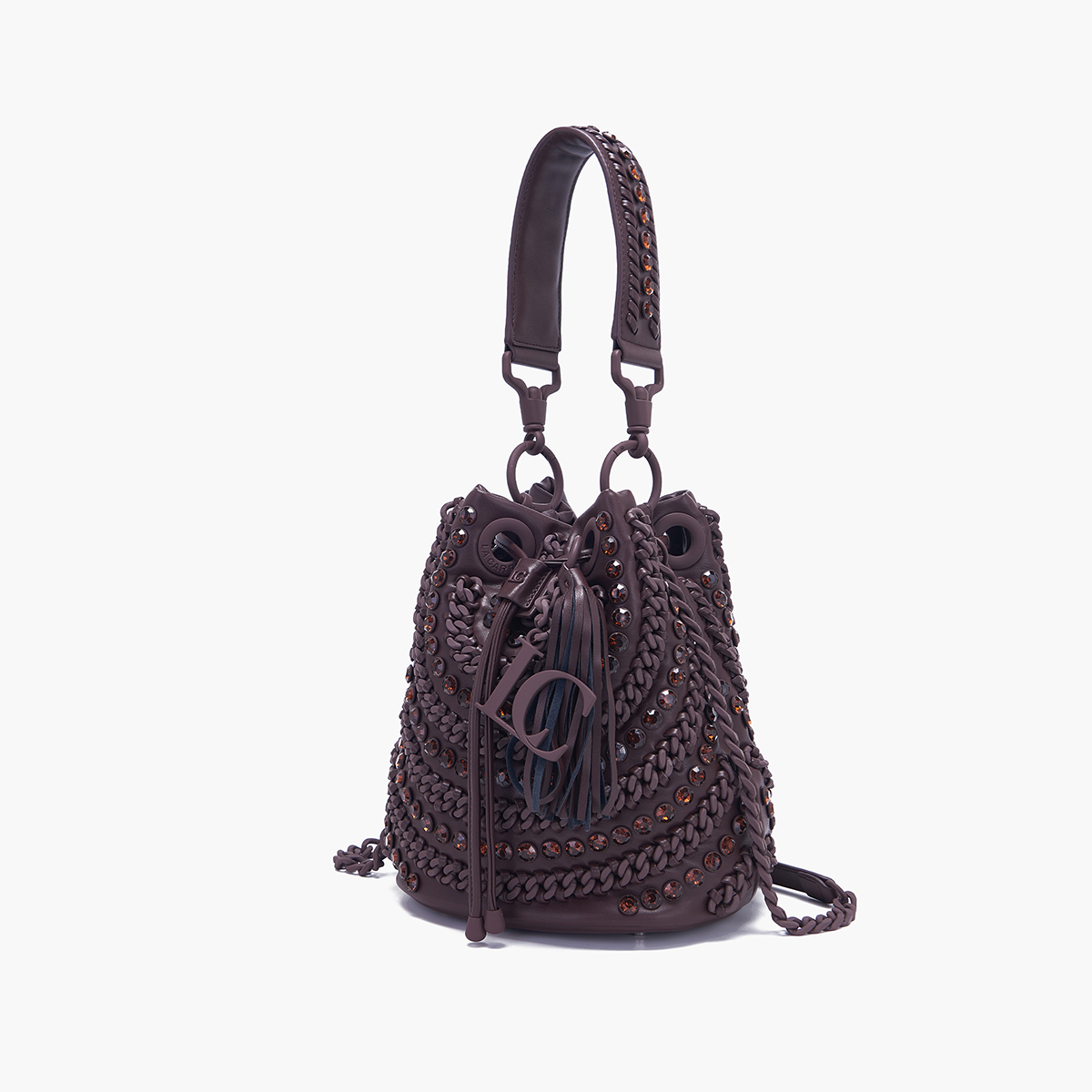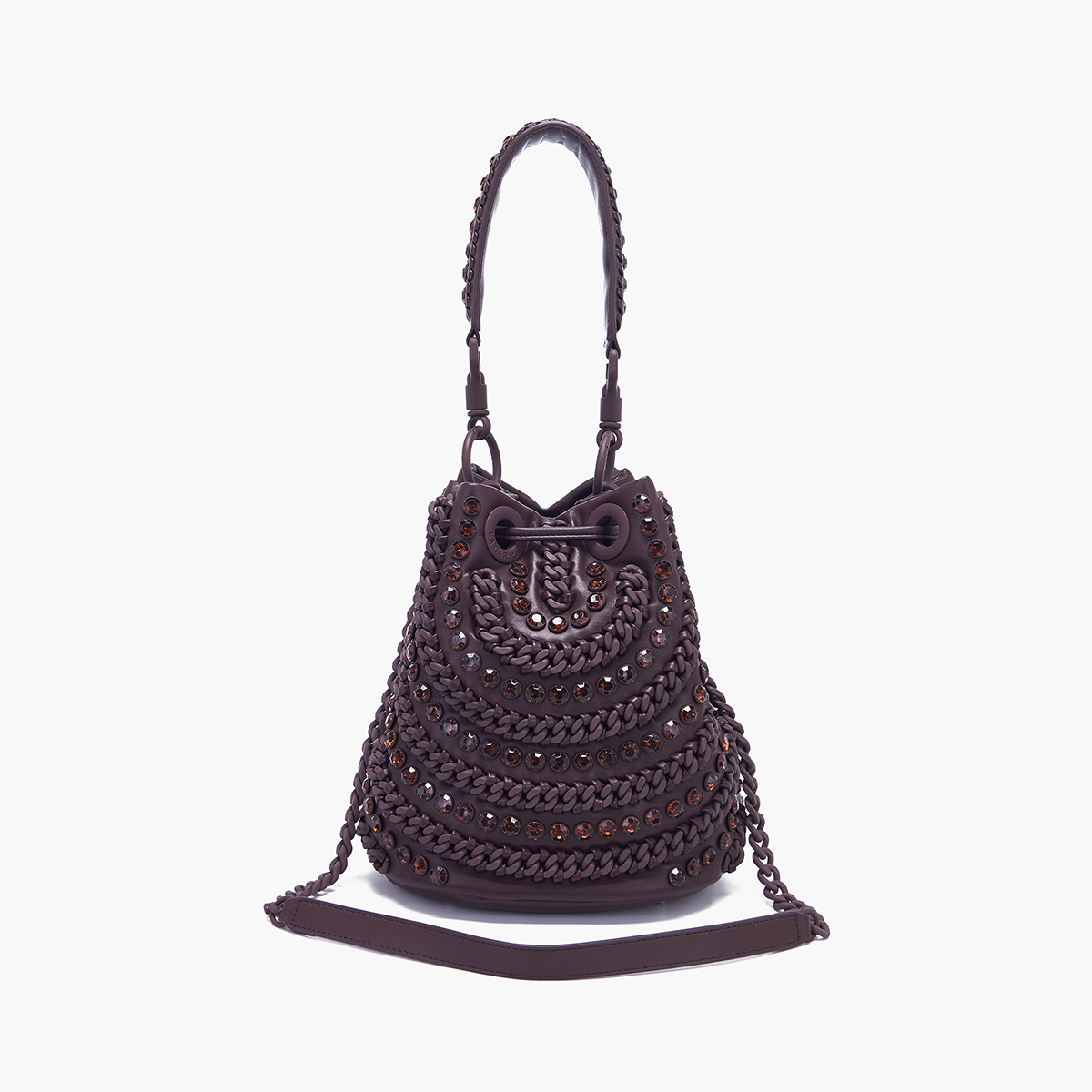 secchiello in pu effetto, con borchie e strass applicati su tutta la borsa, tracolla rimovibile.