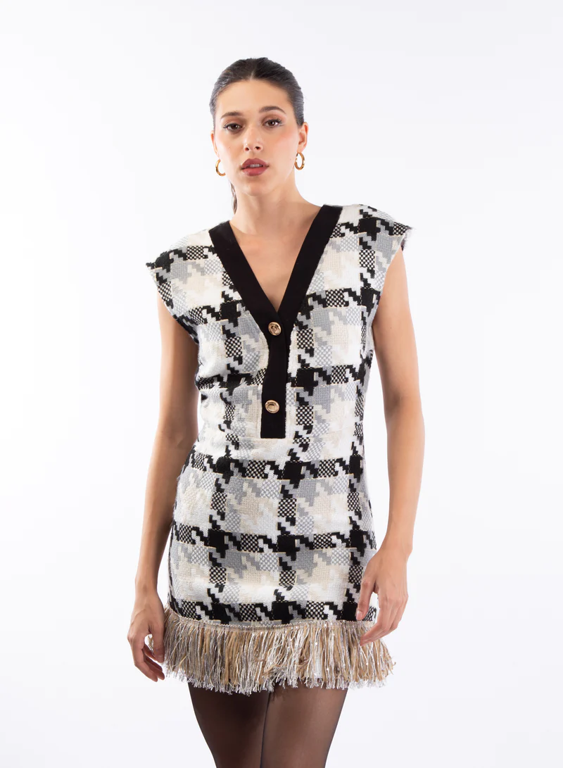 Abito in tweed con scollo a V e bottoni logati oro. Dettaglio frange sul fondo