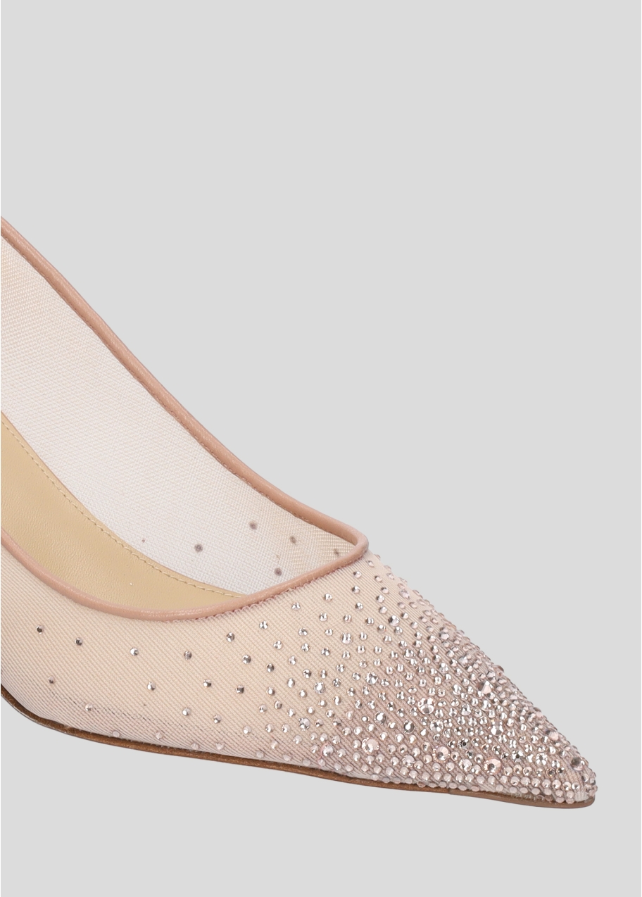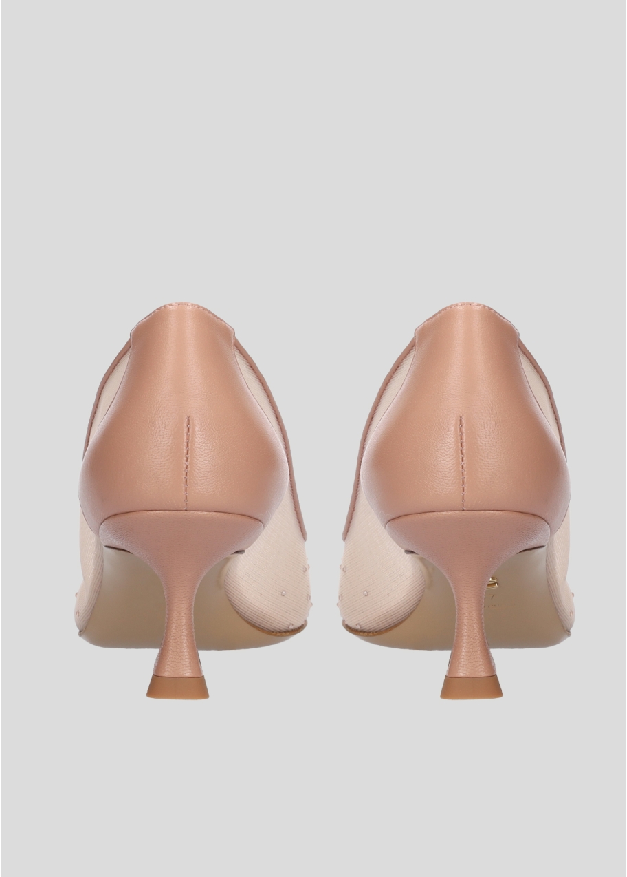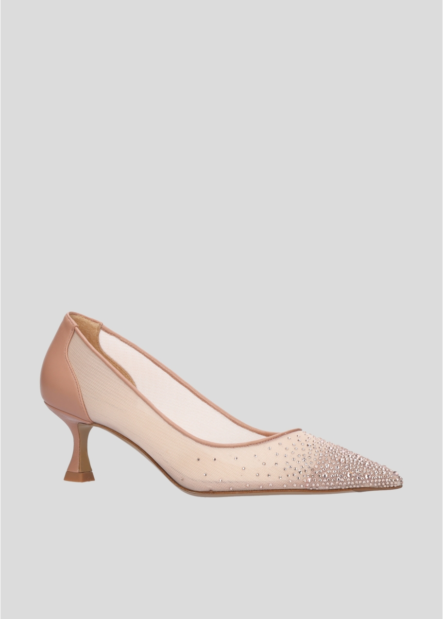 Decolletes in retina con punta e tallone in pelle, tacco da 5,5cm, punta ricoperta di strass tono su tono.