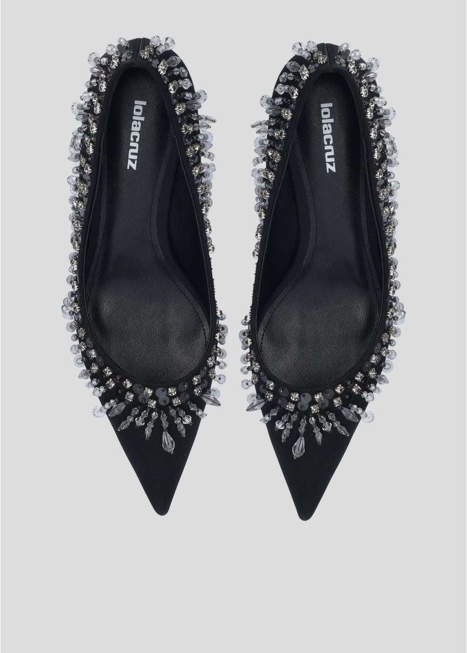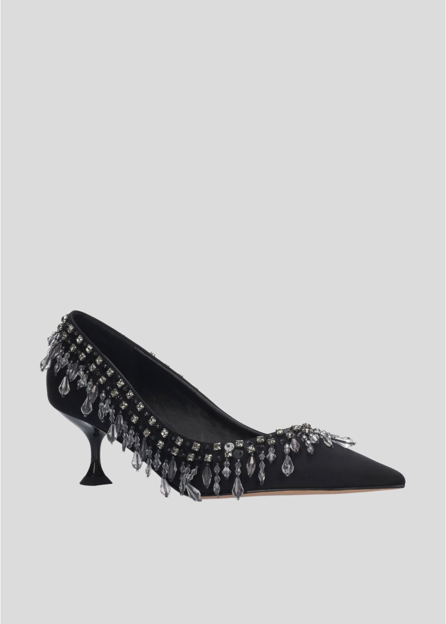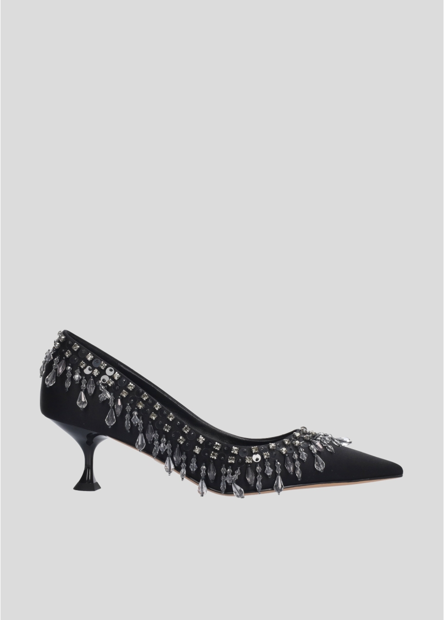 Decolletes in vera pelle, tacco 5,5cm, rivestimento in raso con decorazione di ciondoli e pietre.
