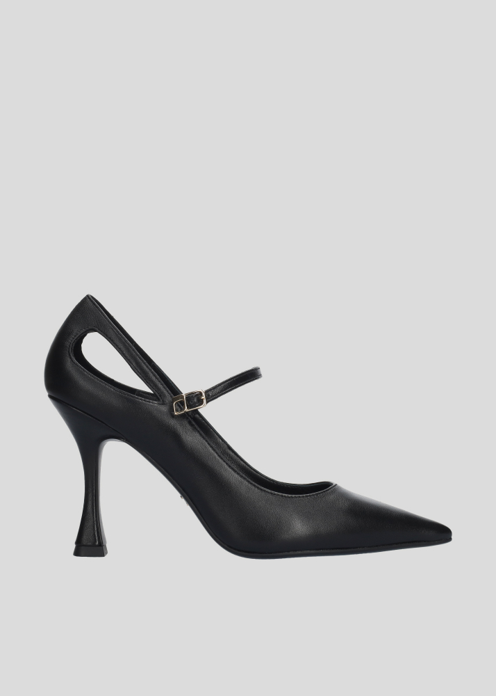 Decolletes con cinturino sul collo del piede, apertura laterale, fibbia a logo. Tacco 9cm.