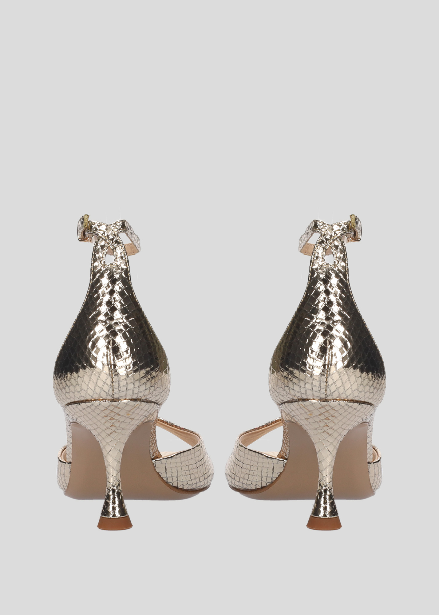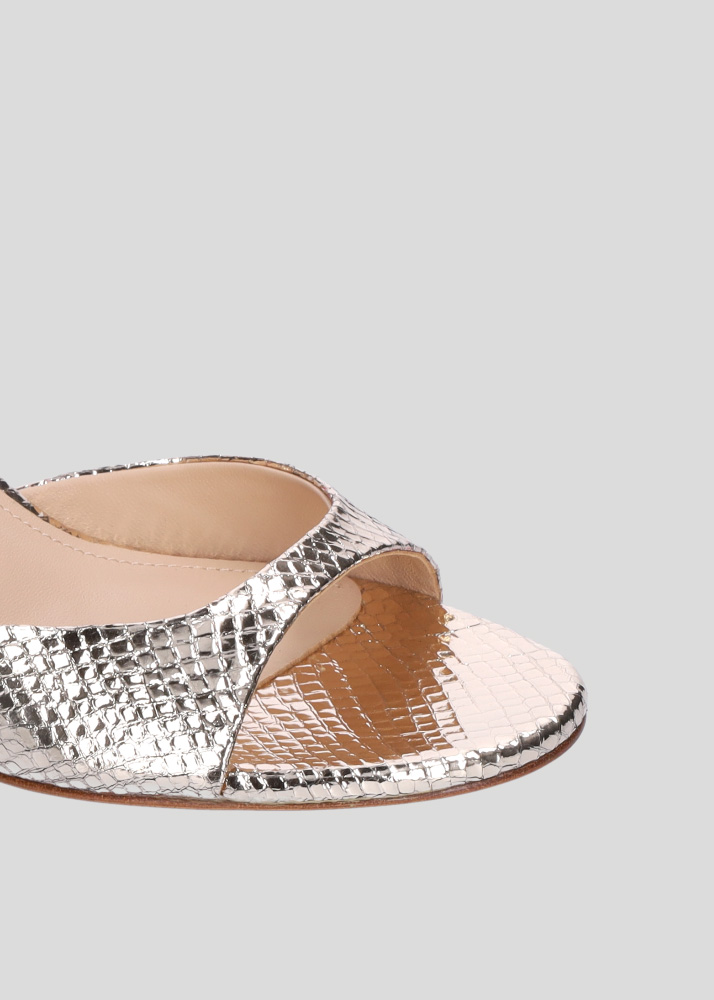 Sandali con tacco in pelle, punta tonda con serpente metallico e bracciale regolabile