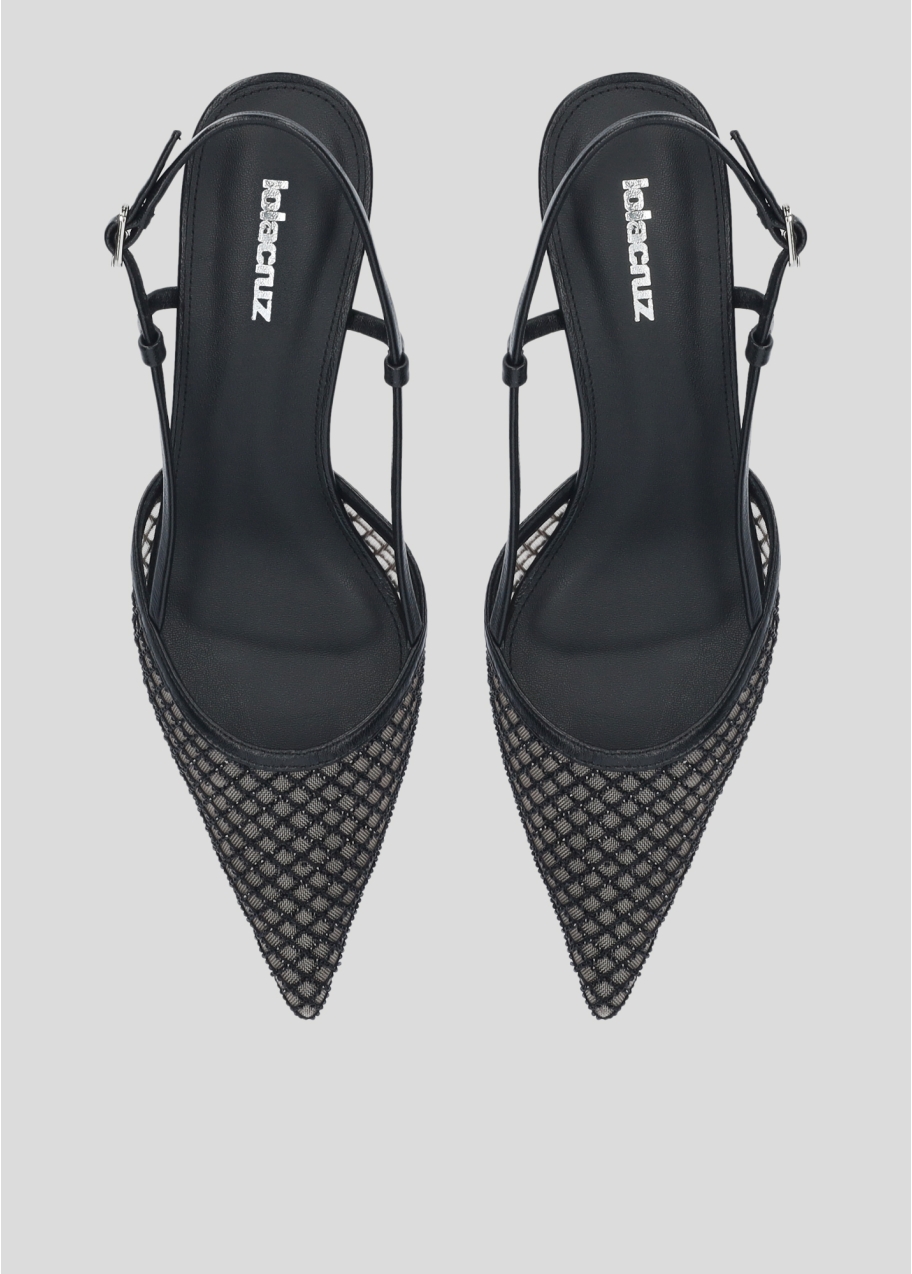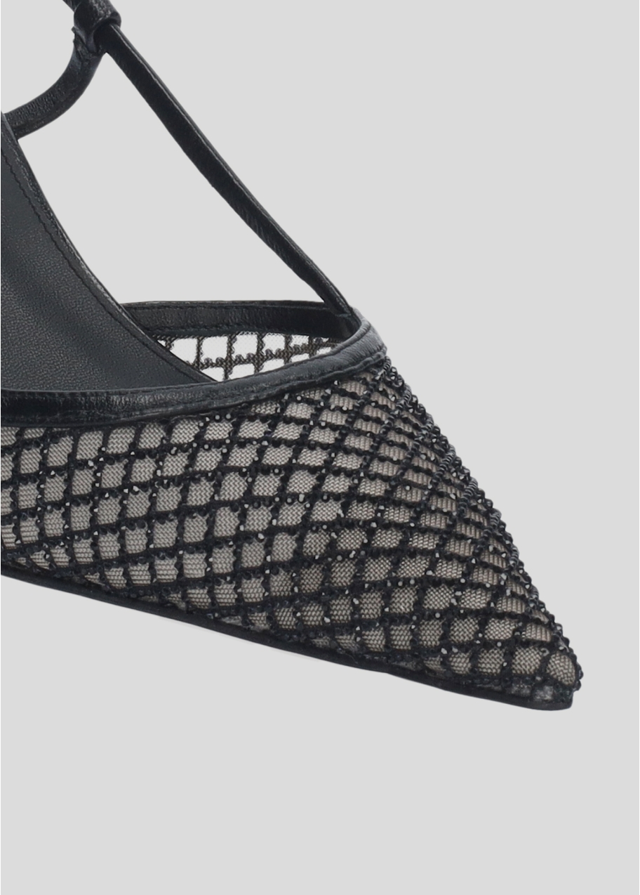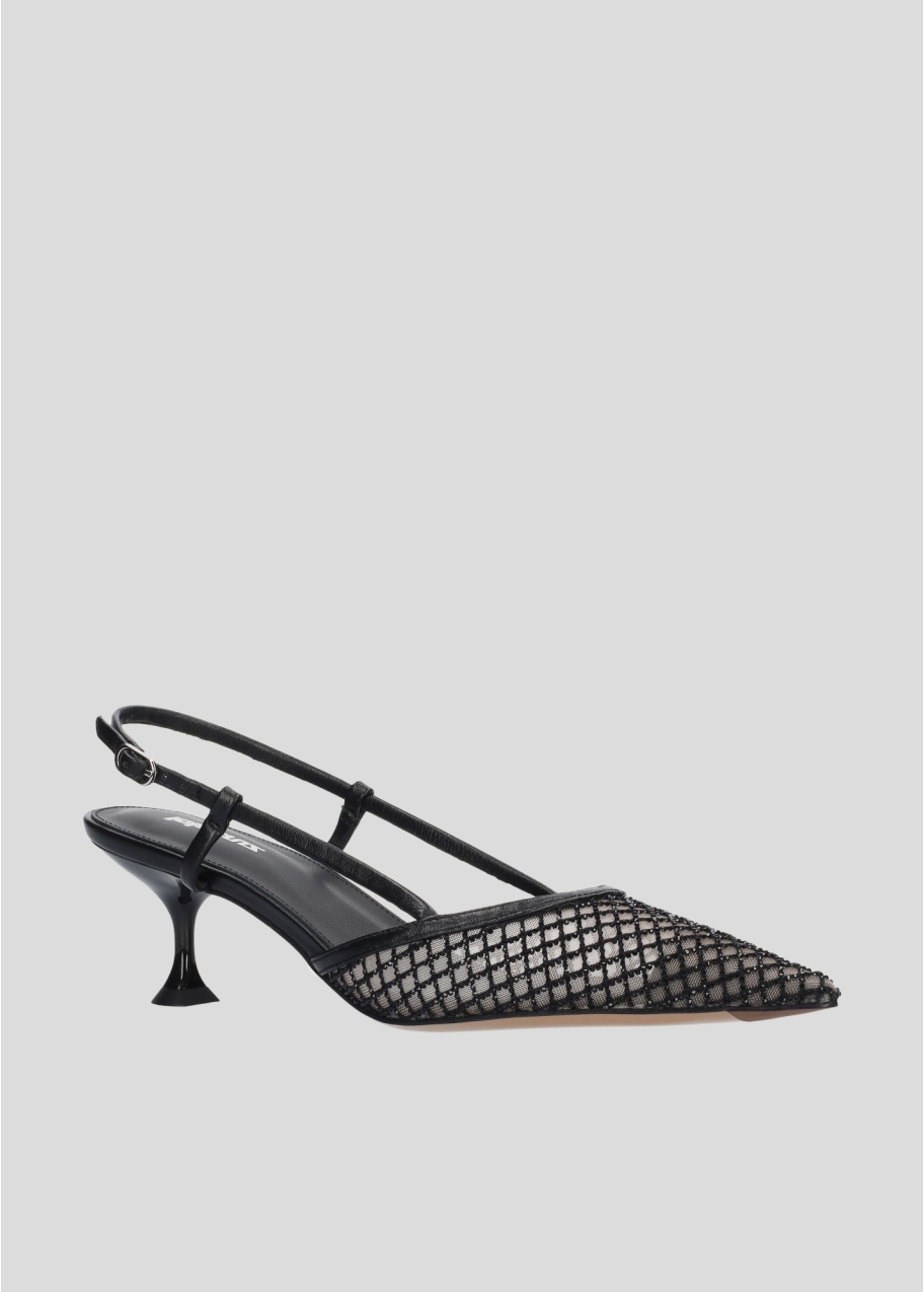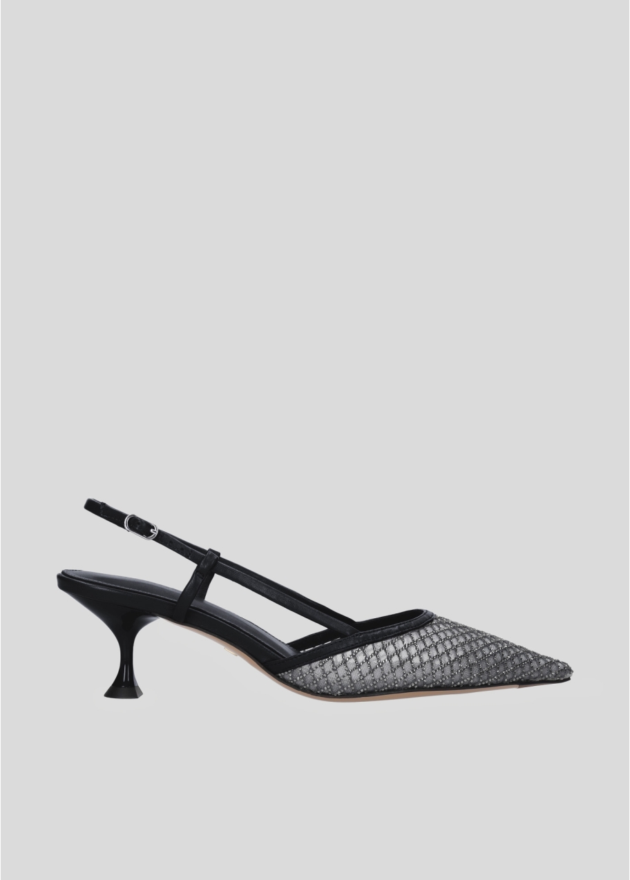 Slingback in pelle, tacco lucido da 5,5cm, cinturino alla caviglia, retina full strass tono su tono.