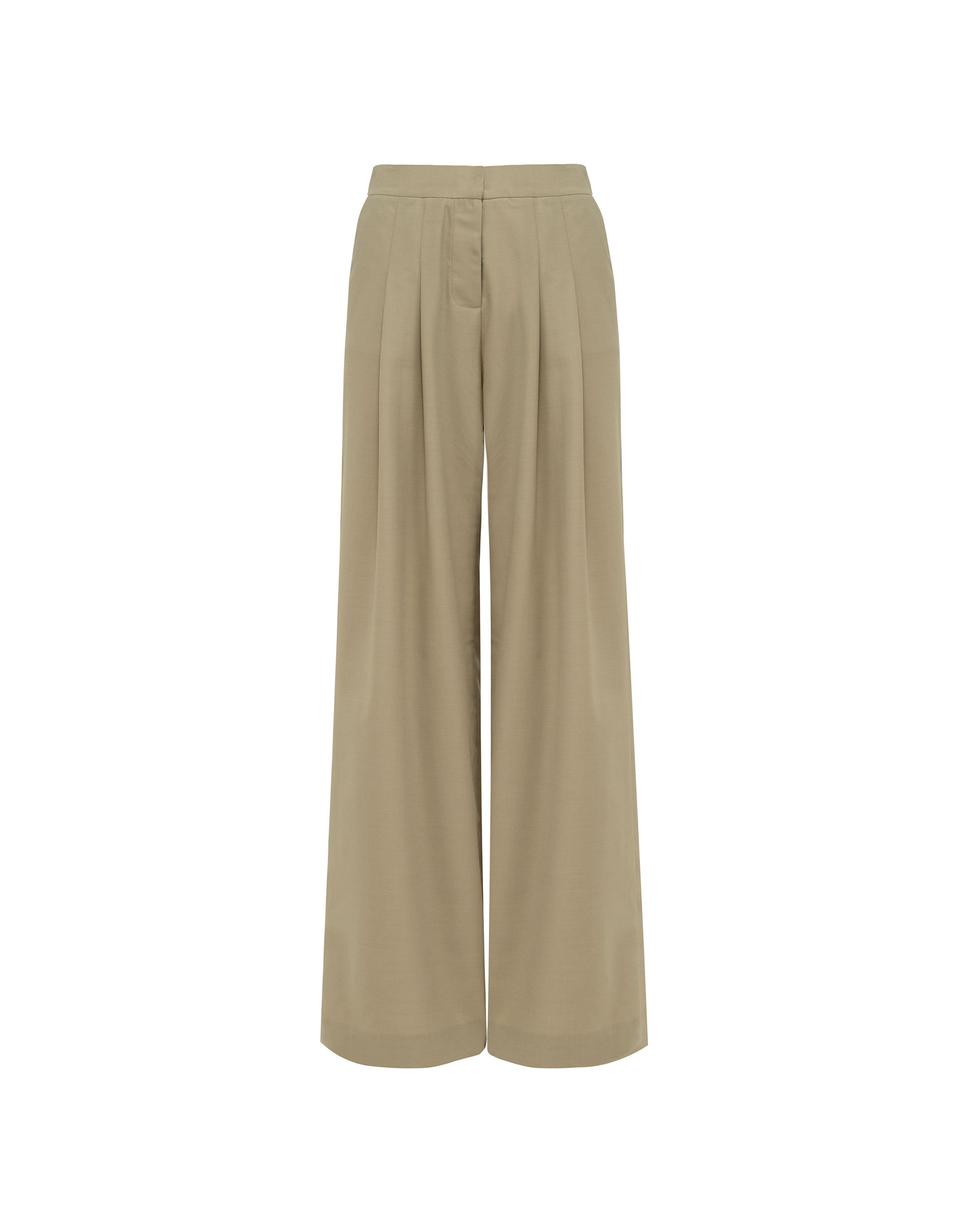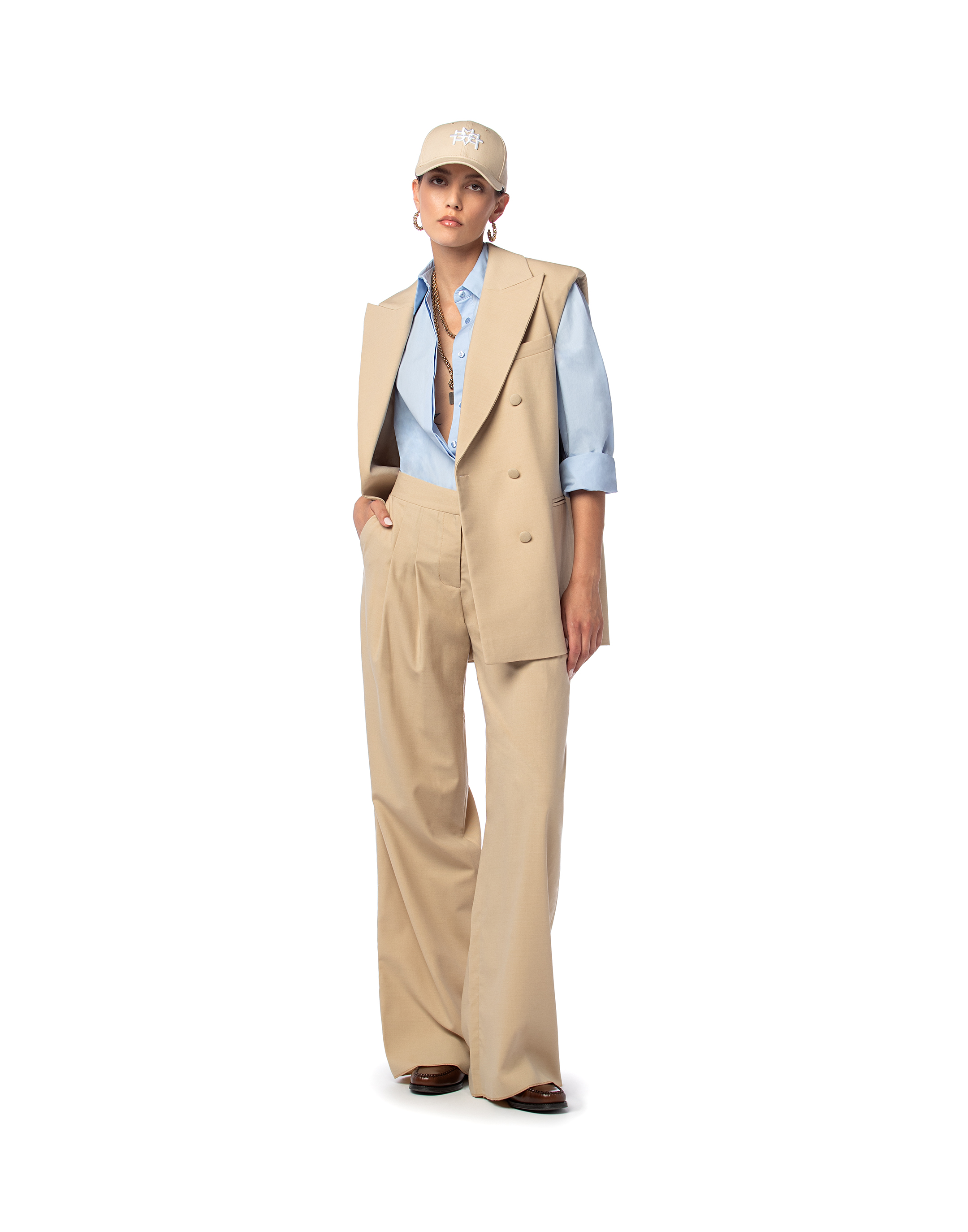 Pantalone palazzo in fresco lana a vita bassa con pince avanti. Chiusura frontale con cerniera, bottone interno e gancetto metallico.
