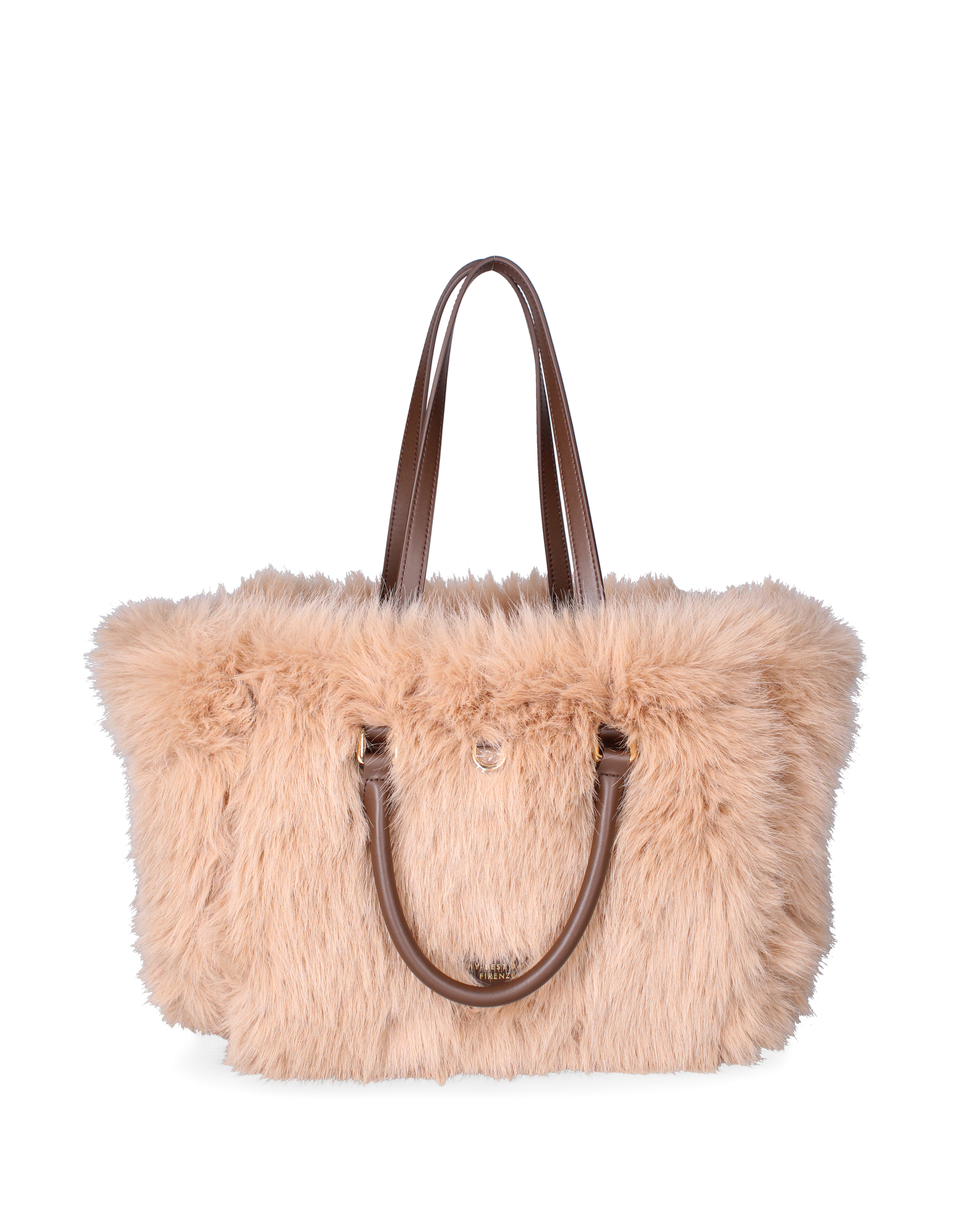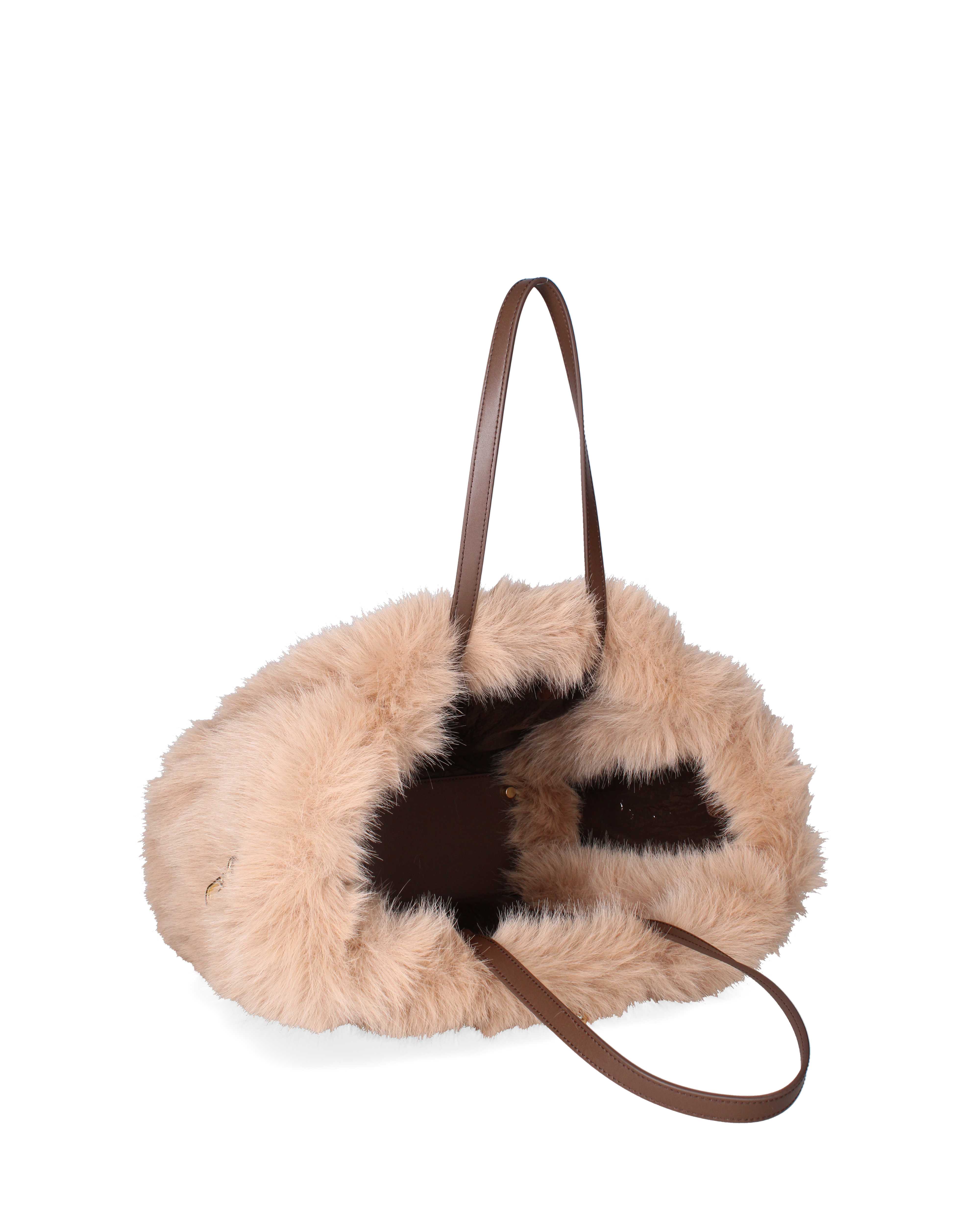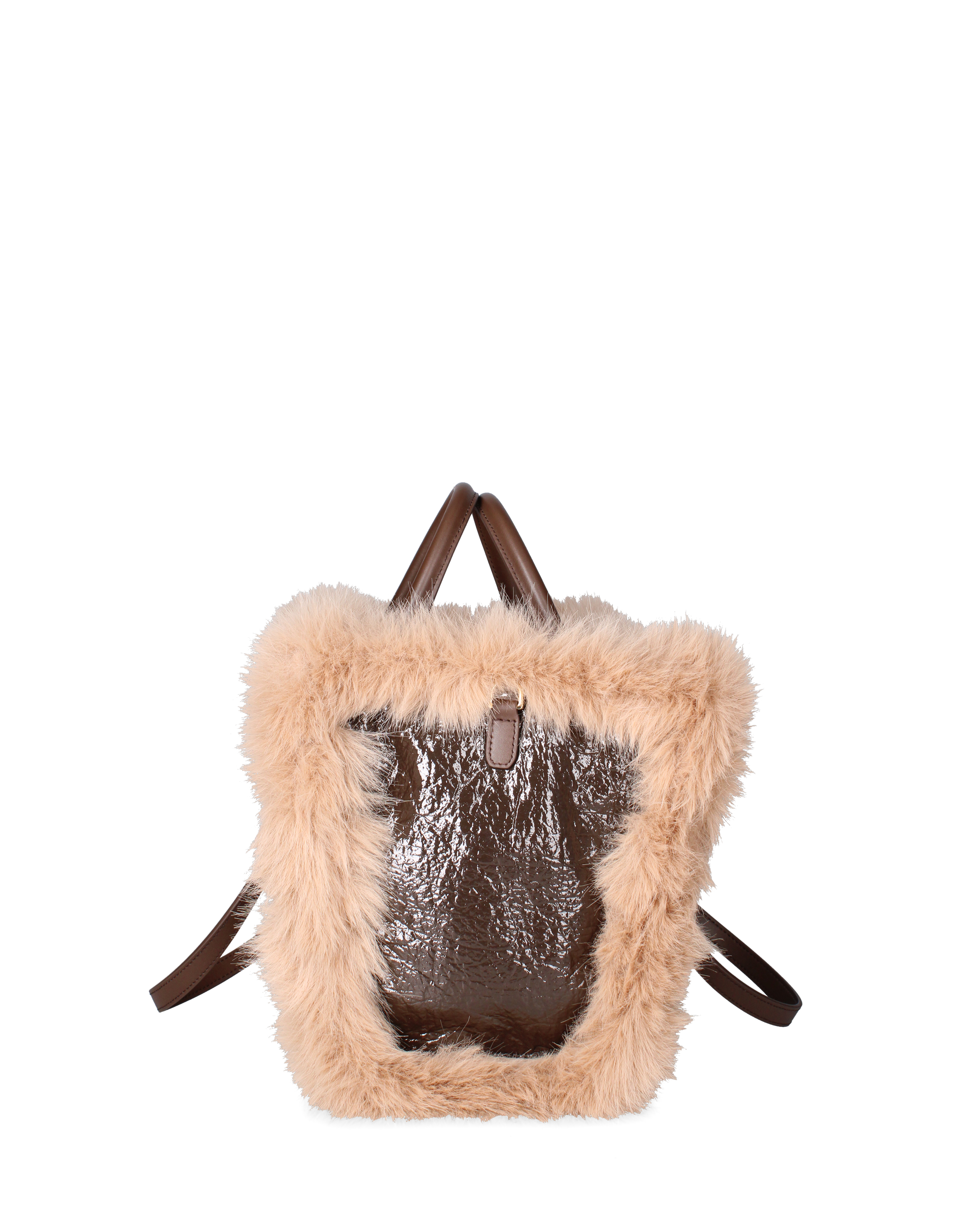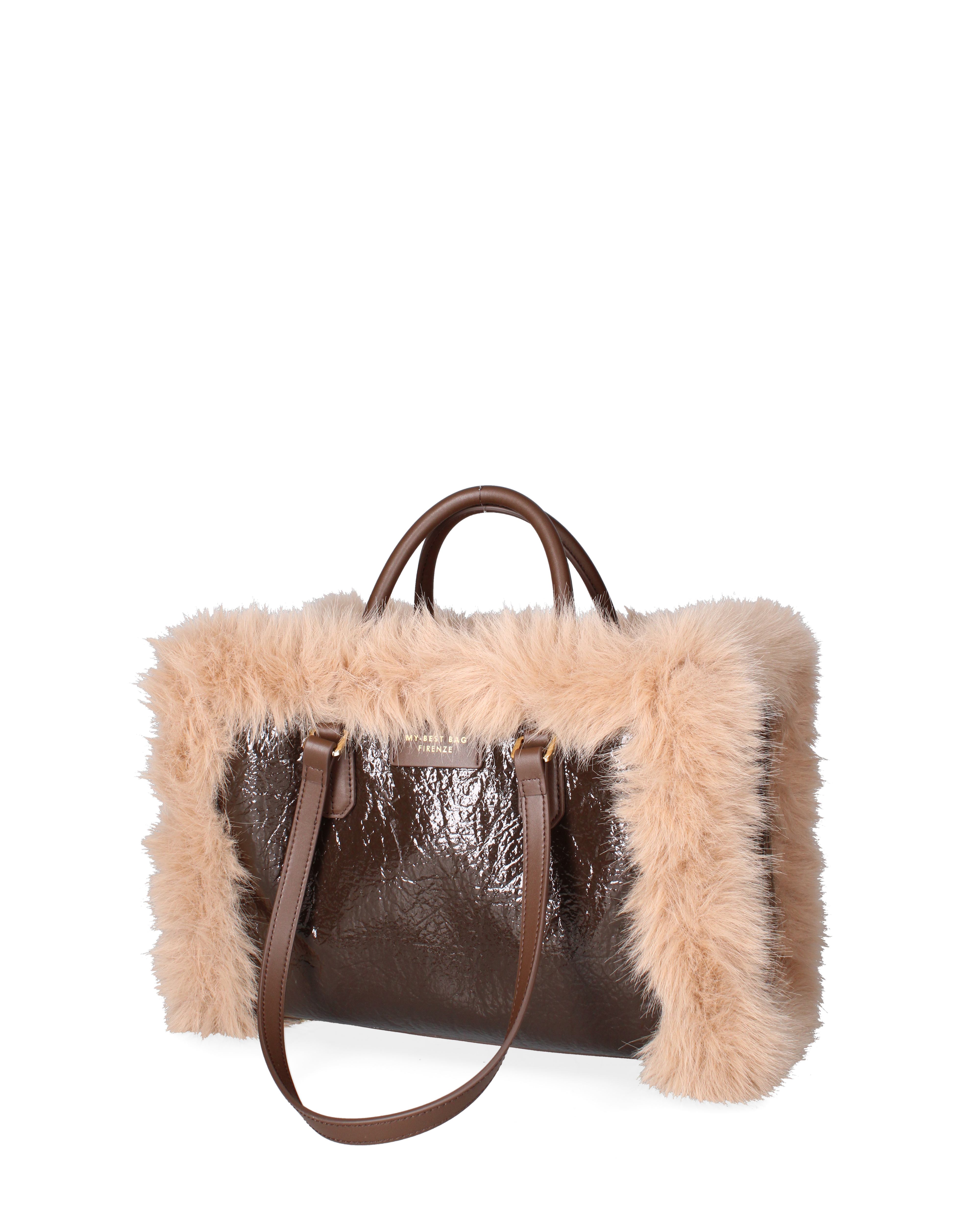 Borsa Atena con interno in ecopelliccia e pelle lucida cioccolato. Double face, con doppio manico e tracolla.