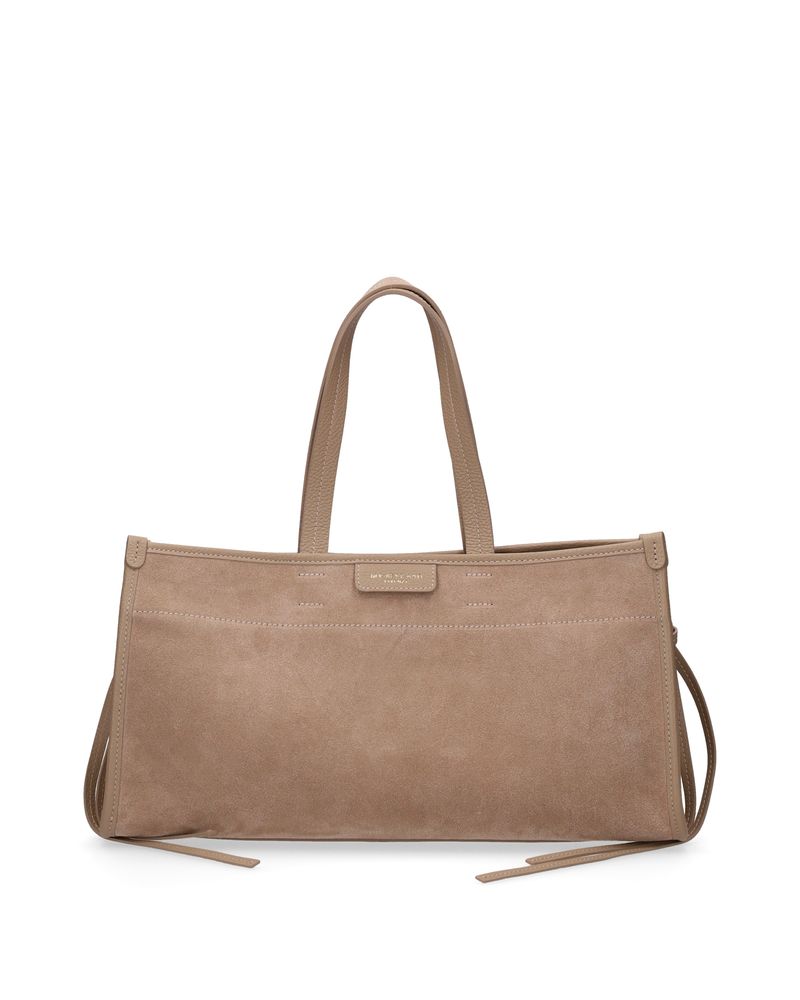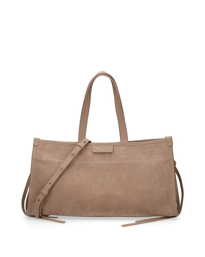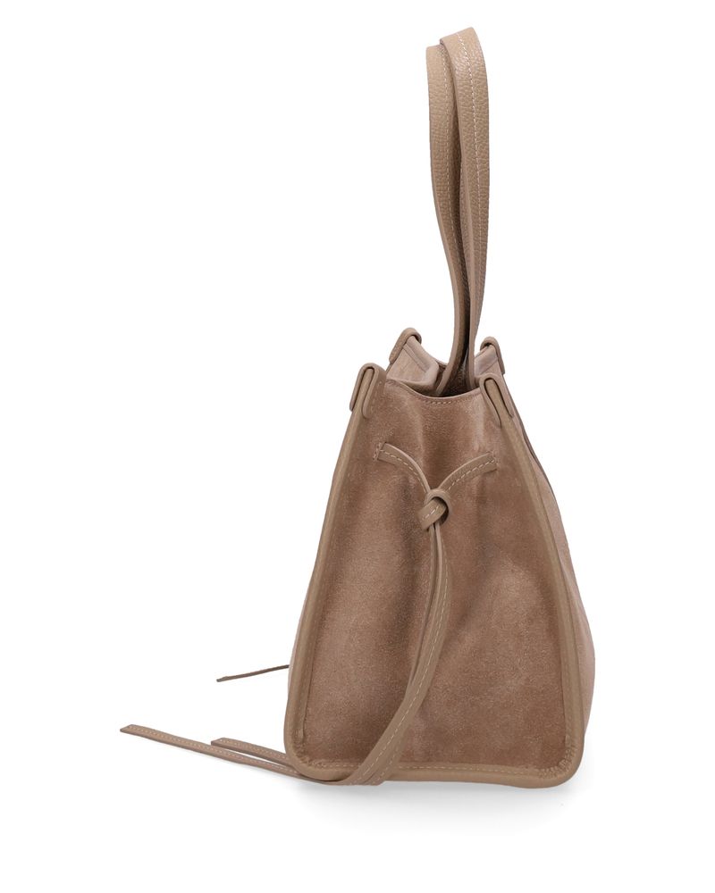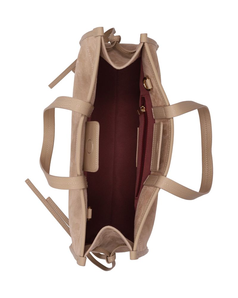 Borsa a mano in pelle suede color macaccino, dotata di tracolla aggiuntiva regolabile, dettagli del manico, delle fascette alterali e della rifinitura in pelle, tasca interna con zip, chiusura con calamita.