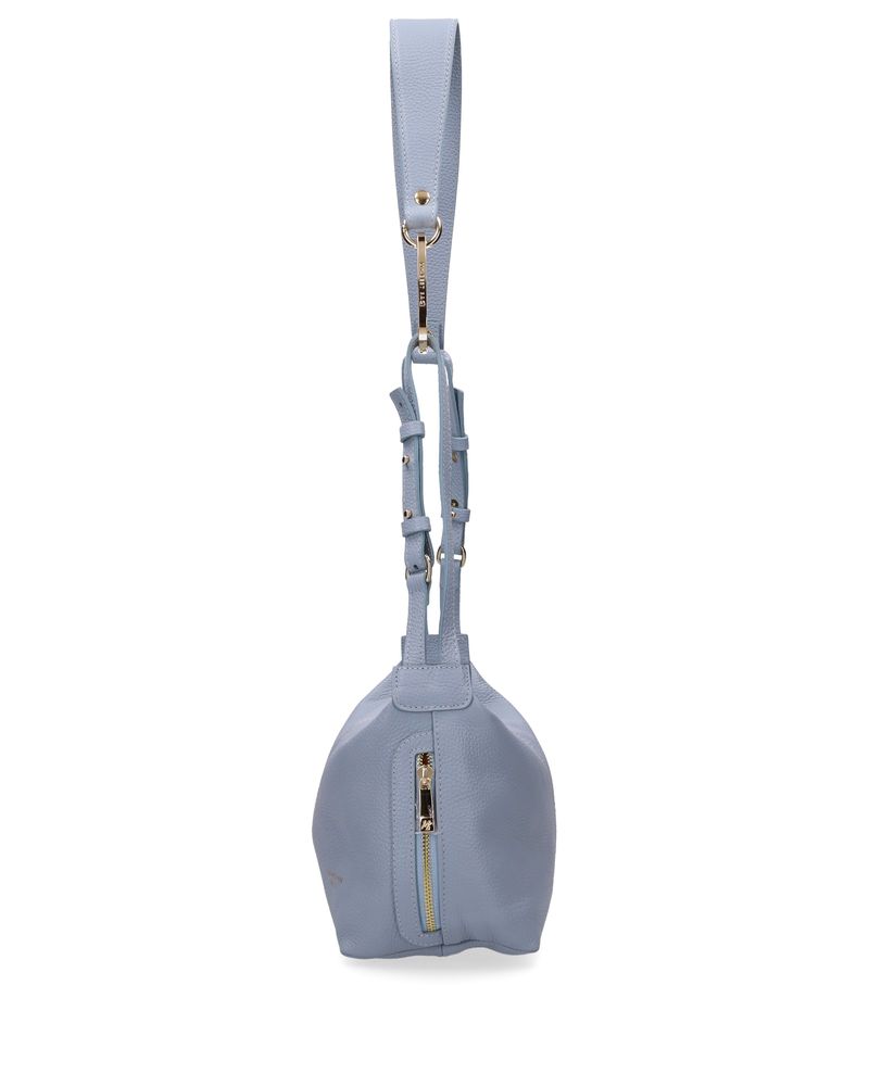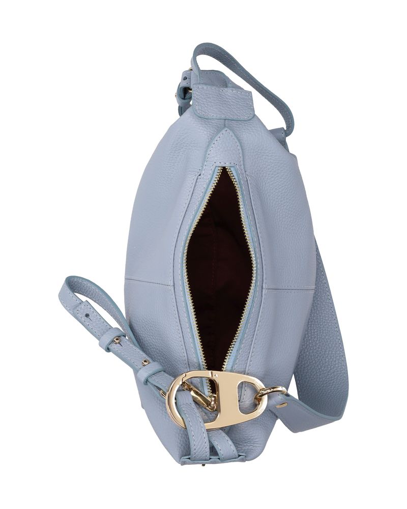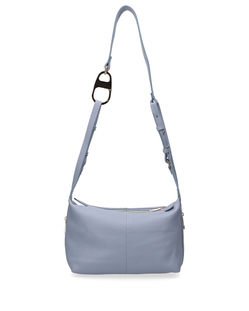 Borsa Doria in pelle dollaro color avio, cucitura trasversale, tracolla regolabile, chiusura con zip, tasca interna con zip, taschino laterale.
