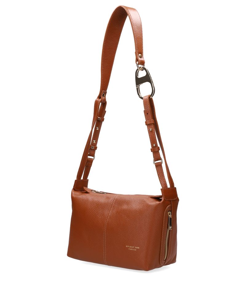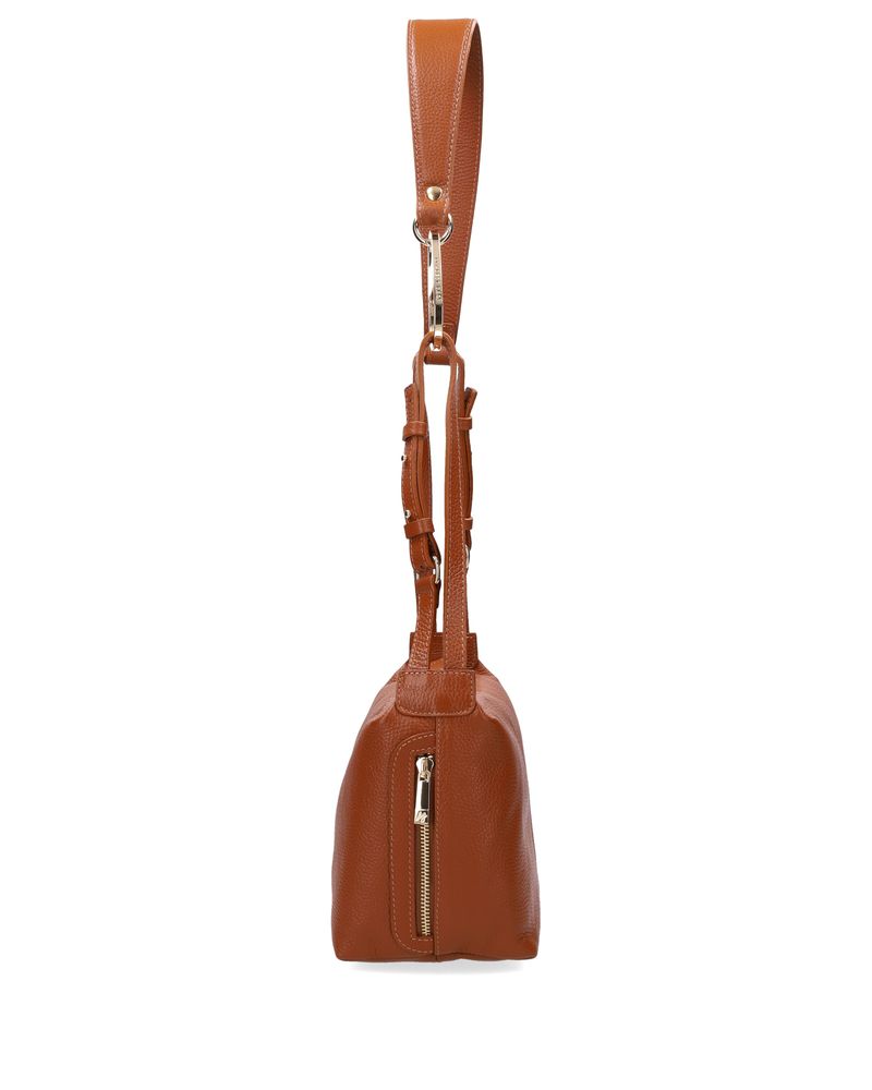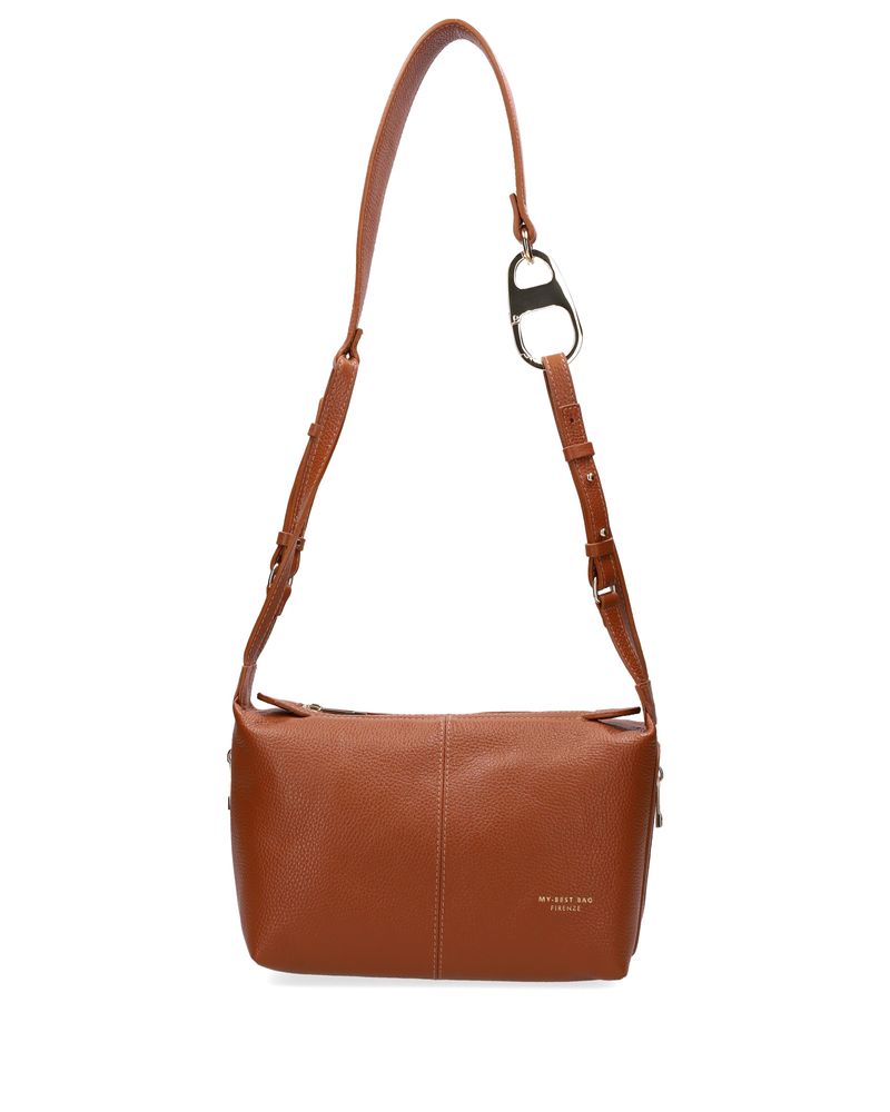 Borsa Doria in pelle dollaro color cuoio, cucitura trasversale, tracolla regolabile, chiusura con zip, tasca interna con zip, taschino laterale.