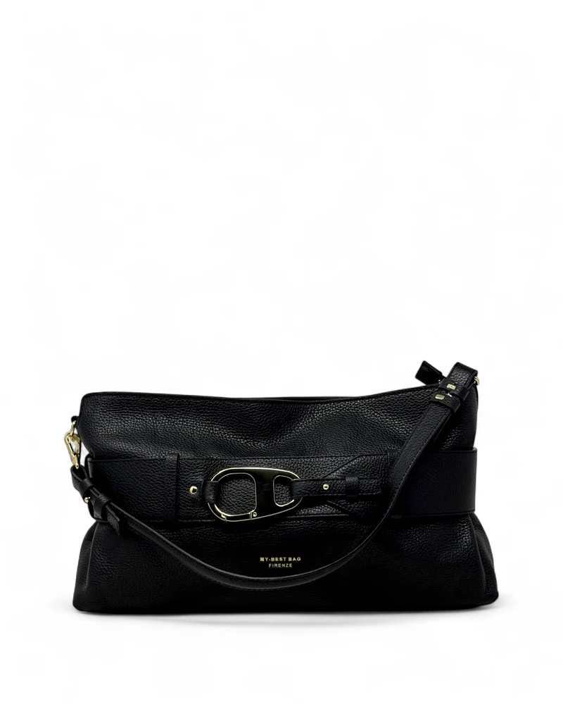 Borsa in pelle dollaro nera, doppia tracolla di cui una più lunga regolabile, fascia con passanti con moschettone oro, chiusura con zip.