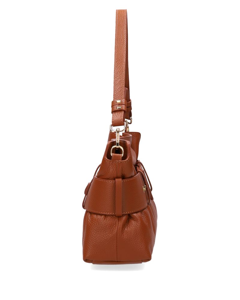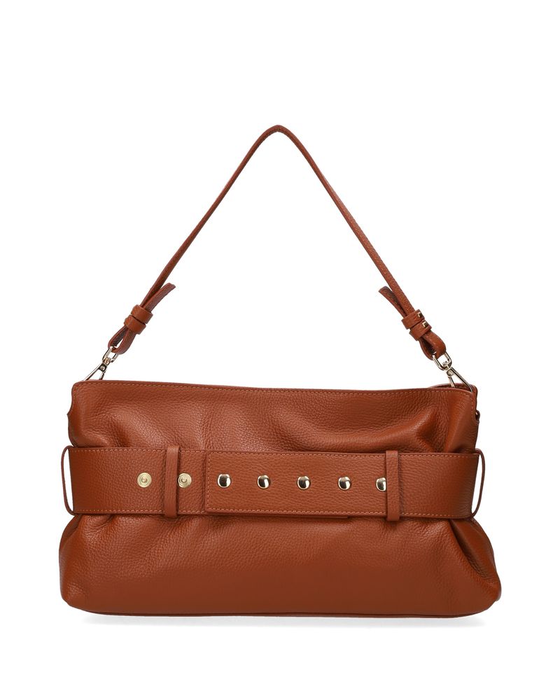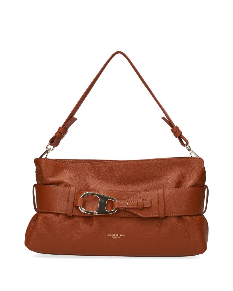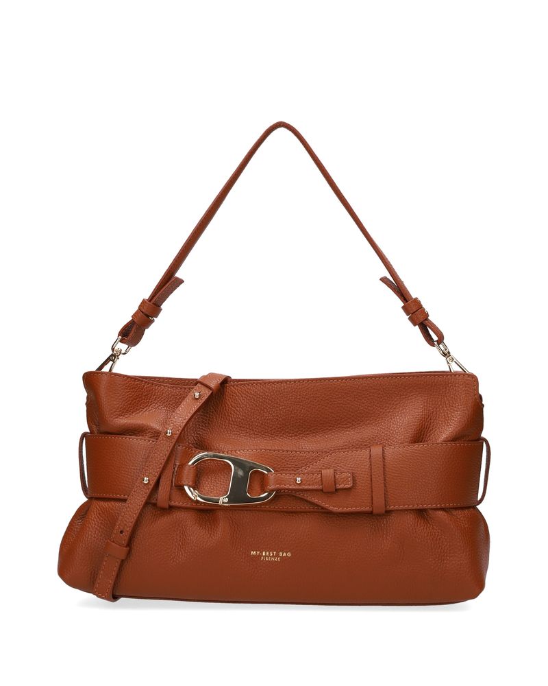 Borsa in pelle dollaro color cuoio, doppia tracolla di cui una più lunga regolabile, fascia regolabile con passanti con moschettone oro, chiusura con zip.