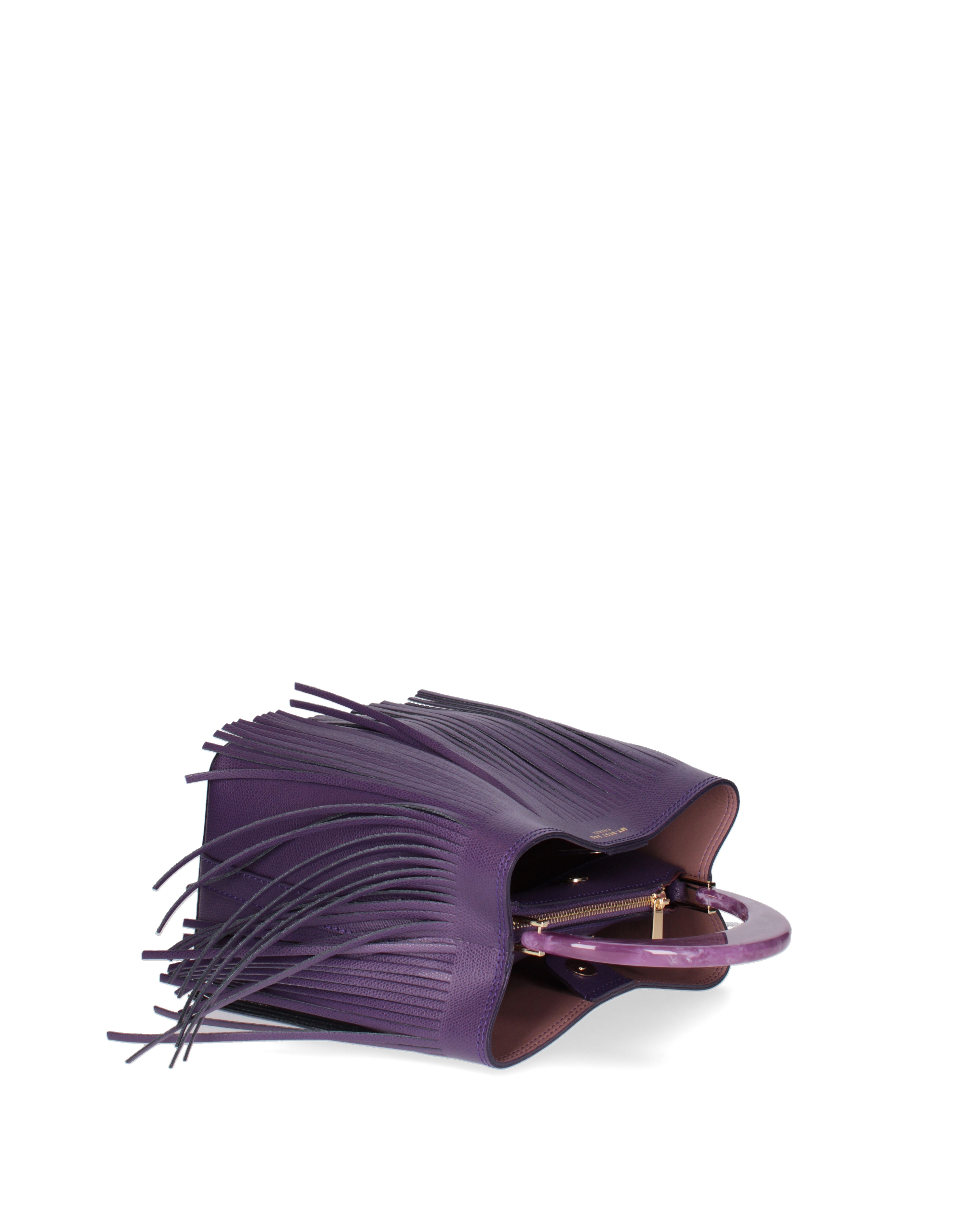 Borsa in pelle con frange, manico in duroplast effetto marmo e tracolla.