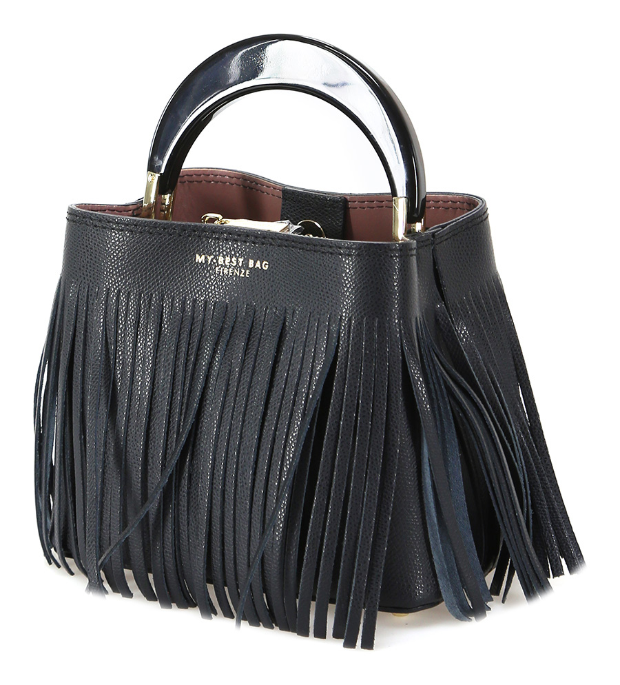 Borsa New Ingrid in pelle con frange, manico lucido rigido e tracolla in pelle.