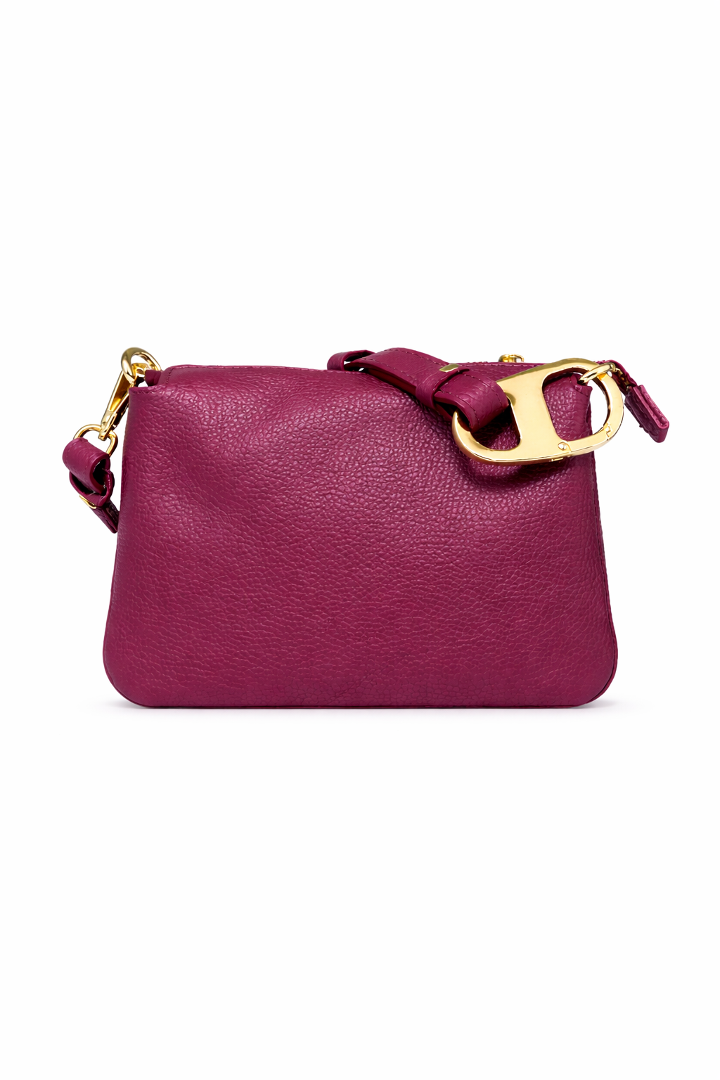 Borsa Reflex piccola color carminio in pelle dollaro, tre scomparti, chiusura con zip, tracolla più corta con moschettone oro, tracolla lunga regolabile.