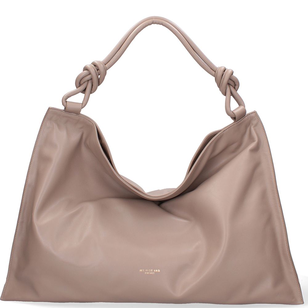 Borsa grande in pelle, modello schiacciato, con chiusura a cerniera e nodi sulle maniglie.