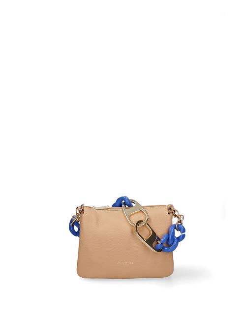 Reflex piccola con catena blu, moschettone oro, completa di tracolla in pelle, tre scomparti con zip.