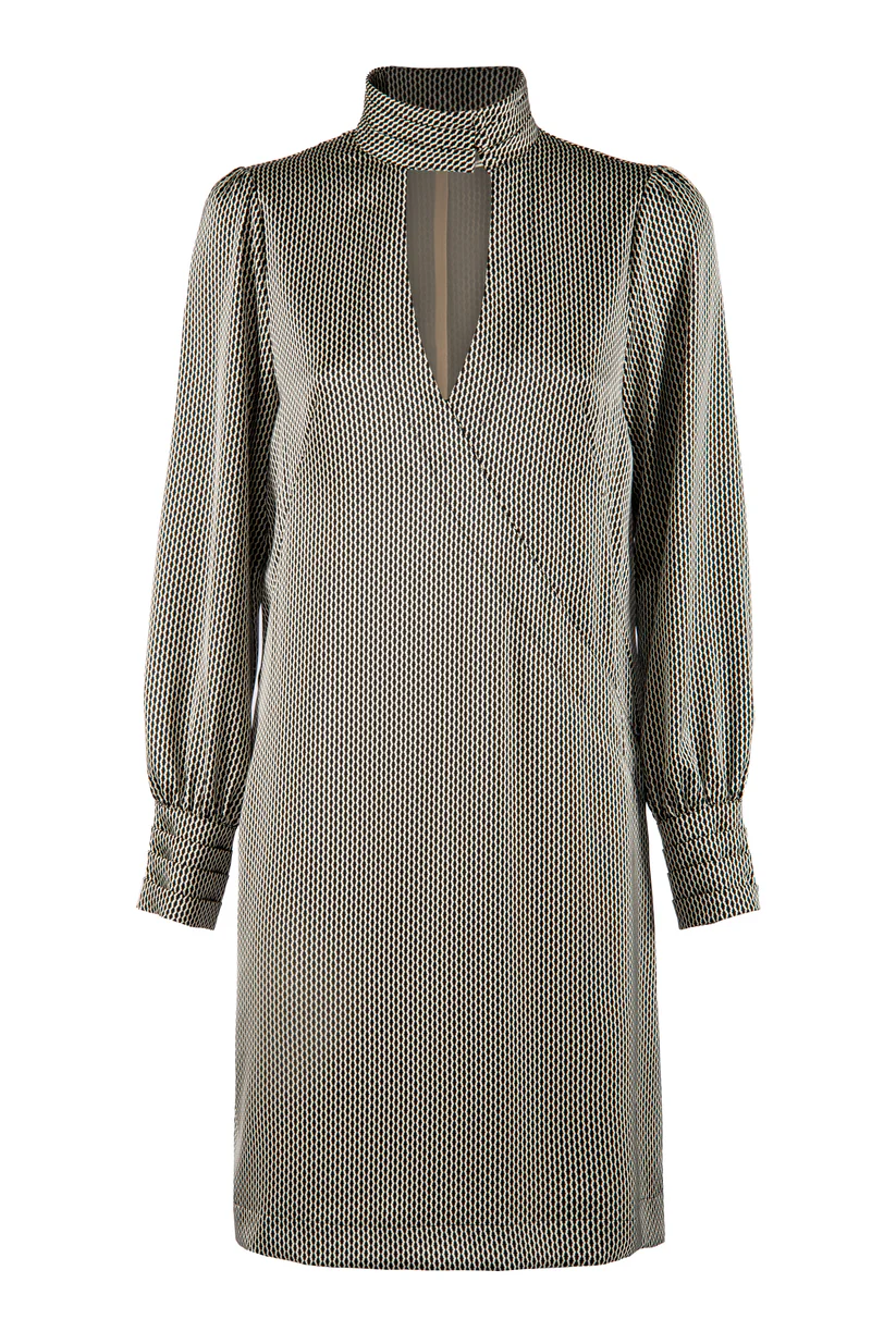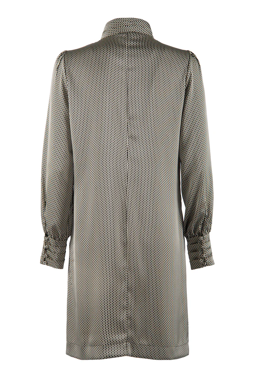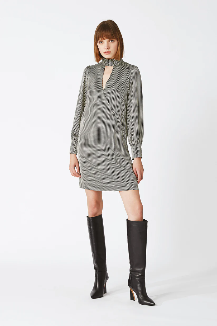 Abito corto con micro-stampa geometrica in raso di poly elasticizzato. Collo alto con bottoni e scollo a goccia sul davanti.