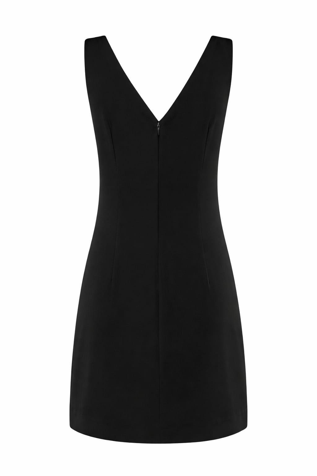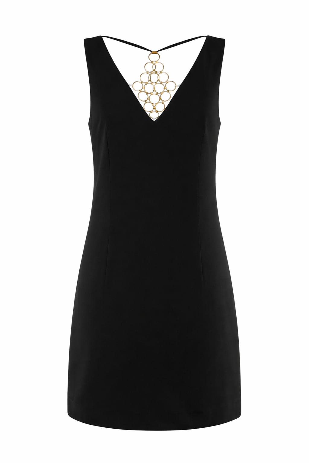Abito in cady di poly, elemento decorativo metallico sul davanti, scollo a v sulla schiena.