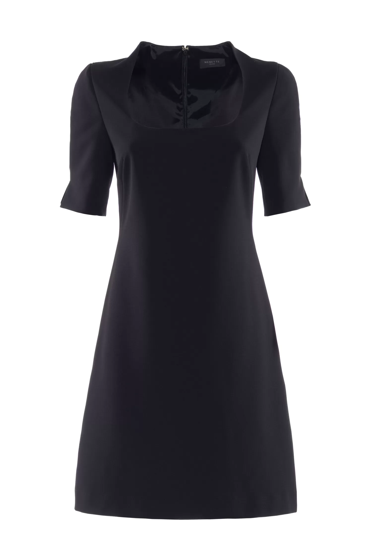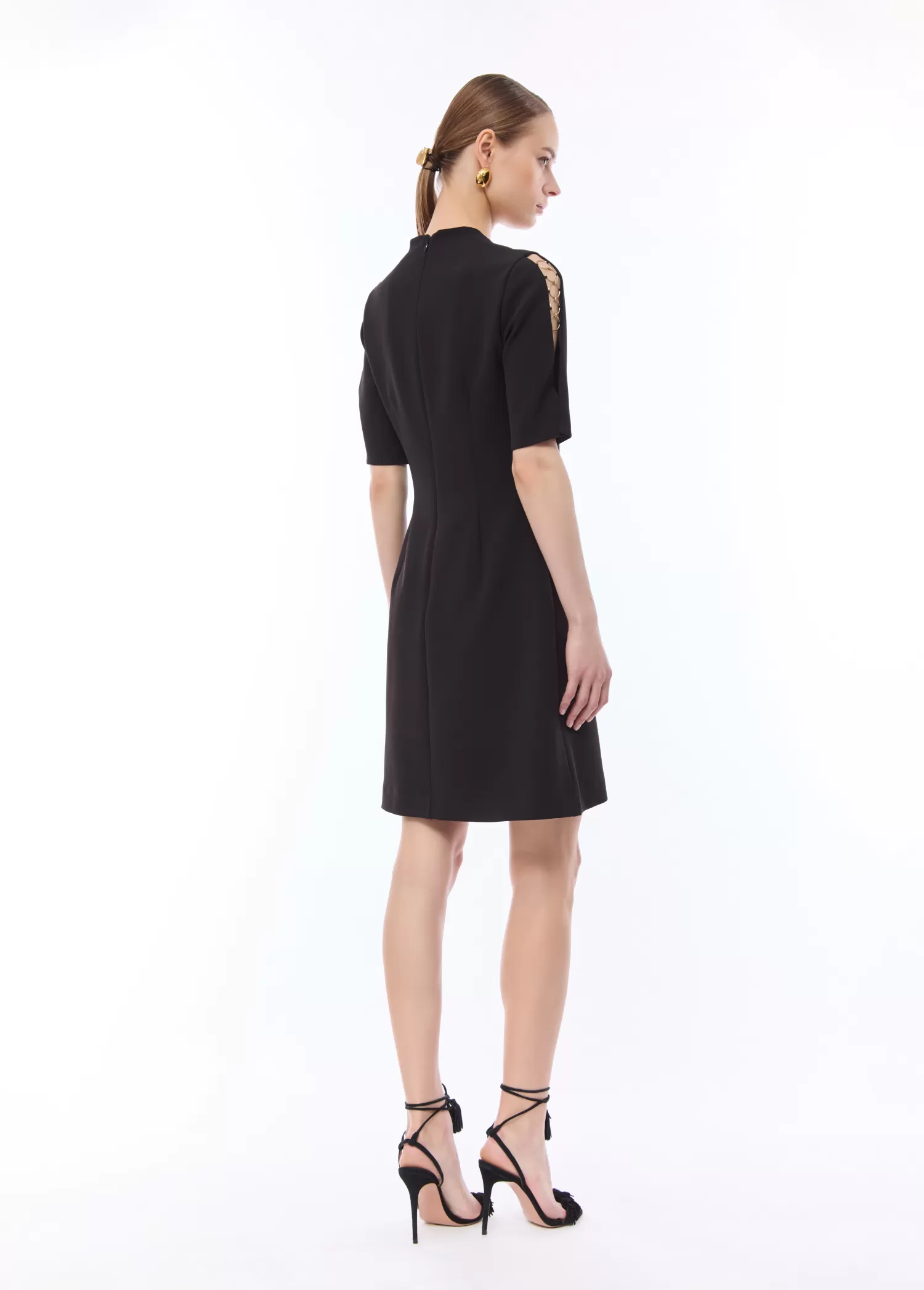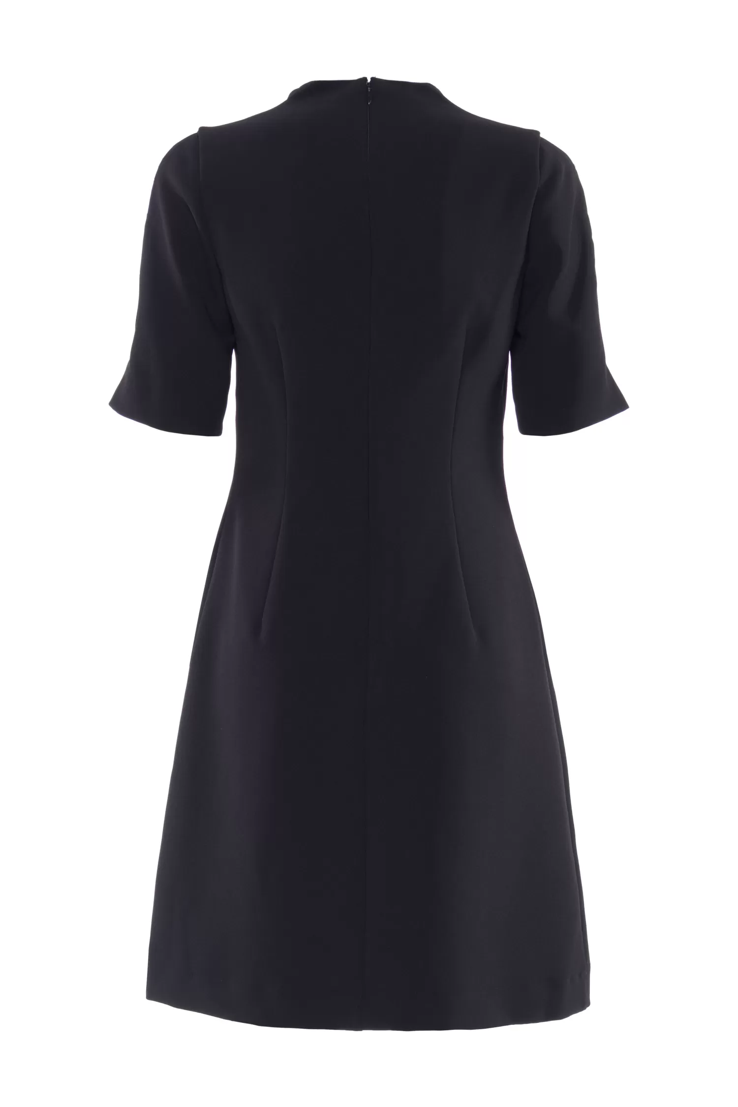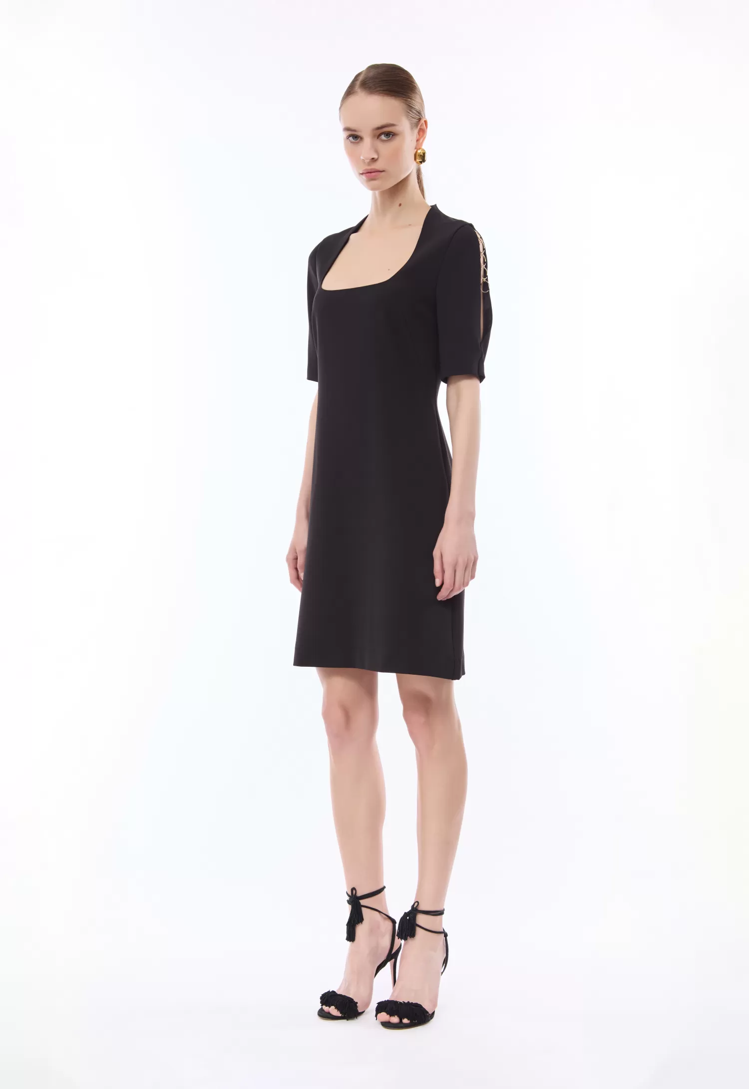 Abito a tubino in cady, scollo quadrato, maniche con dettaglio catena dorata, silhouette definita, zip invisibile.