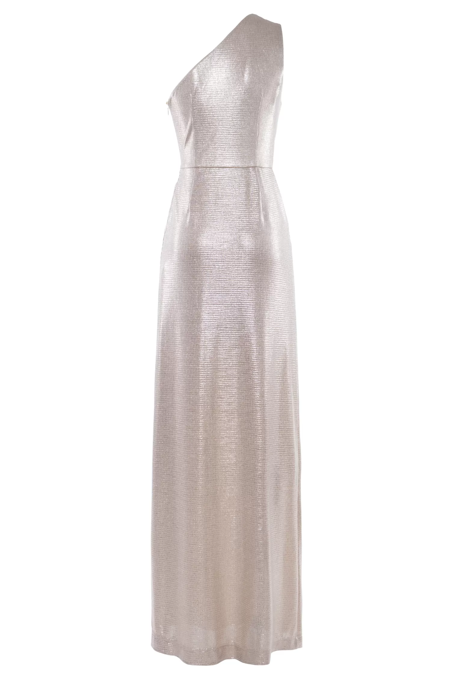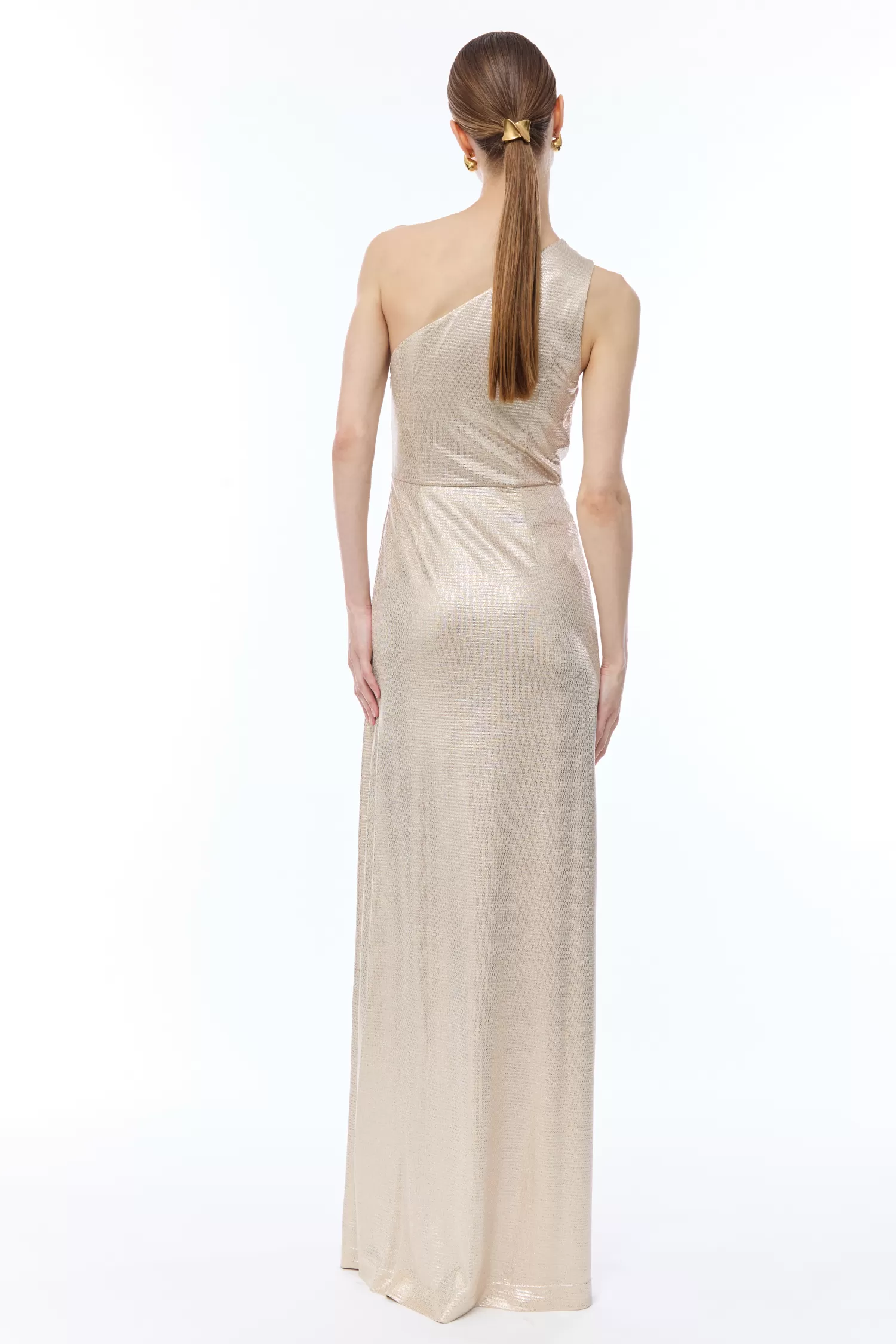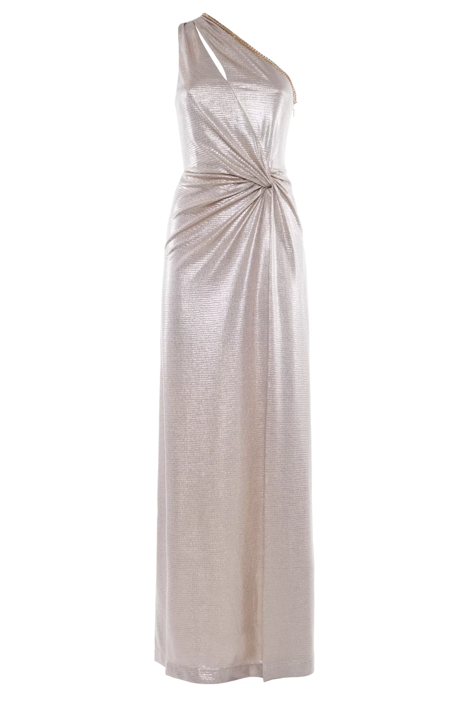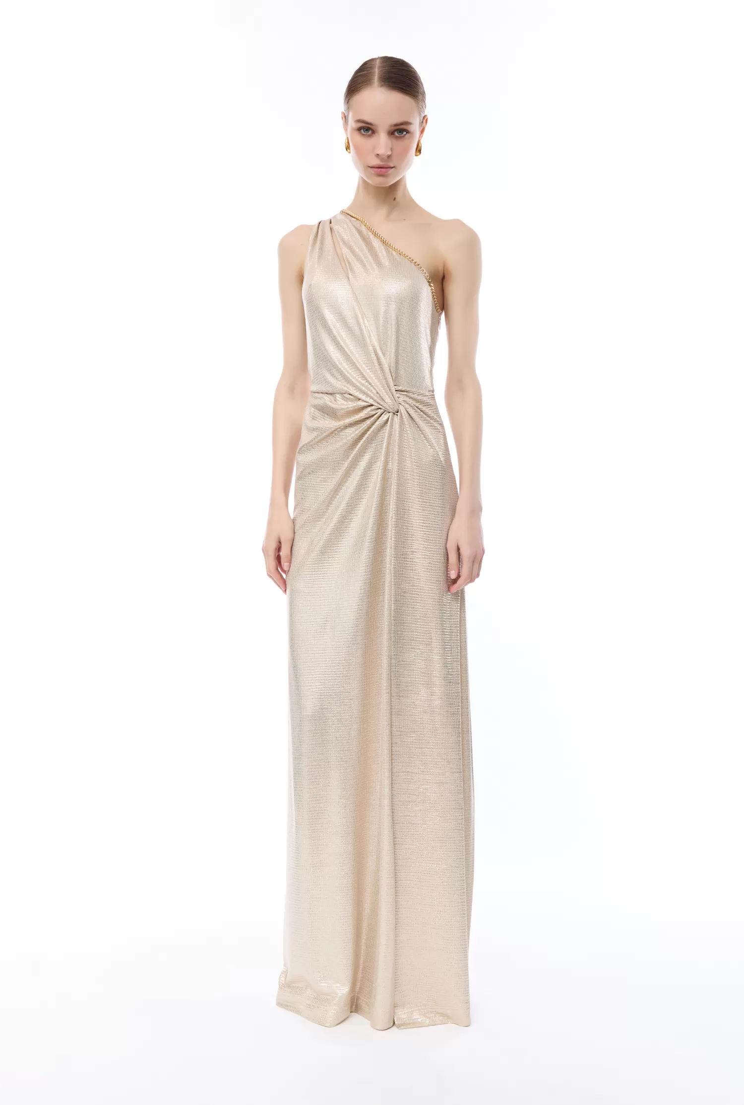 Abito in tessuto fluido metallizzato color champagne, dettaglio cut out e catena sulla spalla, nodo in vita con drappeggio morbido.