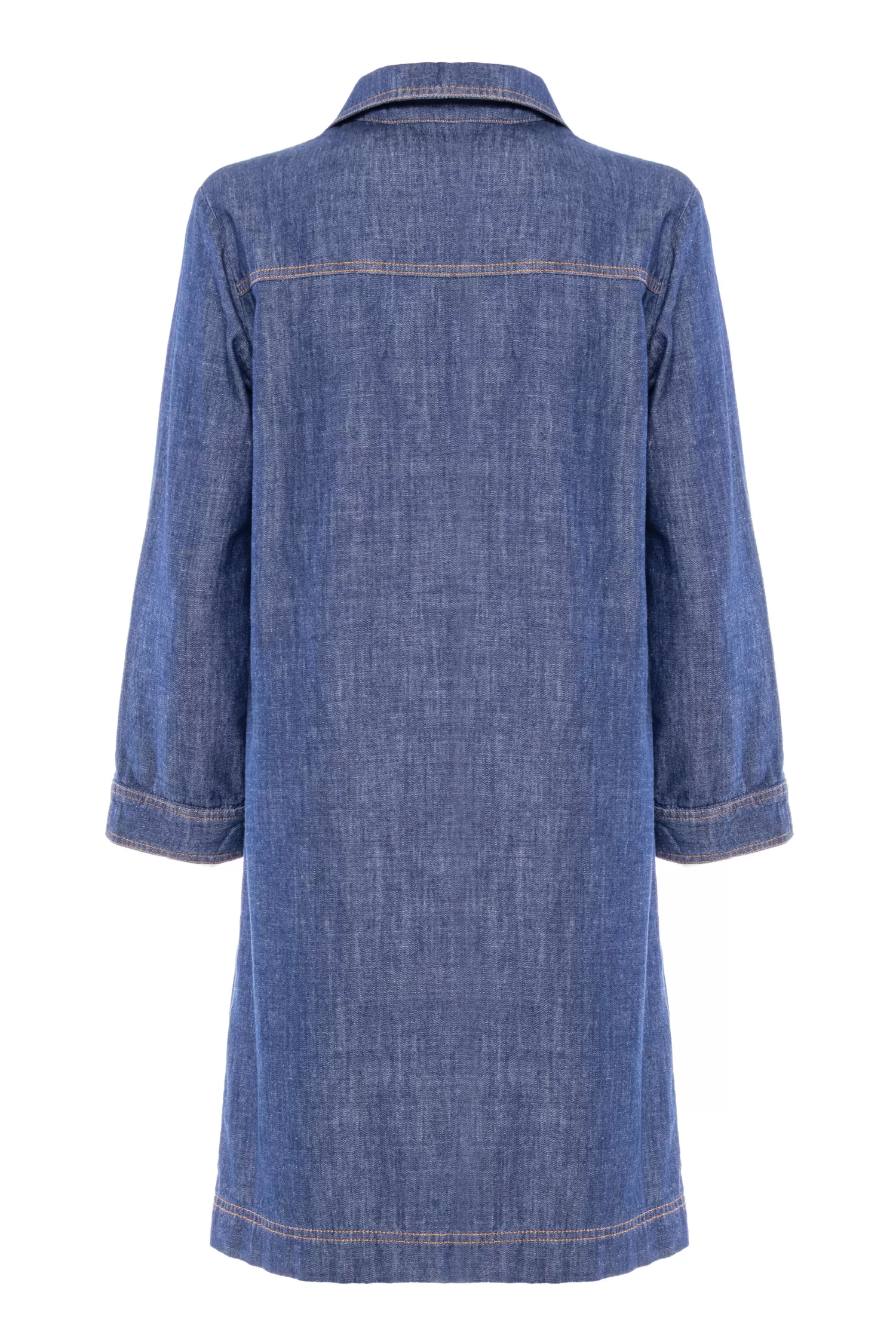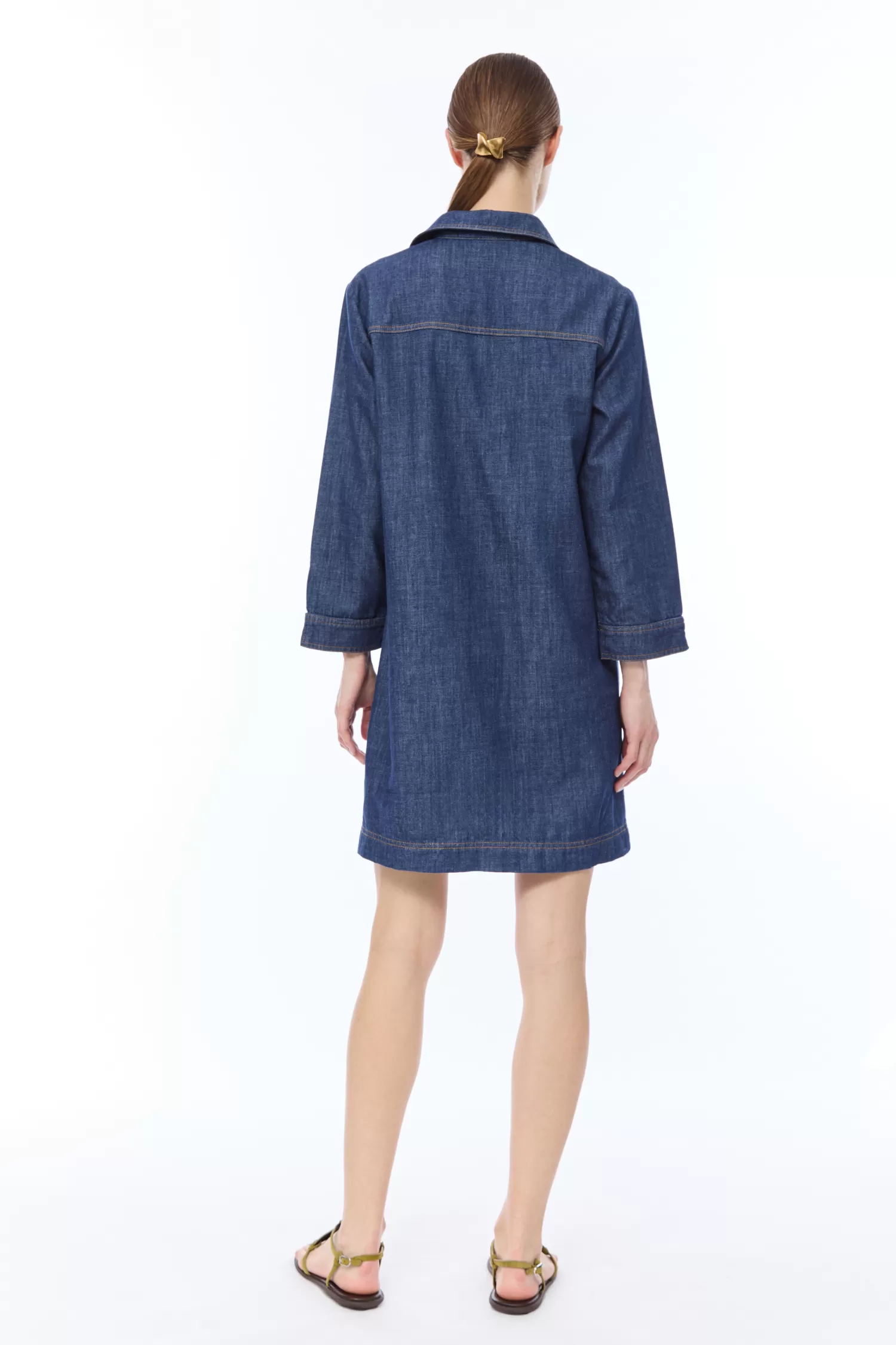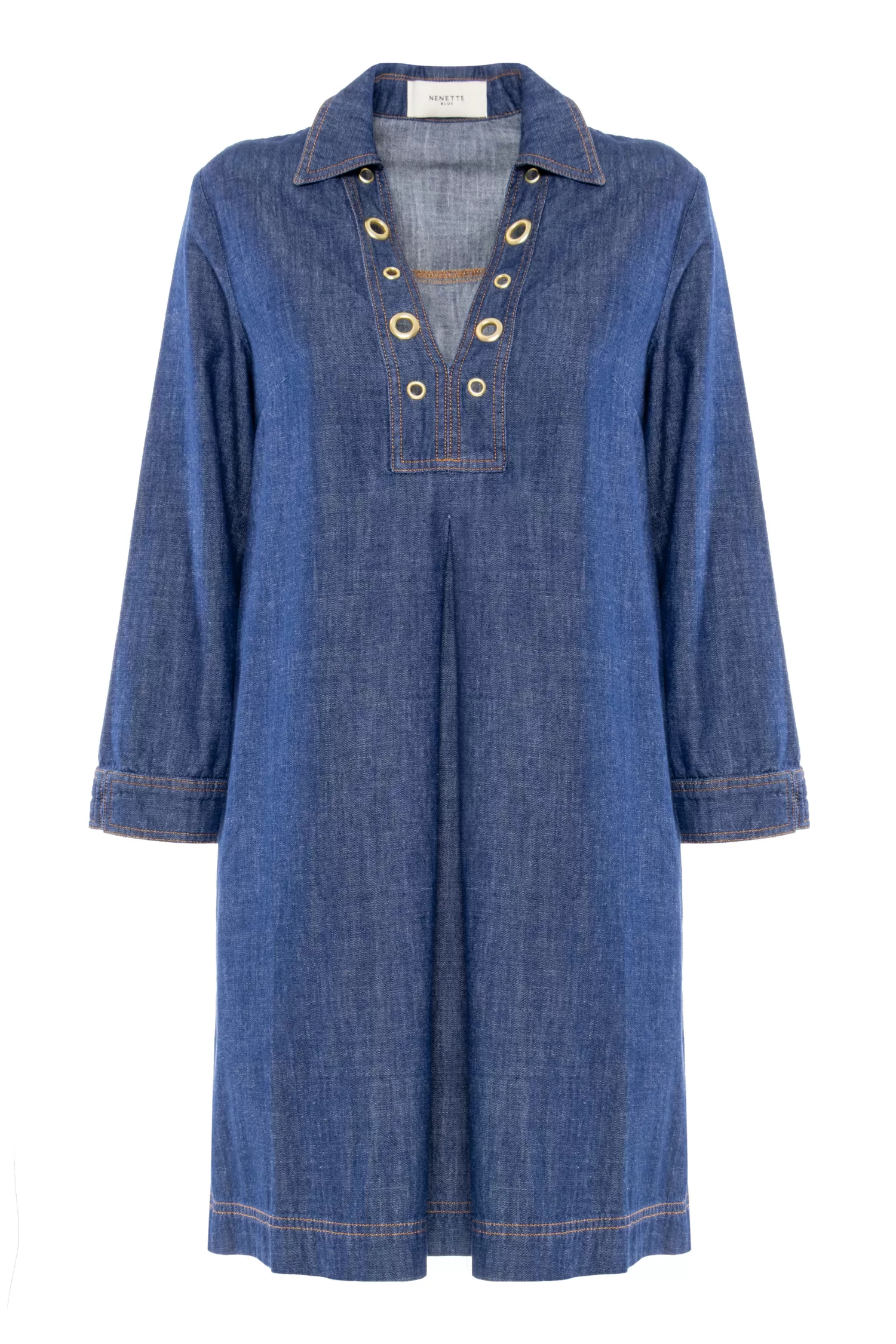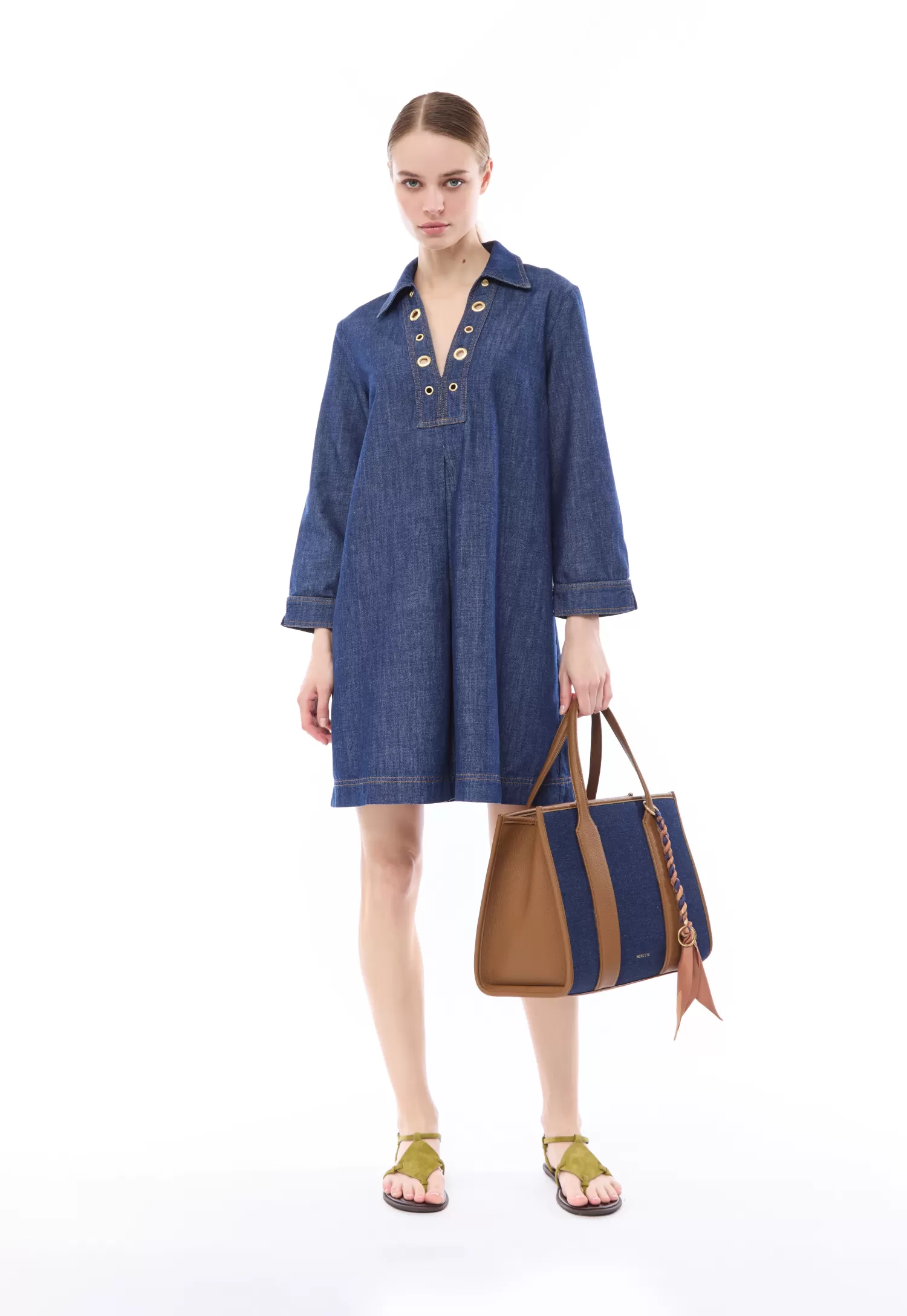 Abito corto in denim leggero con applicazini di vele metalliche.