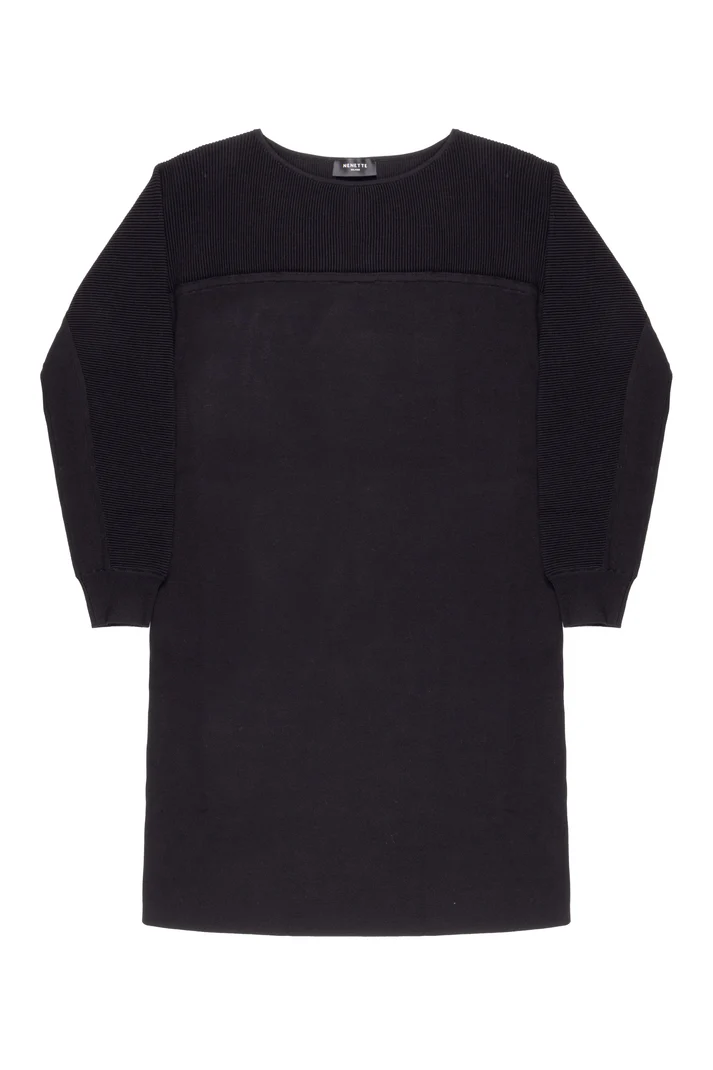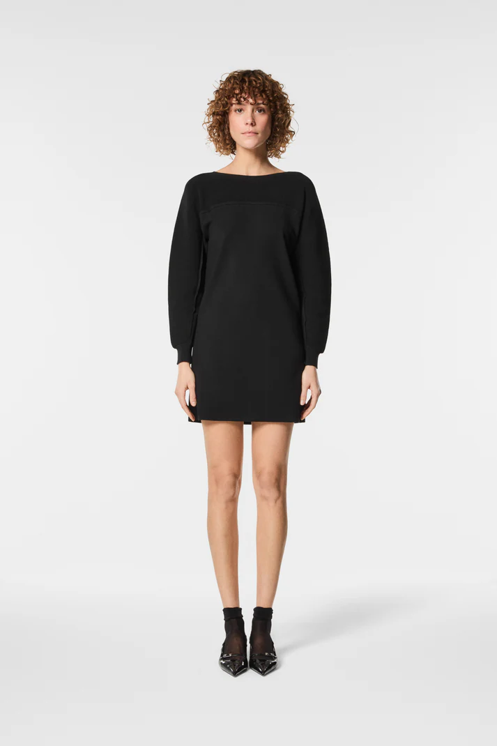 Abito corto a manica lunga, girocolo, taglio corto e minimalista.